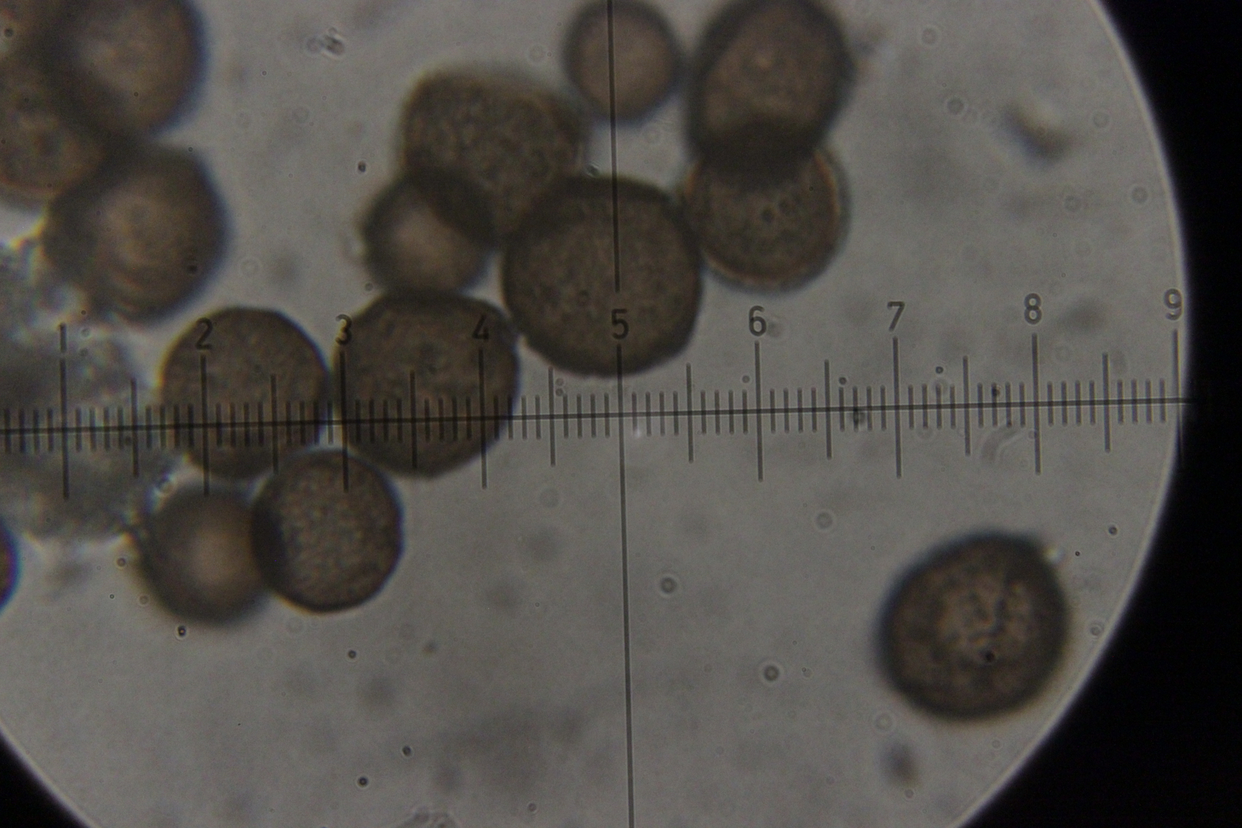 Nr. 5 war gestern Abend auch noch mal unterm Mikroskop. Zunächst einmal scheint er tatsächlich runde Sporen zu haben: