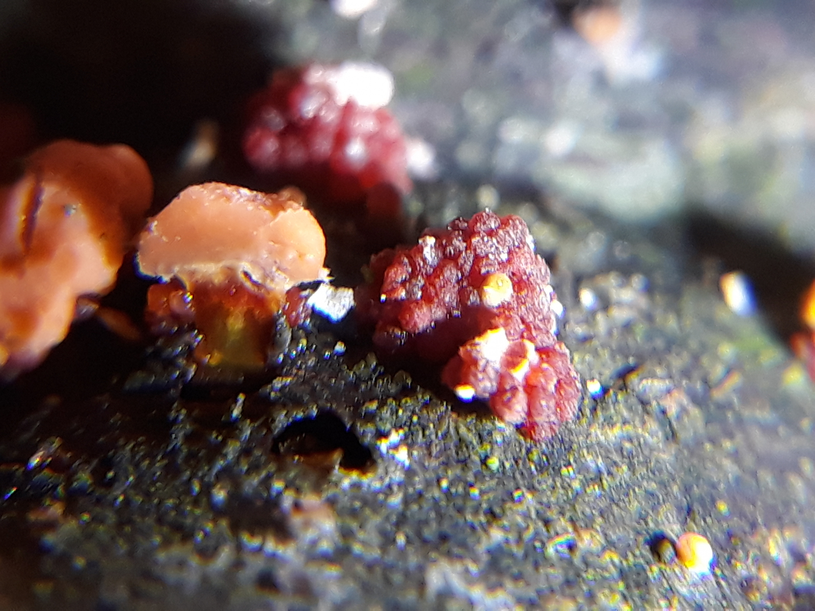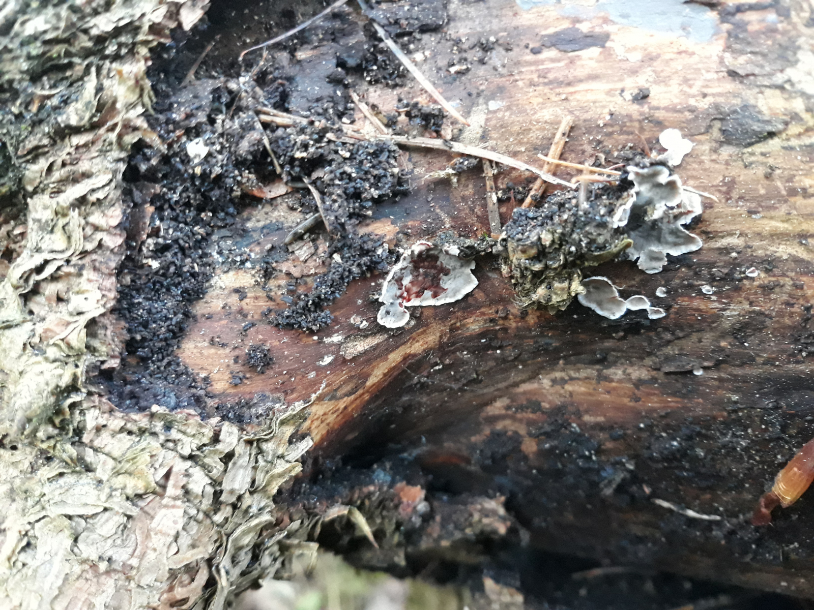 14 unter der Rinde hervorlugende Winzlinge, Hut vlt. 2-3mm und elendig zu fotografieren...