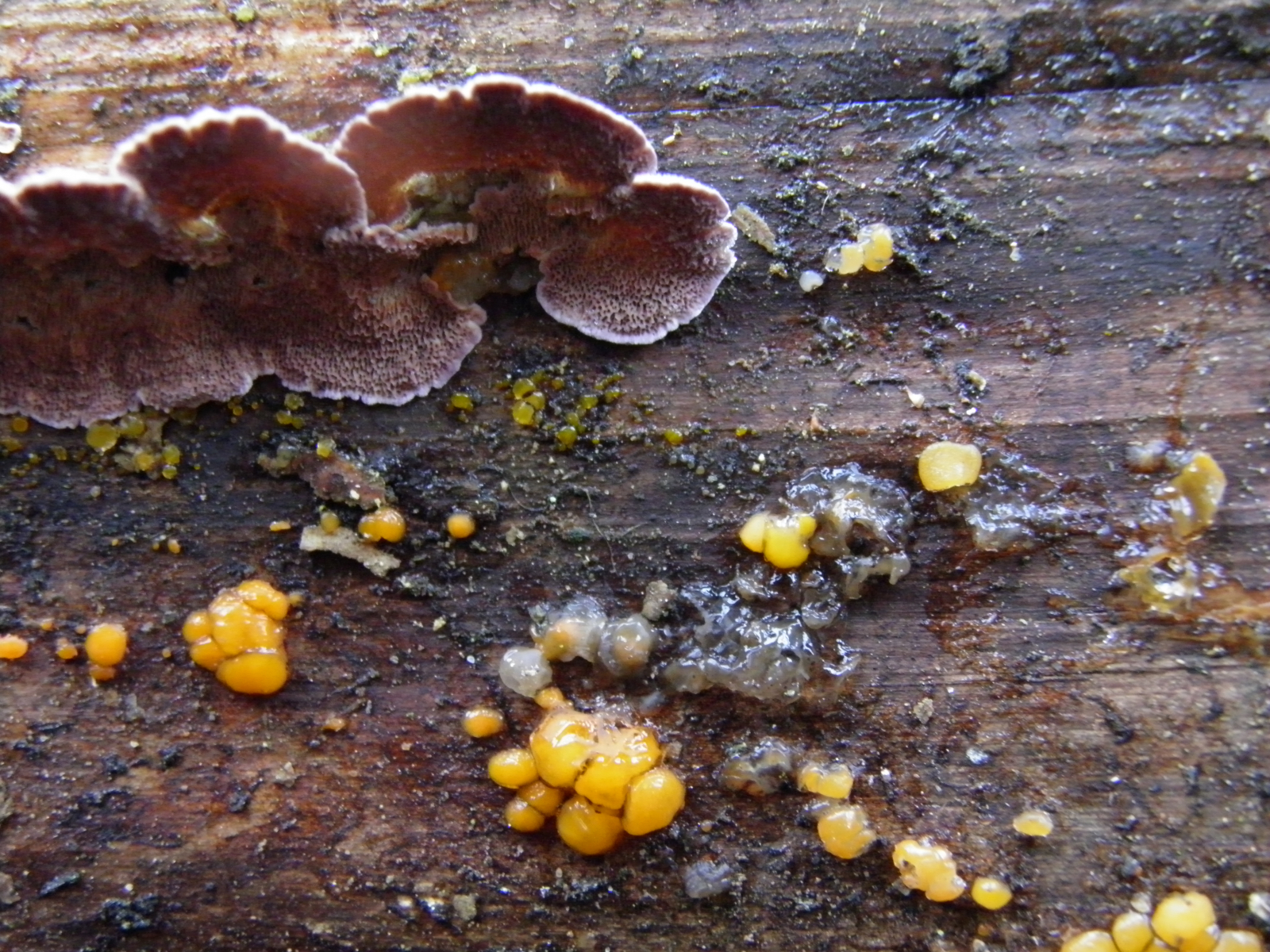 Pilz 3: Sieht nach einem Heterobasidiomyceten aus, so nach Bild. Wenn das auch Nadelholz ist, dann vielleicht irgendwas aus der Ecke um Exidiopsis grisea.