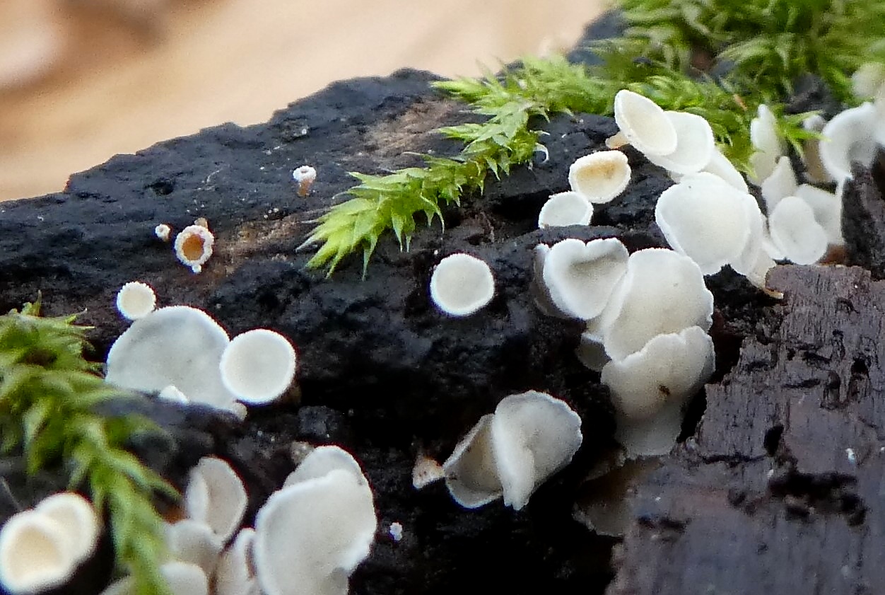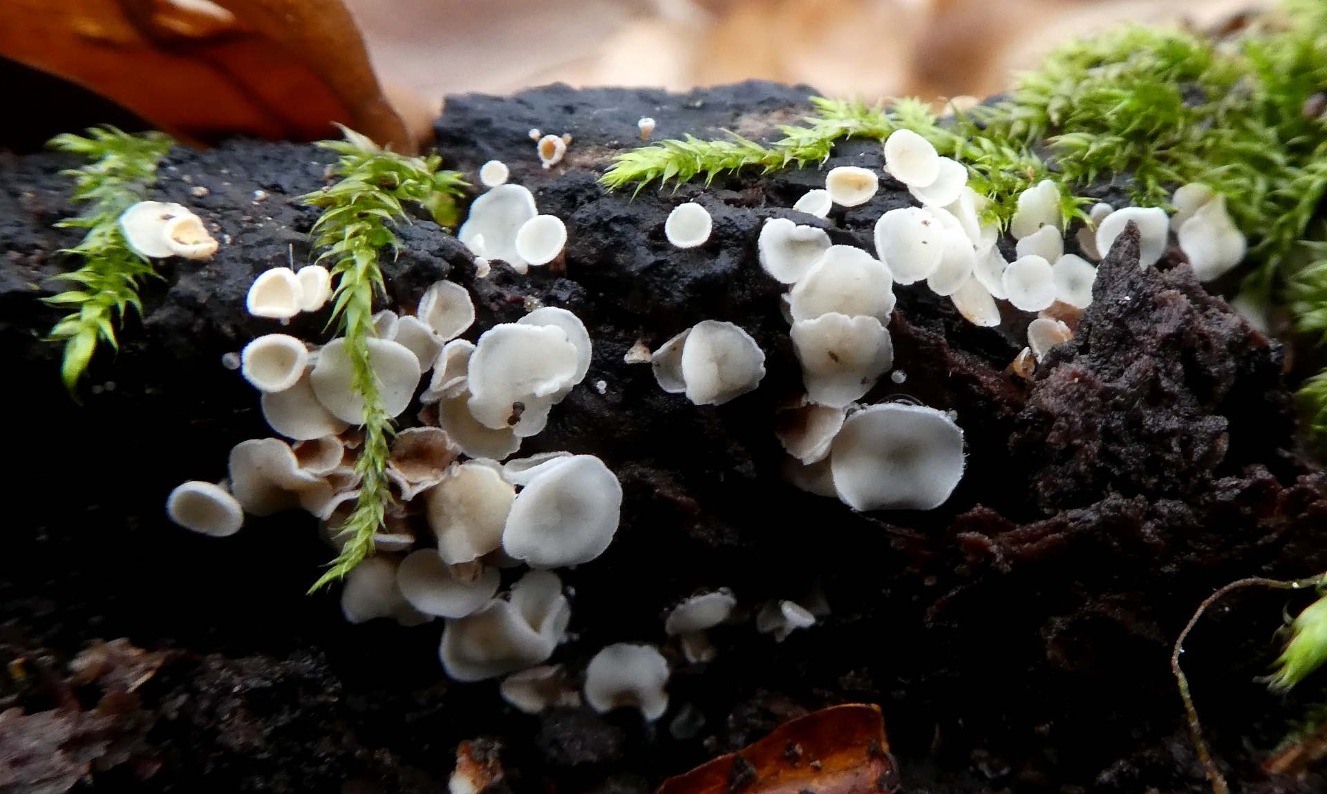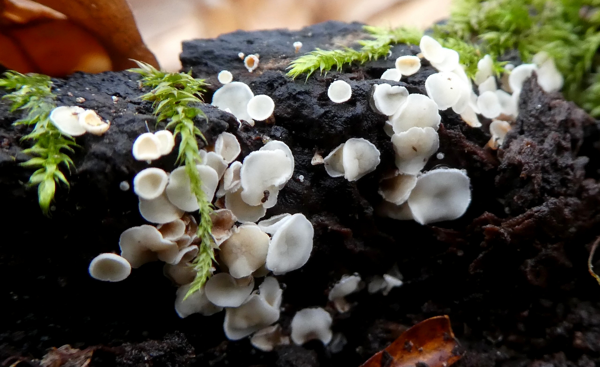 Ich habe ein kleines Stück Holz mit ein paar dieser Pilzchen mitgenommen, dieses allerdings mangels anderer Möglichkeit in einer kleinen Plastiktüte transportiert. Jetzt, vielleicht 2 Stunden später, hat sich die Farbe der Pilze ins gelb-orange verändert.