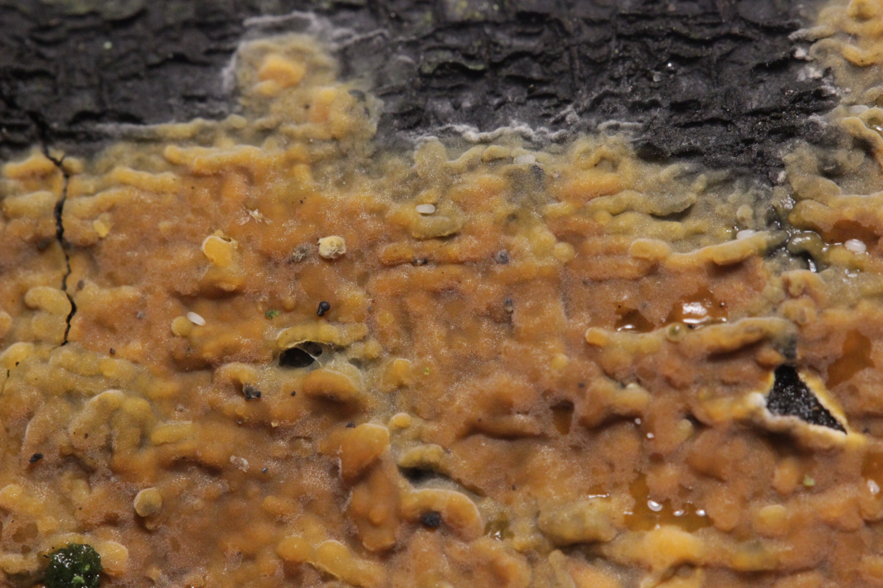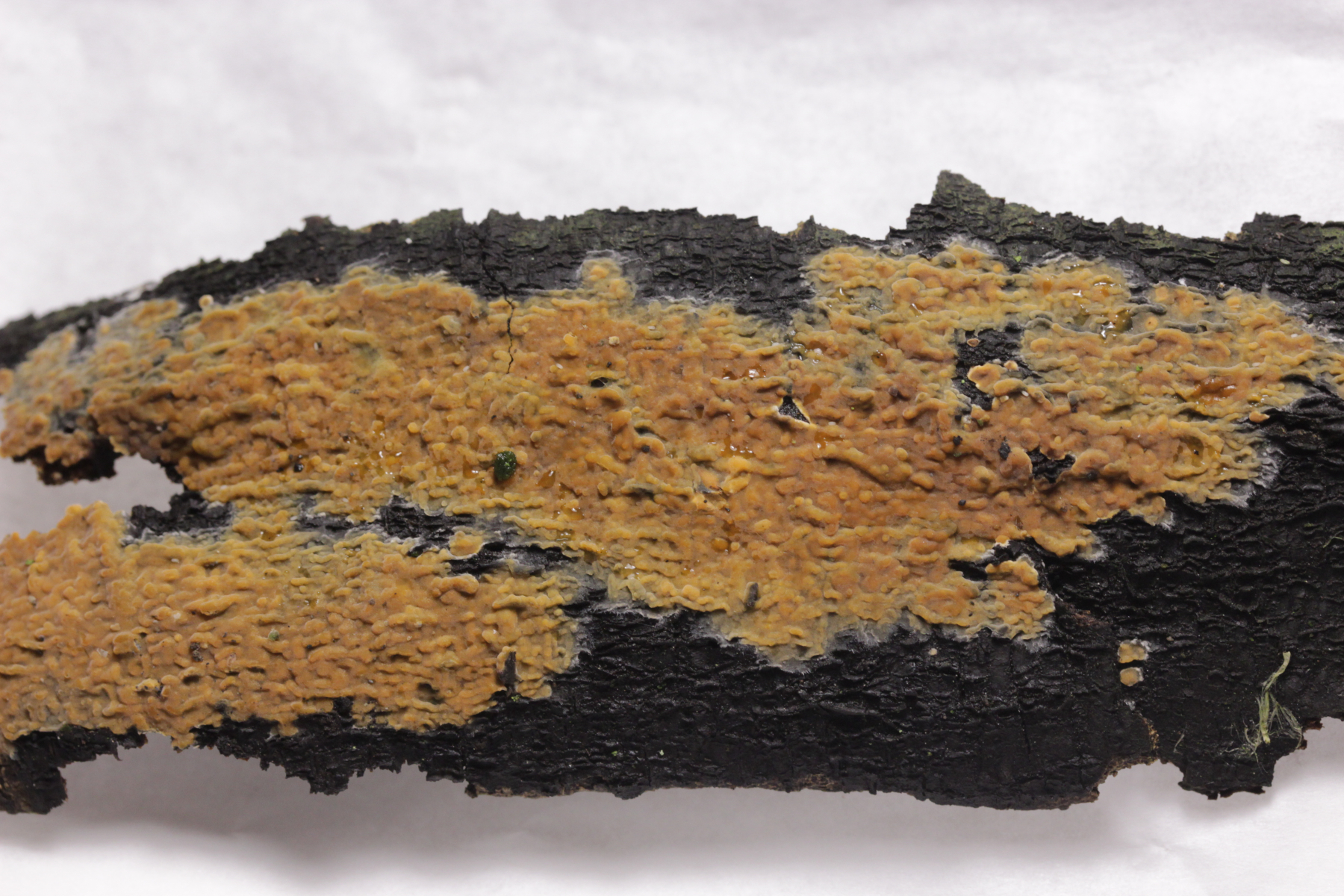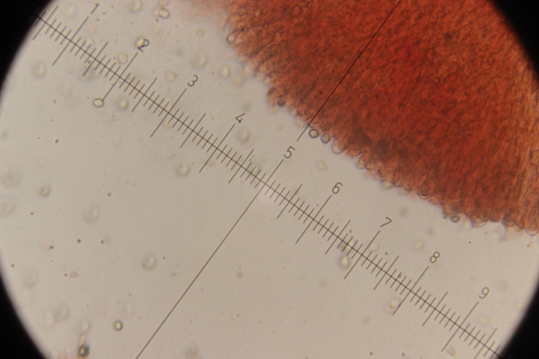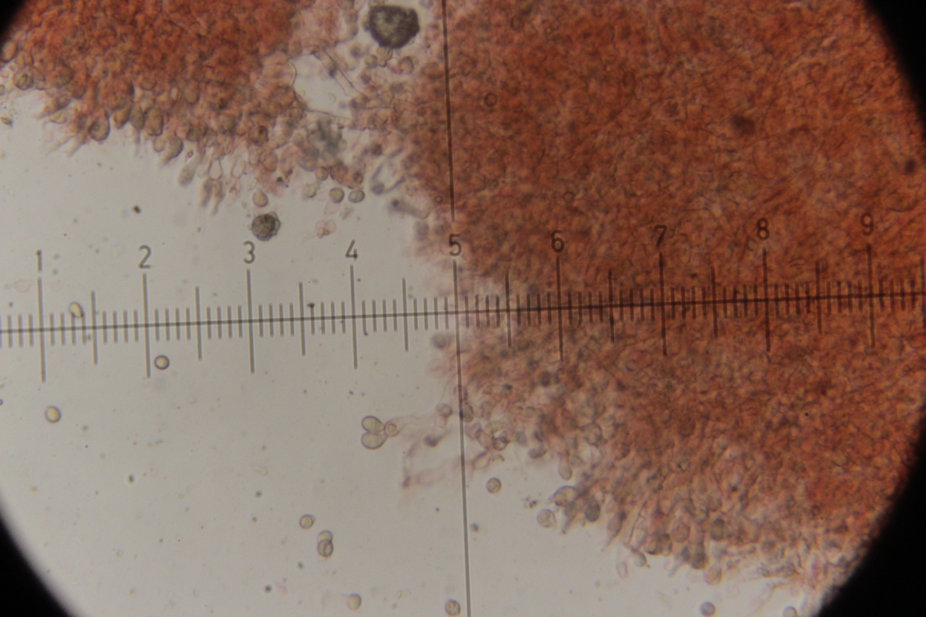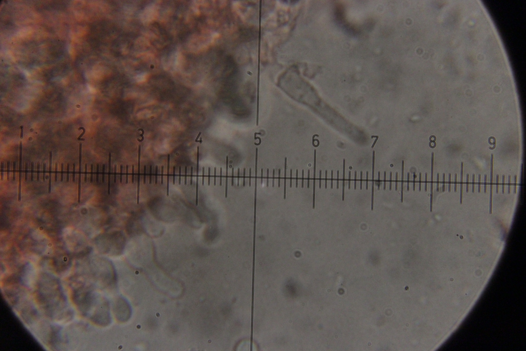 2. Eine Peniophora, die ich momentan mit einer Sporengröße von (9.3+-0.7) µm x (4.2+-0.4) µm und der rötlichen Farbe für P. incarnata halten würde. Ich will heute Abend aber noch mal schauen, ob ich auch wirklich Schnallen finden kann.