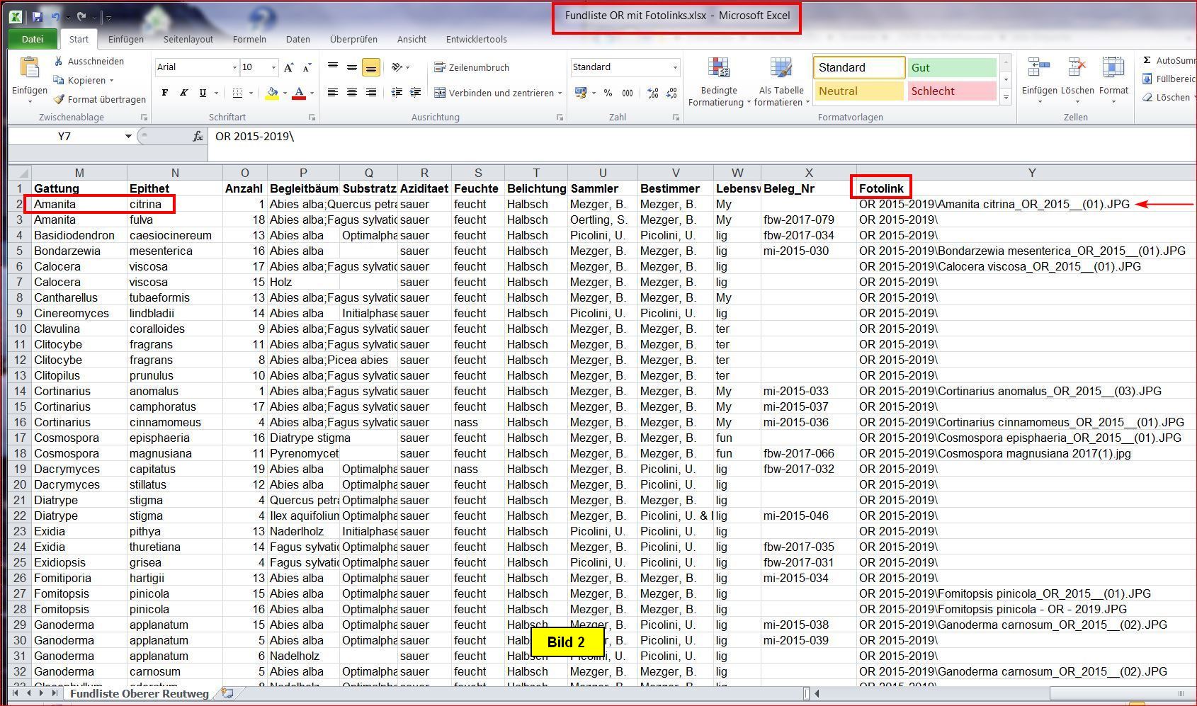 Wir öffnen die Fundtabelle aus Teil 13 Fundliste Oberer Reutweg.xlsx und vervollständigen die Spalte Fotolink. Das Ergebnis ist in Bild 2 zu sehen: