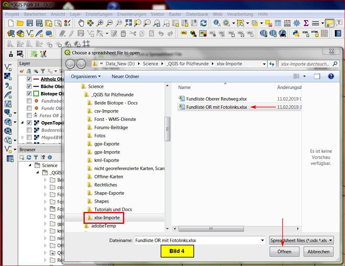 Die neue, vervollständigte Fundliste als neuen Spreadsheet Layer importieren, wie wir das aus Teil 13 bereits kennen, siehe Bildefolge 3-5: