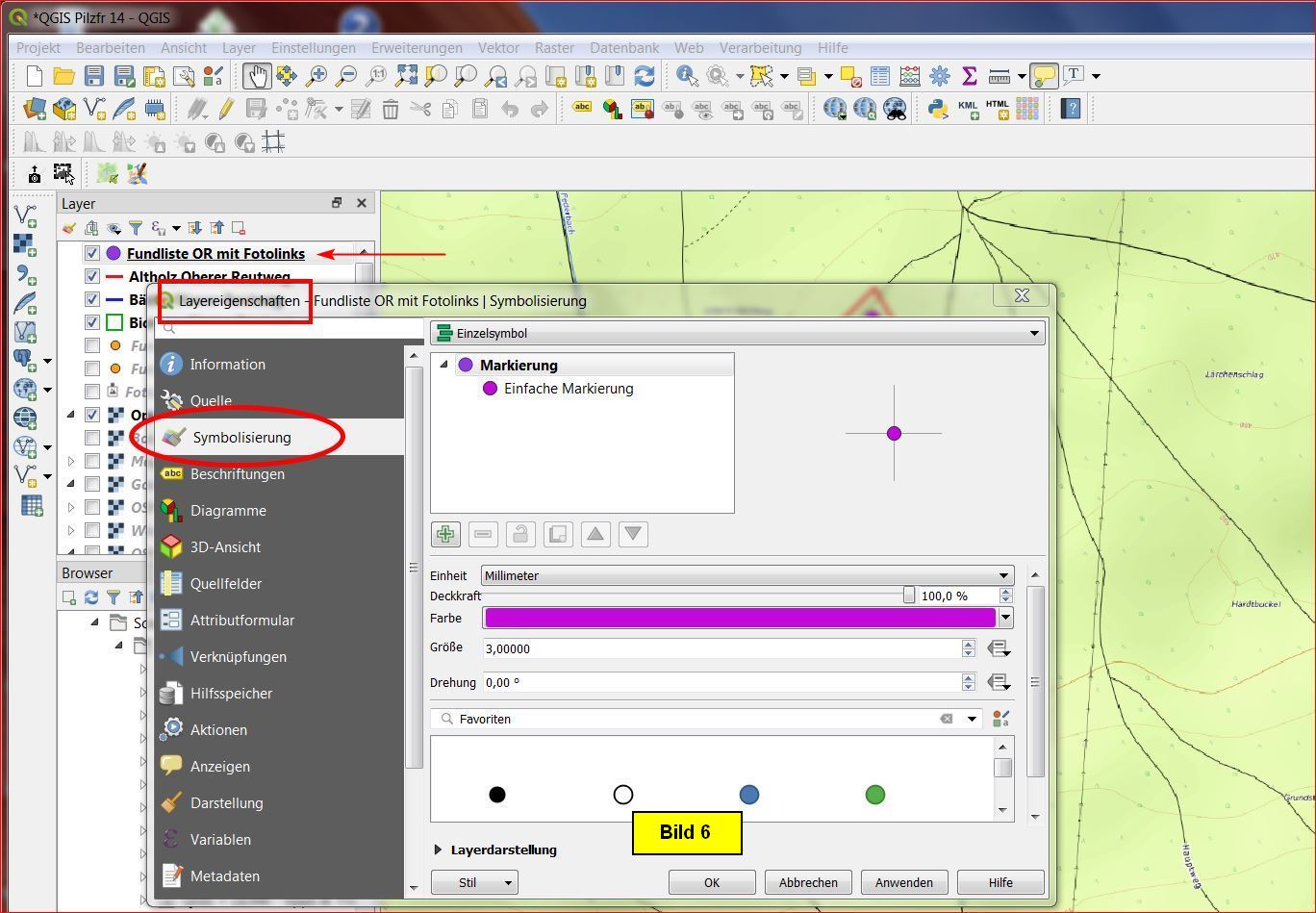 Das Ergebnis ist der neue Layer Fundliste OR mit Fotolinks, er ist aktiv und sichtbar geschaltet. Ein Doppelclick auf den Layernamen öffnet die Layereigenschaften. Wir selektieren das Untermenü Symbolisierung und wählen als Markierungen größere und farblich auffälligere "Punkte":
