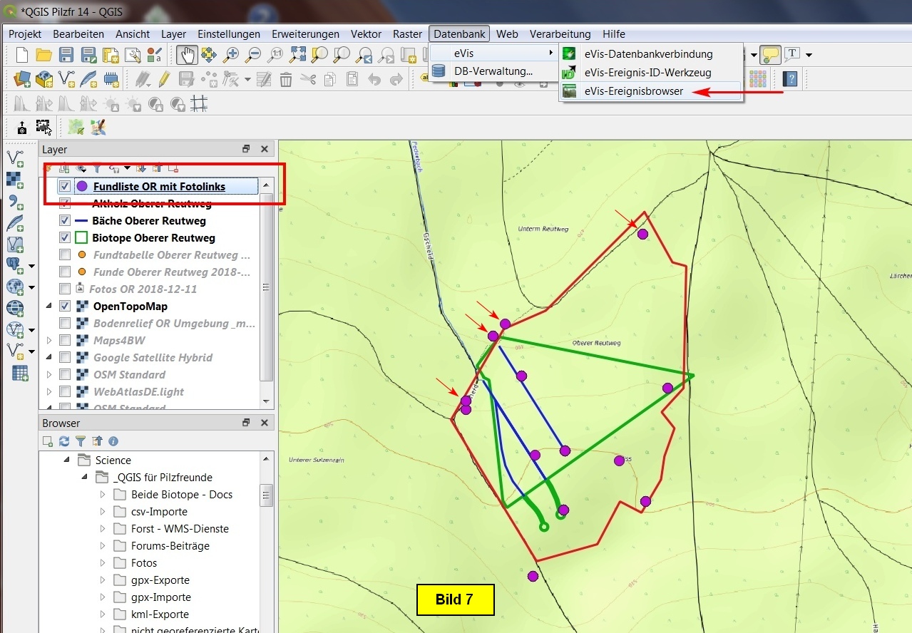 Bild 1 zeigt diese Fotos im Windows-7-Explorer. Man erkennt auch ihren Speicherort im PC. Vom gesamten Verzeichnispfad ist D:\Science\_QGIS für Pilzfreunde\Fotos\OR 2015-2019\. Davon soll D:\Science\_QGIS für Pilzfreunde\Fotos\ als Basisadresse dienen und \OR 2015-2019\ mit angehängtem Dateinamen als Fotolink aufgefasst werden. Beides ist wichtig für das eVis-Plugin. Beispiel für die erste aufgeführte Art: