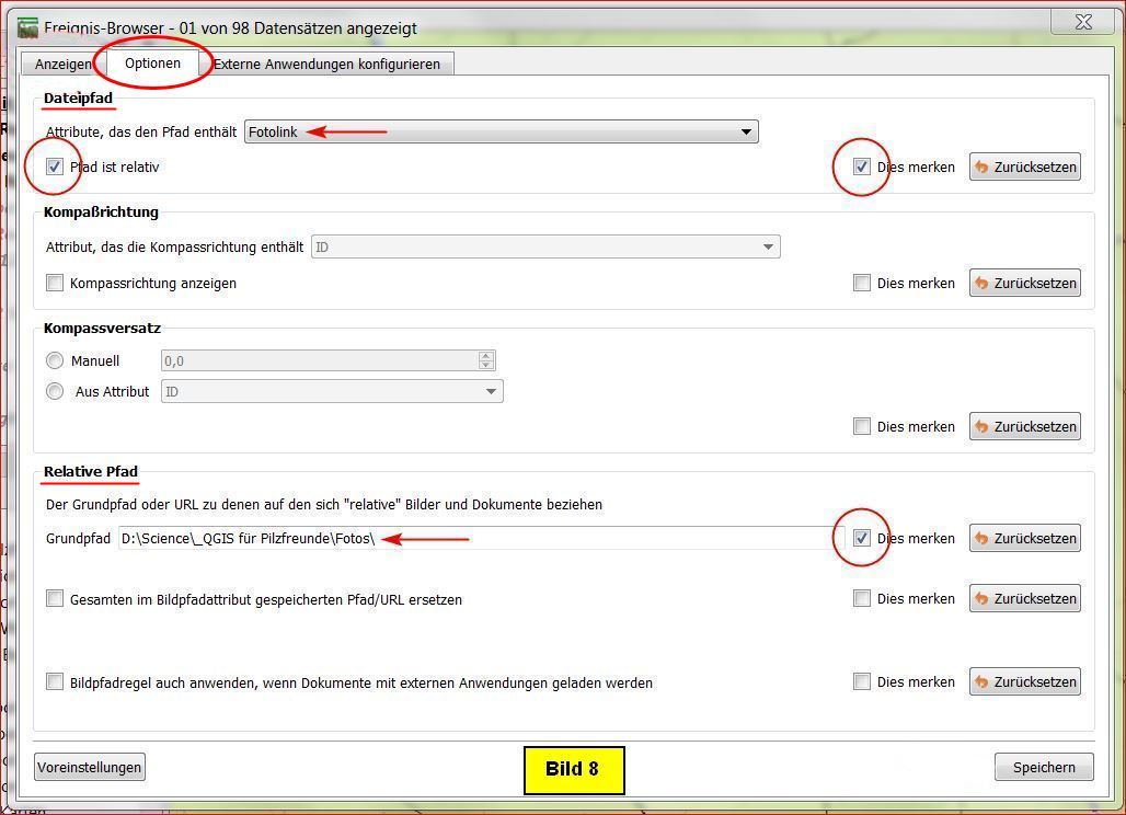 Unter Dateipfad selektieren wir die Spaltenüberschrift der Fotolinks, geben an, dass der Pfad relativ ist und dass eVis sich dies merken soll.