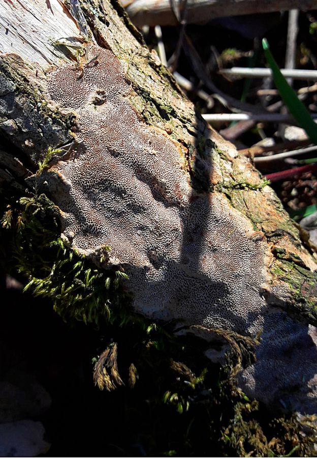 Der Porling für PIlznerds kann eine untypische (weil ganz resupinate) Braune Borstentramete (Coriolopsis gallica) sein, oder halt was Ausgefallenes. Ist nur nach einem Bild leider nicht zu sagen.