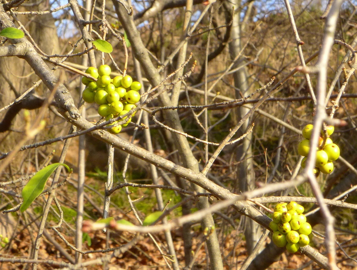 Und dann war da noch ein Strauch, bei dem ich gern wüsste, ob den vielleicht jemand kennt. Die Beeren haben ca. 0,5 cm Durchmesser. Einen Zweig mit einer Traube Beeren habe ich mitgenommen, falls weitere Untersuchungen etwas erhellen könnten.