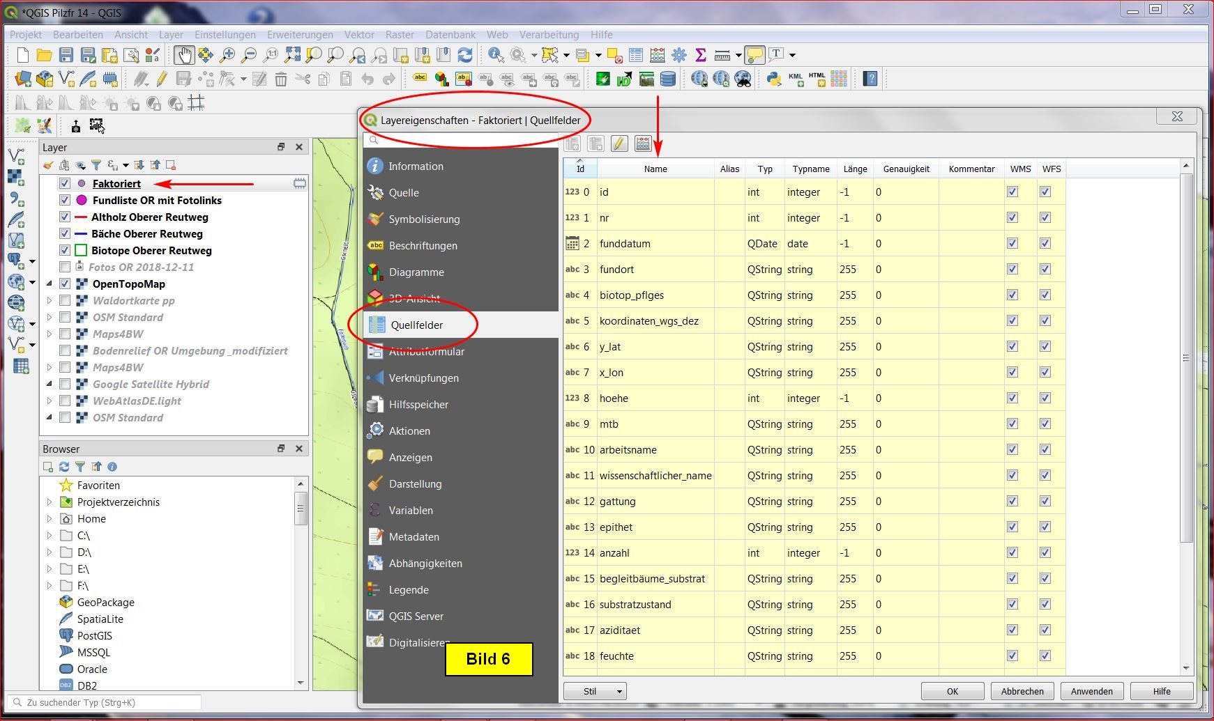 Als Ergebnis ist der neue Layer Faktorisiert entstanden. Zur Kontrolle doppelclicken wir im Layerfenster darauf und erhalten das Menü mit den Layereigenschaften. Wir selektieren das Untermenü Quellfelder - und wie zu sehen ist, wurden die modifizierten Feldnamen übernommen.
