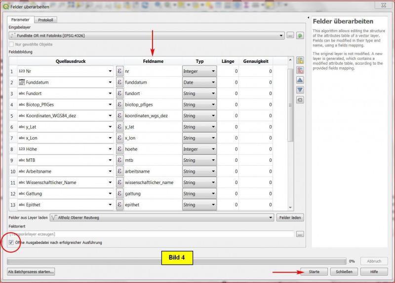 Es öffnet sich das Menü Felder überarbeiten mit der Attributtabelle (Bild 3). Hier können wir nun die Feldnamen ID, Nr, Funddatum ... manuell anpassen (mit Doppelclick auf den Feldnamen starten), so dass wir schließlich Bild 4 erhalten.