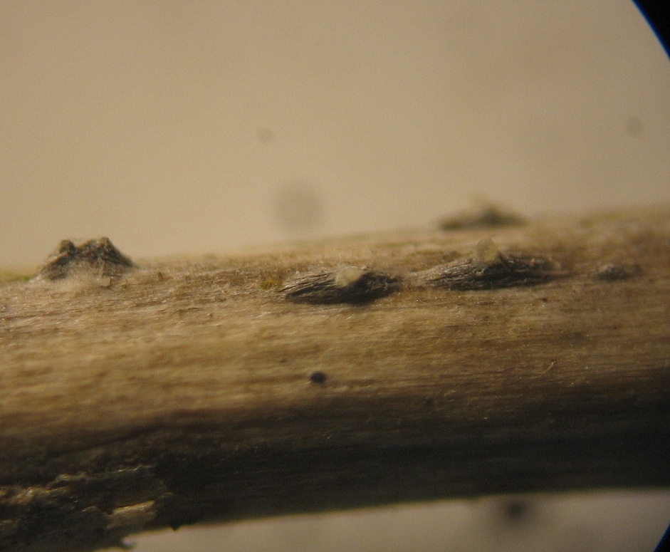 Perithecien braunschwarz mit deutlicher Ostiole durch die Rinde brechend