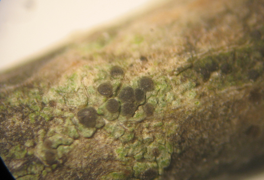 Apothecien ohne Rand, schwärzlich Lager grünlich