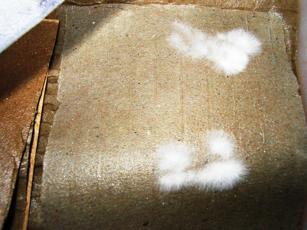Dein Mycel sieht schonmal gut aus. Laß es noch wachsen, bis es die Pappe fast oder ganz besiedelt hat. Dann kannst du dünn feuchtes Substrat auftragen.