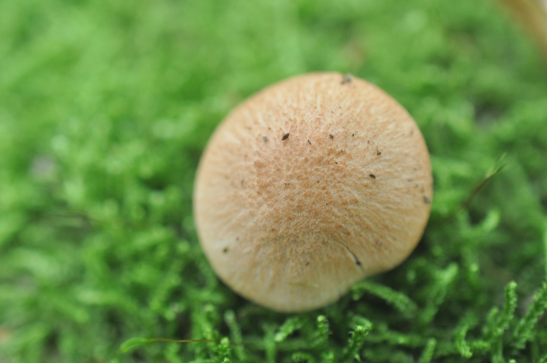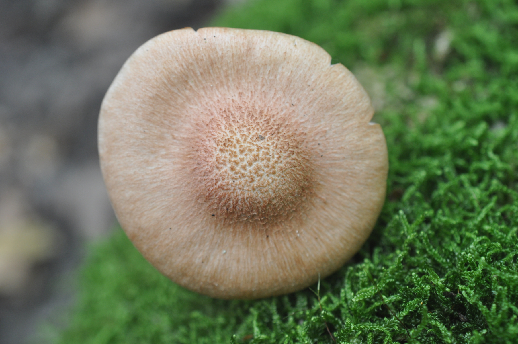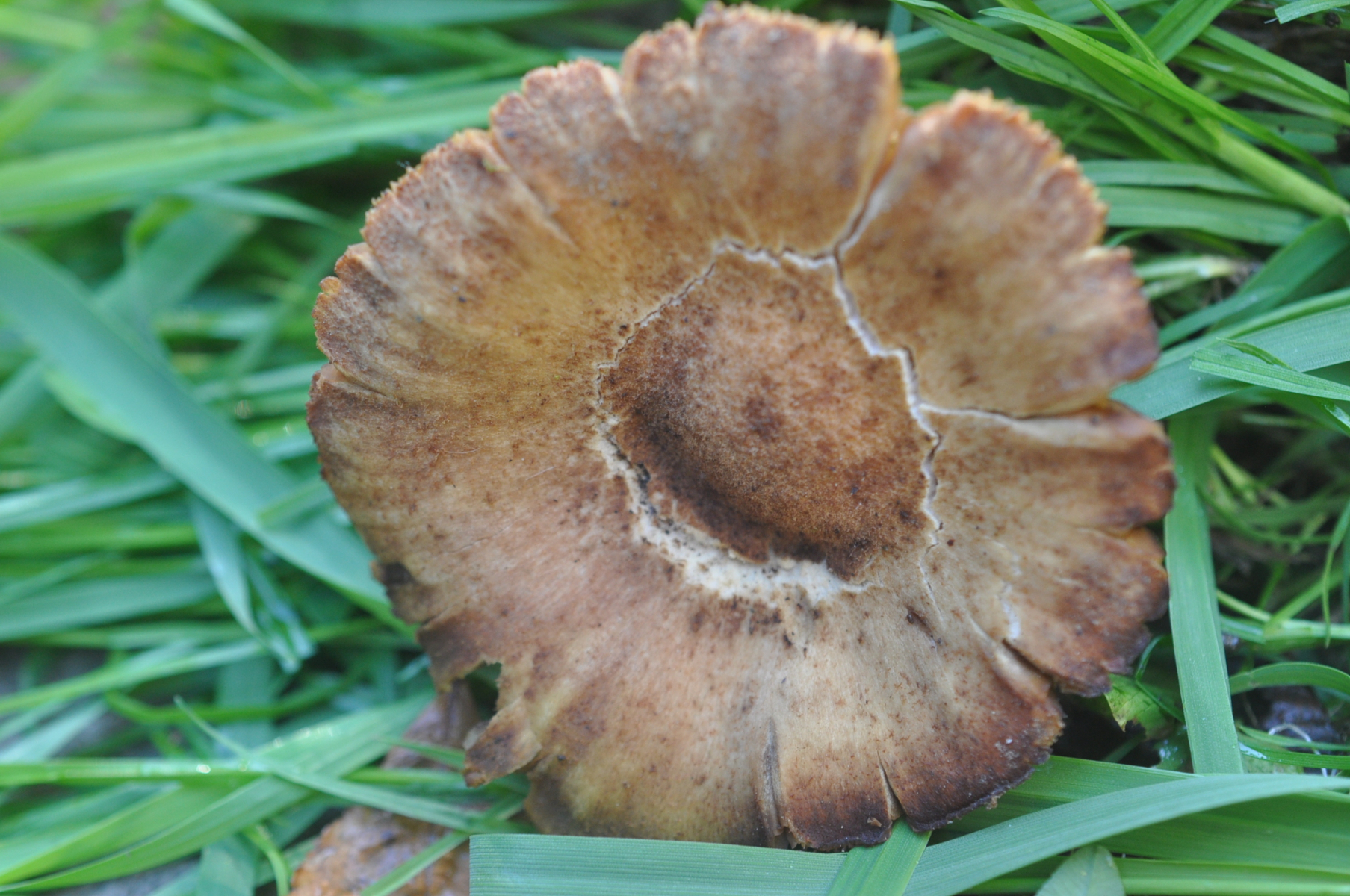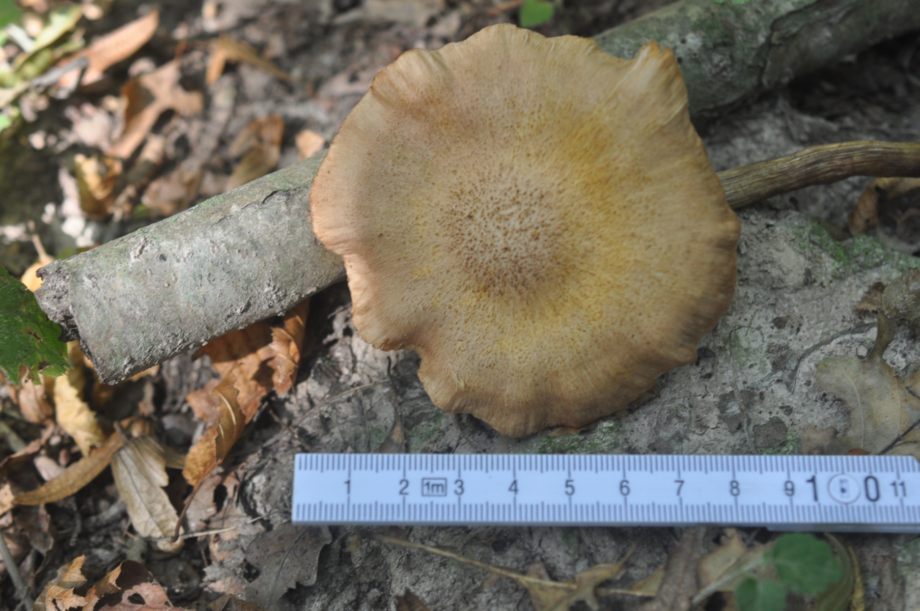 Hut : bis 10 cm Durchmesser , hell olivgelbe bis olivbraun in Alter hell Dunkelbraun mit feine braun weißliche Schüppchen . Rand blasser - verbogen meist etwas gerieft
