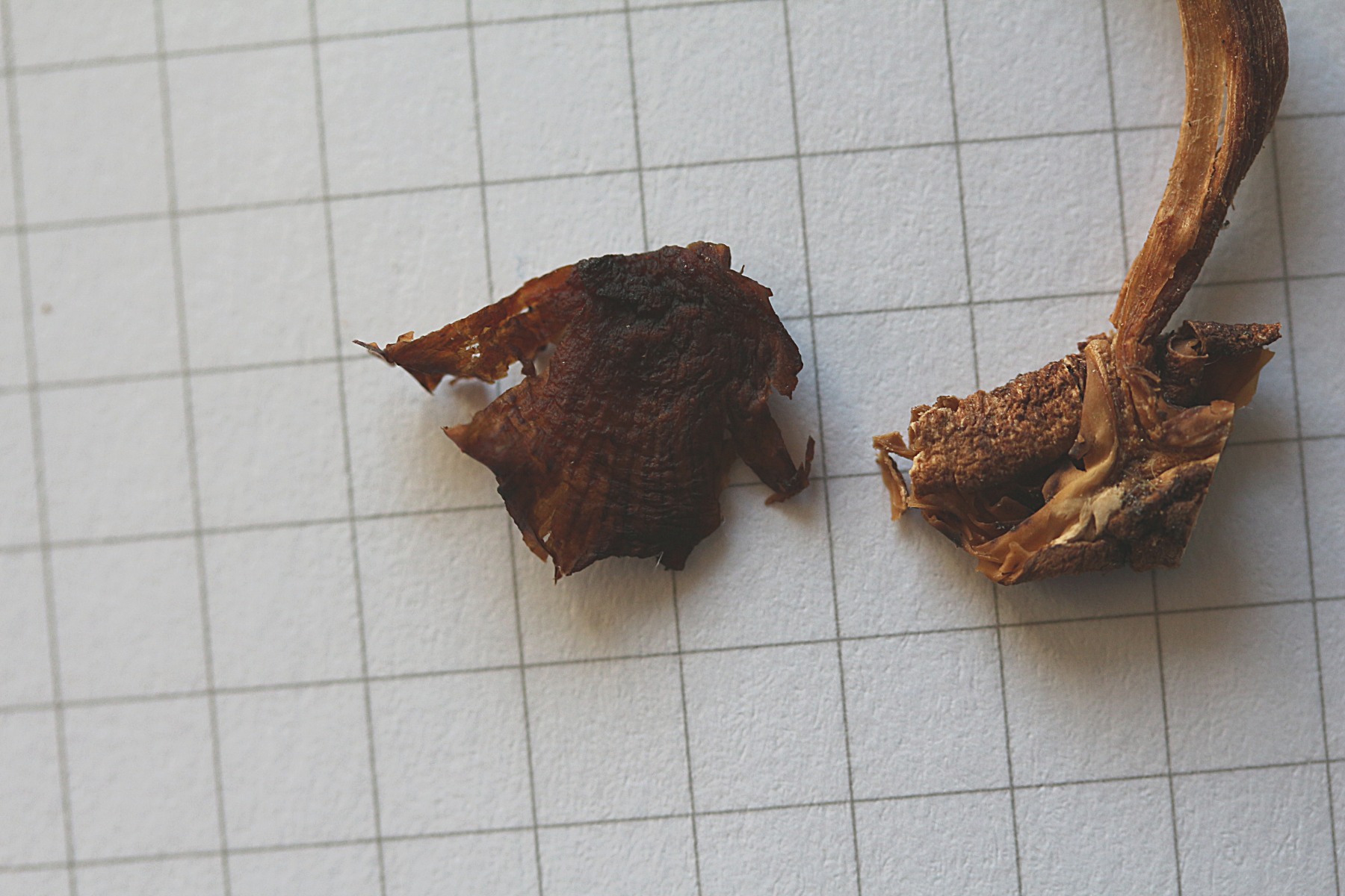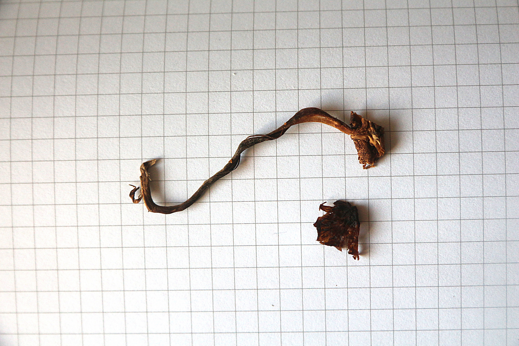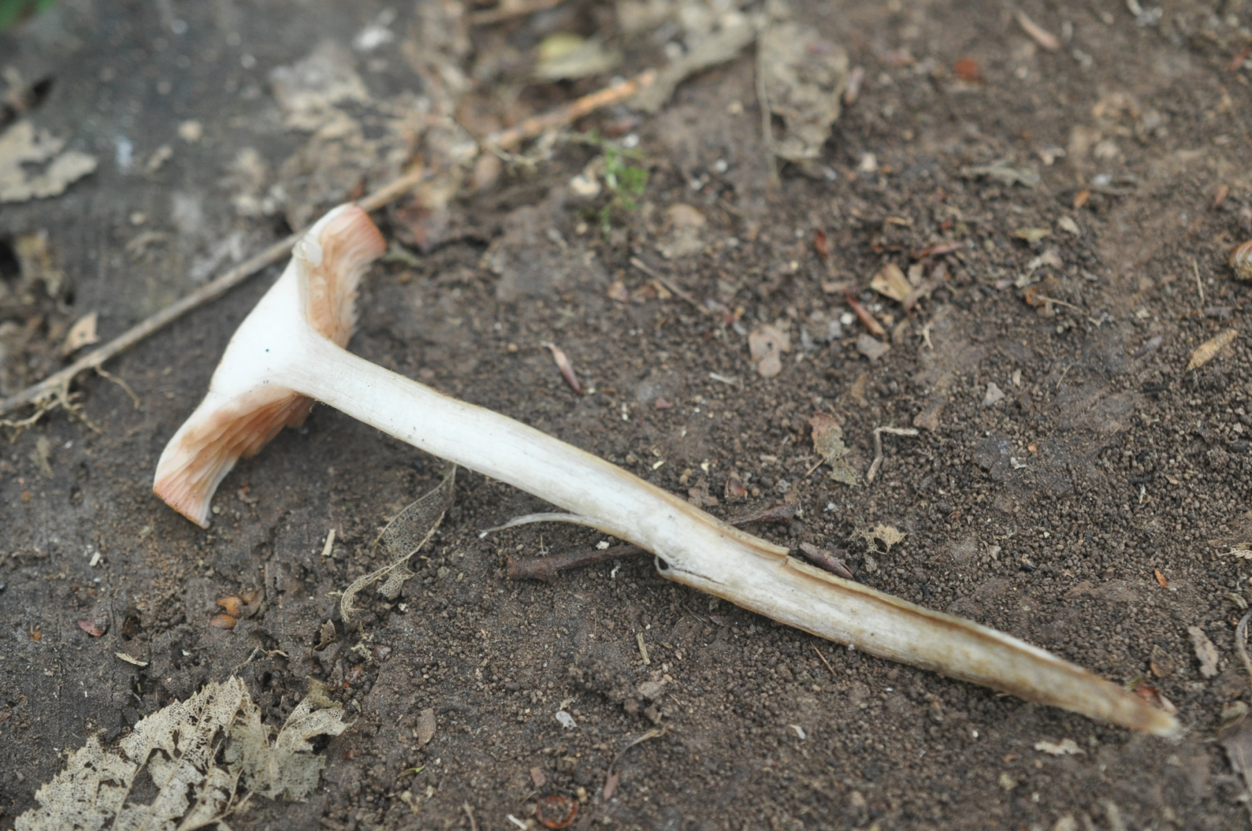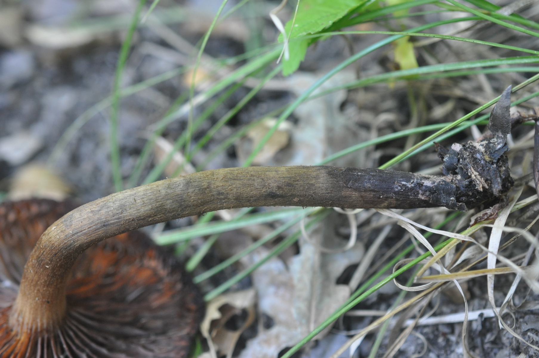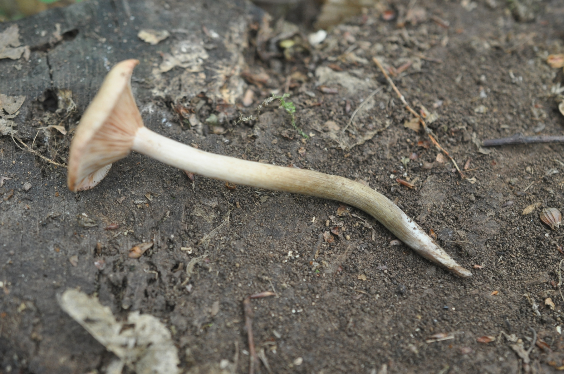 Stiel : bis 15 cm lang , Voll , zylindrisch mit feinen Rillen , etwas feine braune Schüppchen ohne Ring , sehr Zäh , weißlich bis bräunlich , Basis und spitze heller