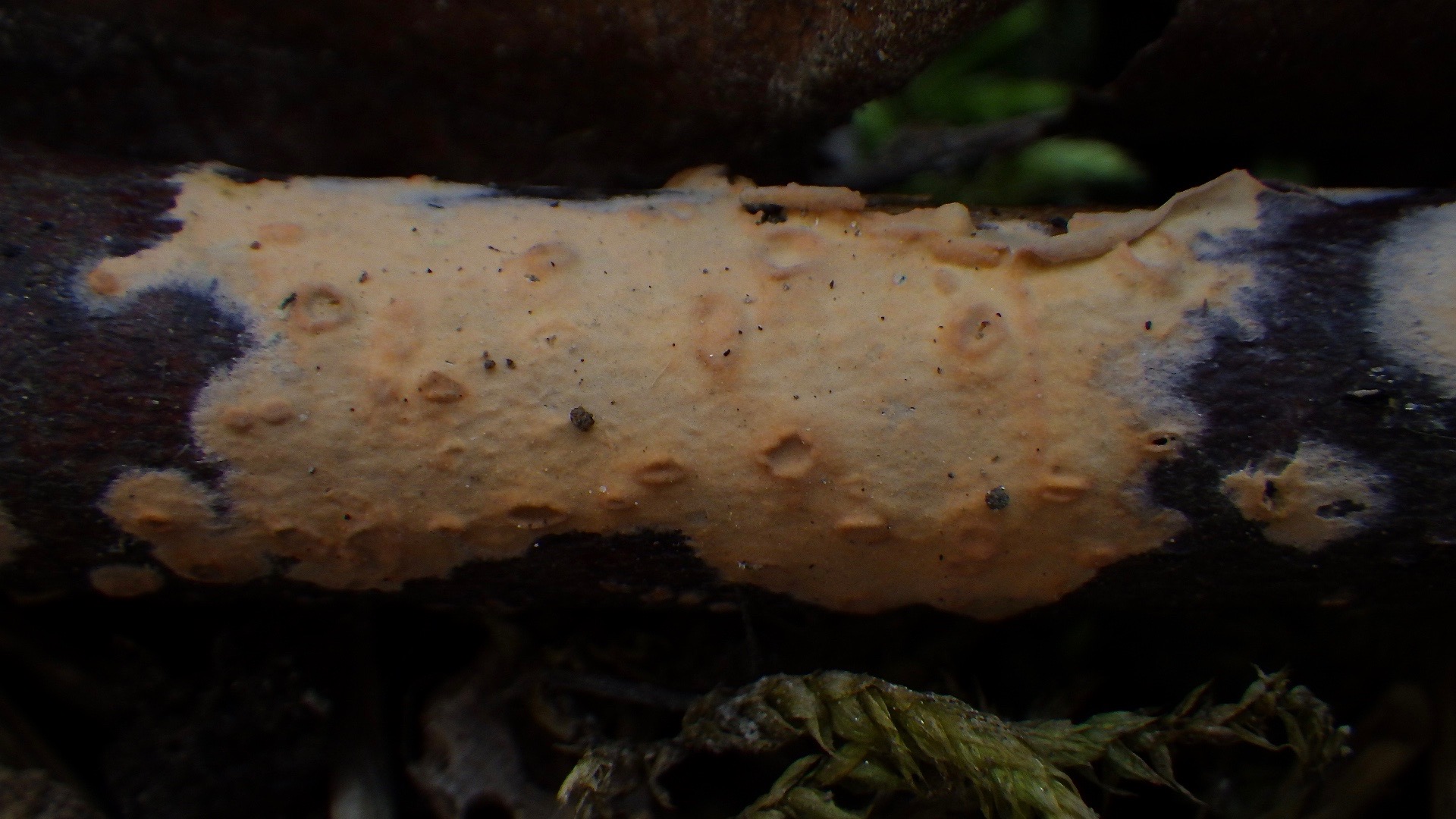 Habe unteren fast orangen Schichtpilz-artigen Totholzpilz in unserem Garten in Hägglingen CH 510m auf einem Asthaufen gefunden. Ist es eine Zystidenrindenpilzart? Welche? Kann es auch in Richtung Schichtpilz oder Kammpilz gehen?
