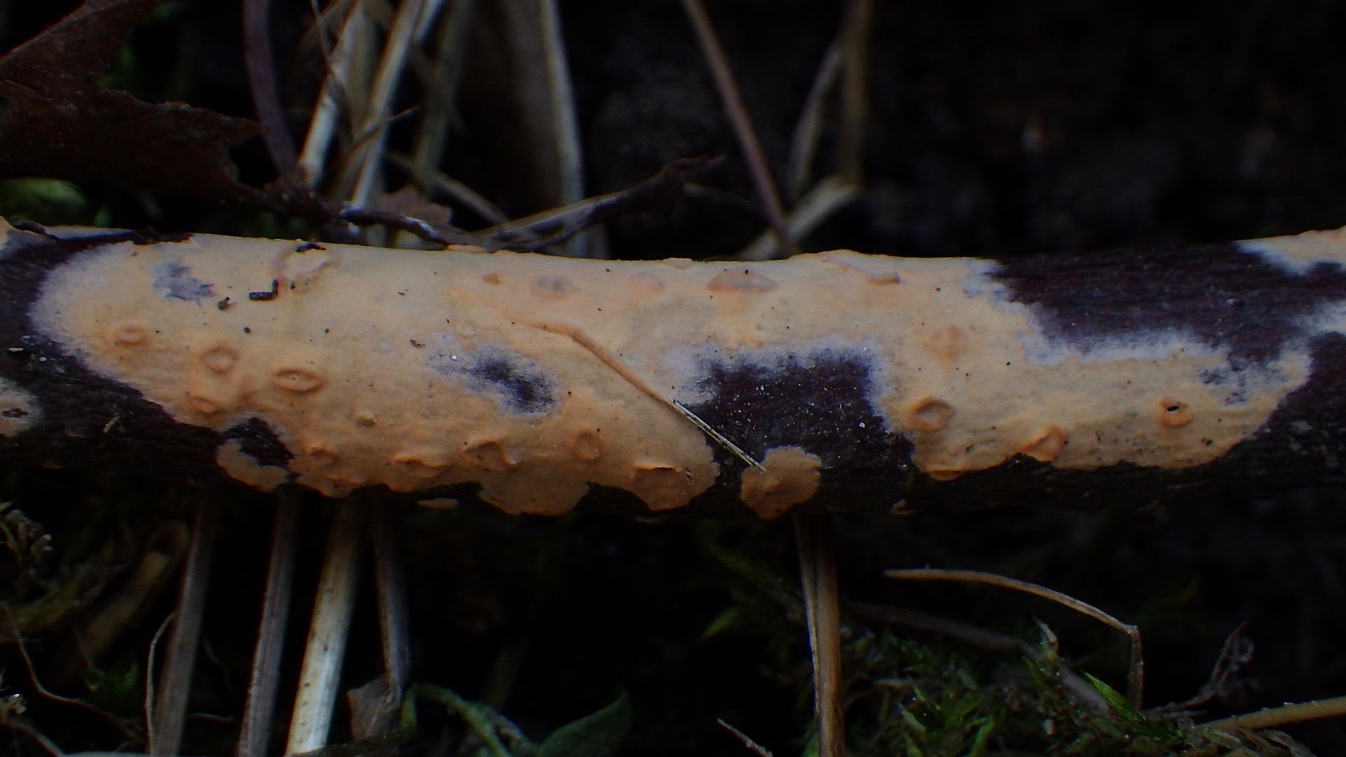 so rein makroskopisch würde ich deinen Fund Peniophora incarnata sagen. ;)
