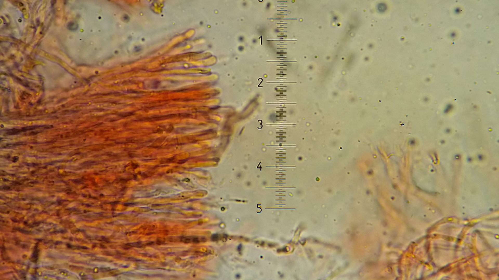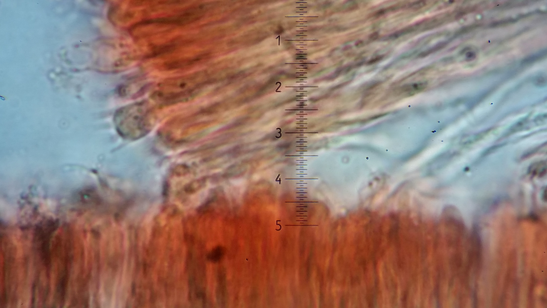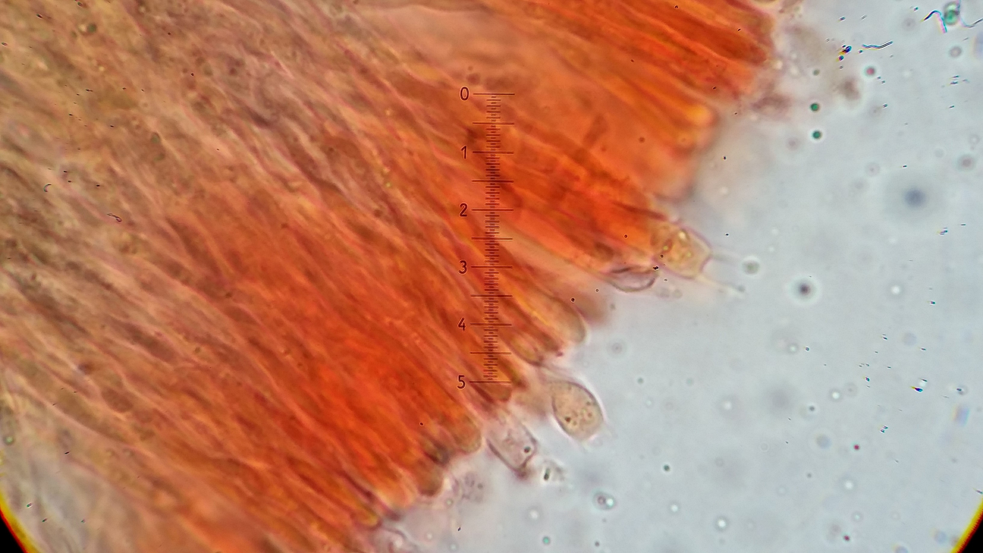Das Hymenium besteht aus eine eine dichte Palisade von Basidien und Hyphen, manche sind apikal aufgeblasen andere haben so eine Nase wie hier in Bild.