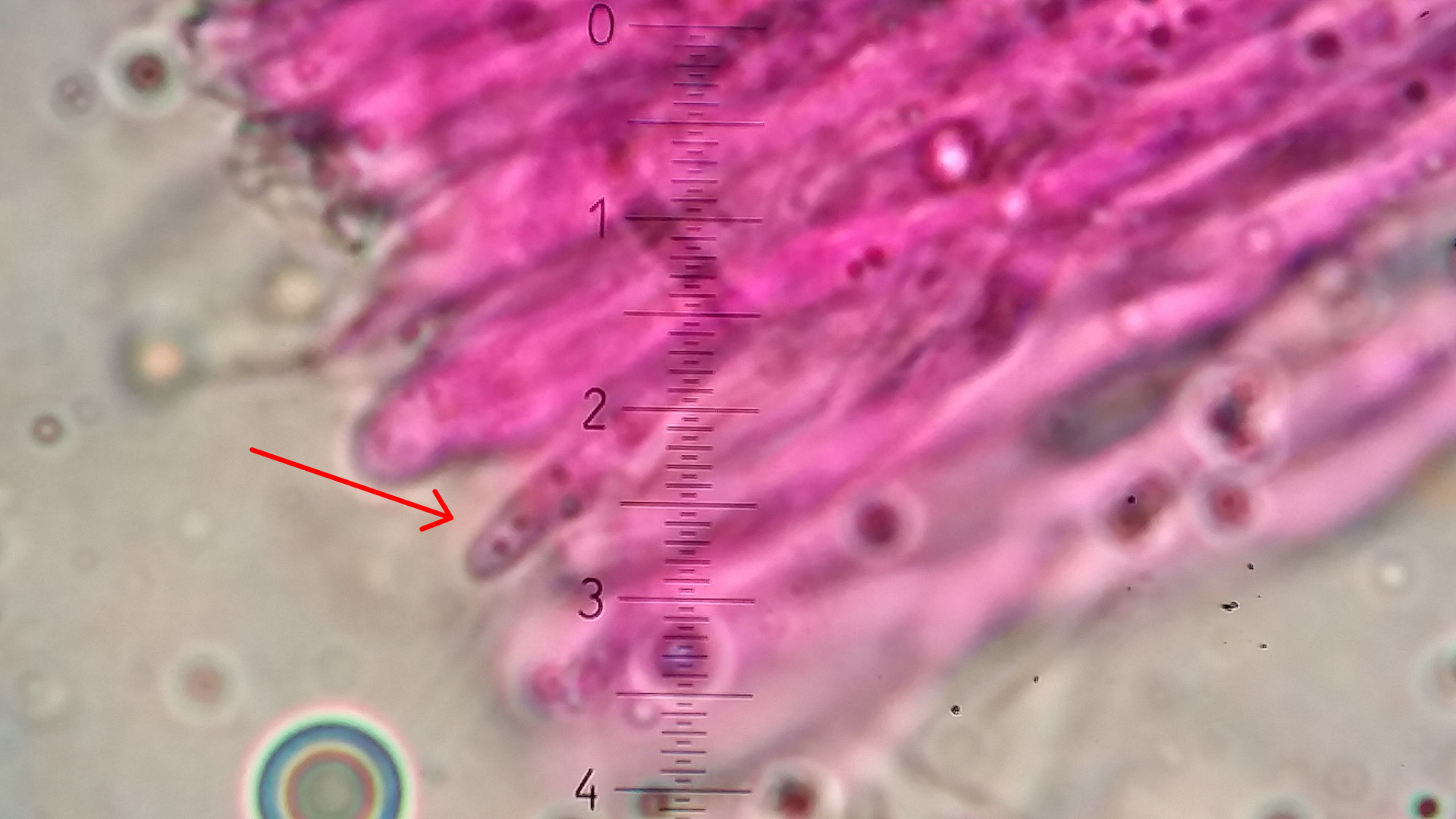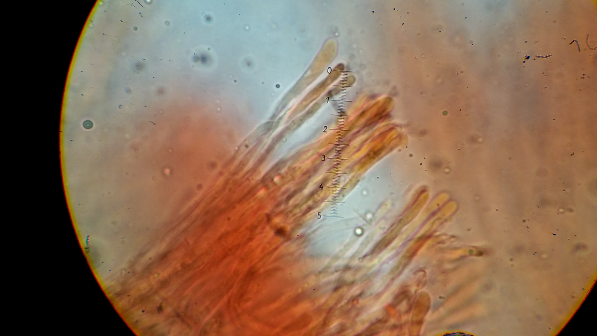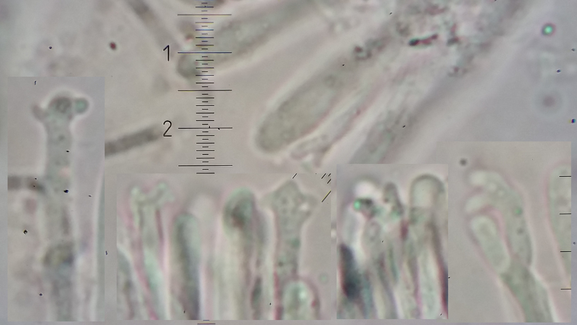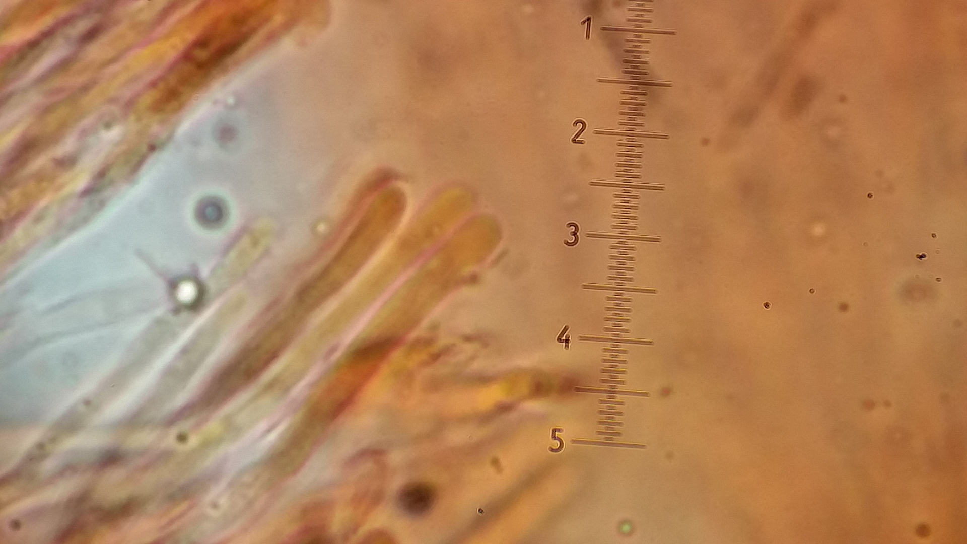 Das Hymenium besteht aus eine eine dichte Palisade von Basidien und Hyphen, manche sind apikal aufgeblasen andere haben so eine Nase wie hier in Bild.