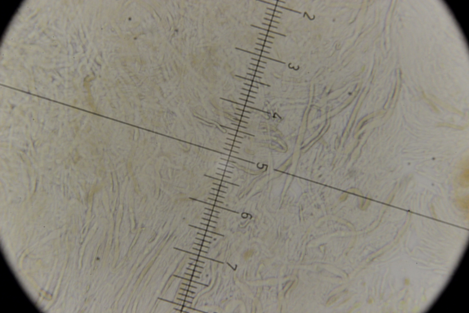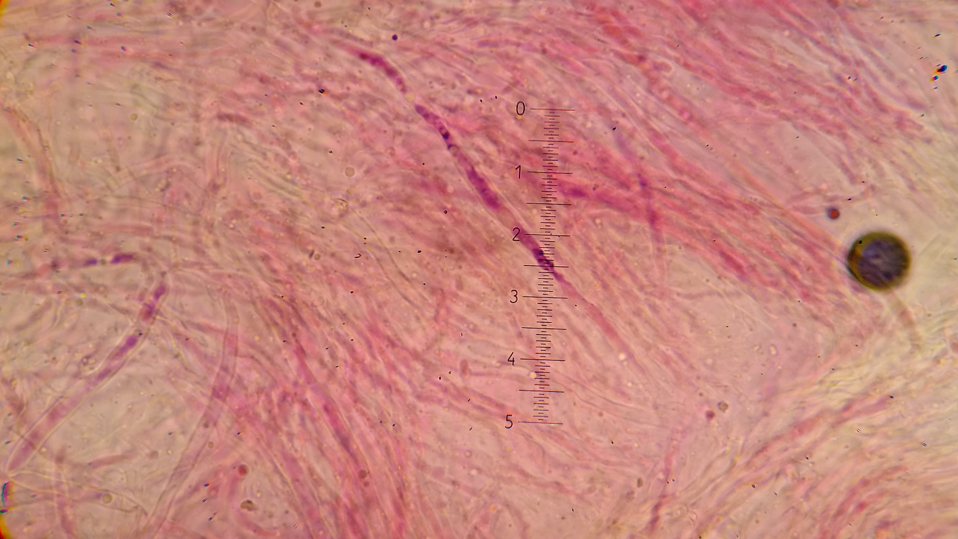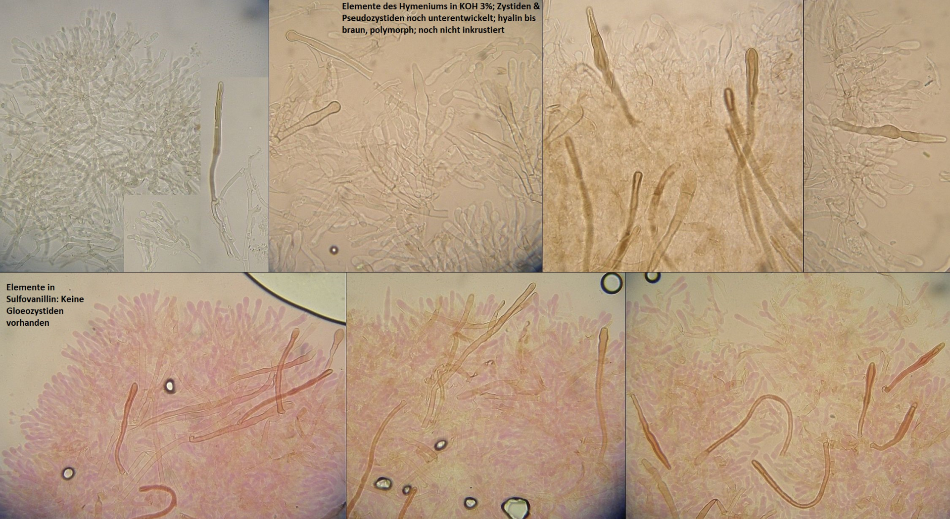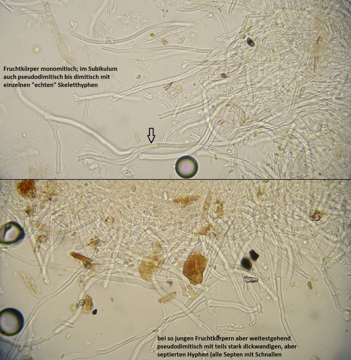 Der Pilz scheint mir monomitisch zu sein, wie gesagt scheint mir, es ist schnallenlos und die Hyphen sind sehr schwer zu trennen. Aus dem Subikulum steigen lange Zystiden ähnliche Elemente hoch, die sind dünnwandig und mit einen öligen Inhalt, in allgemein sind viele Hyphen mit so ein komisches Zeug drin.