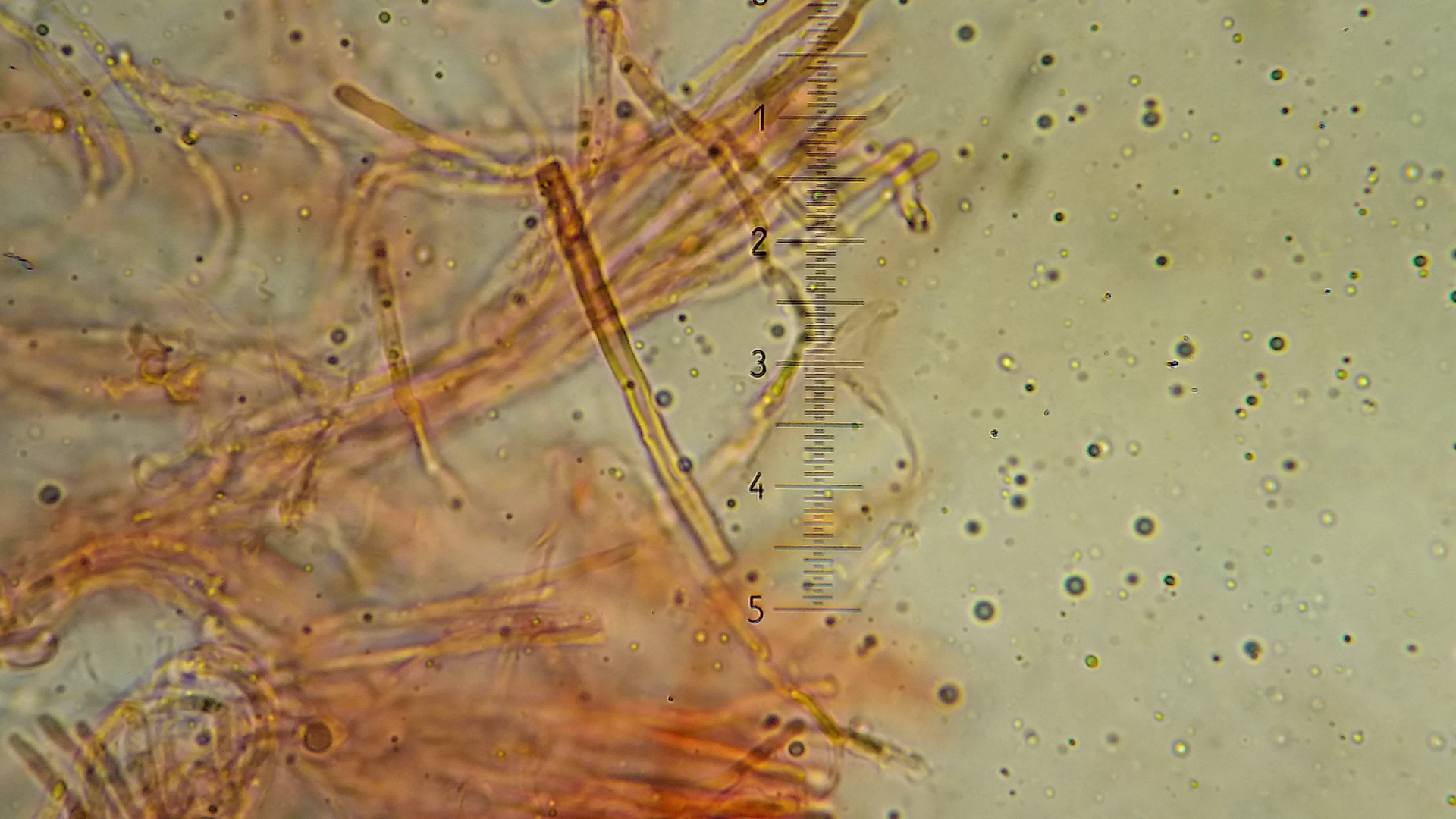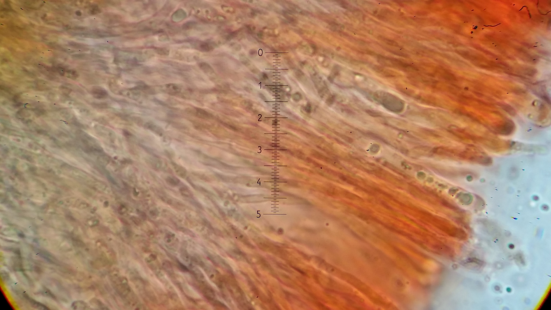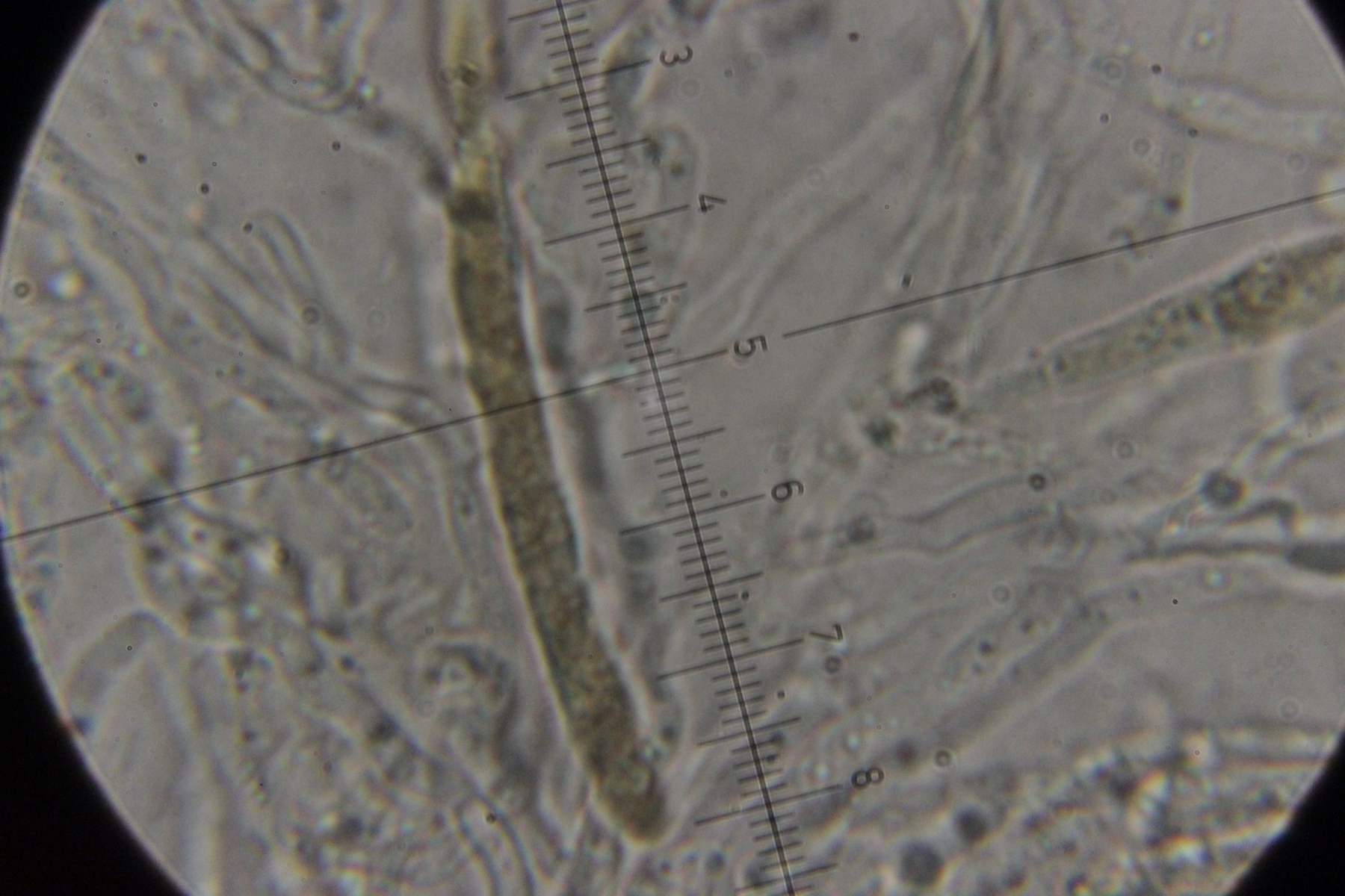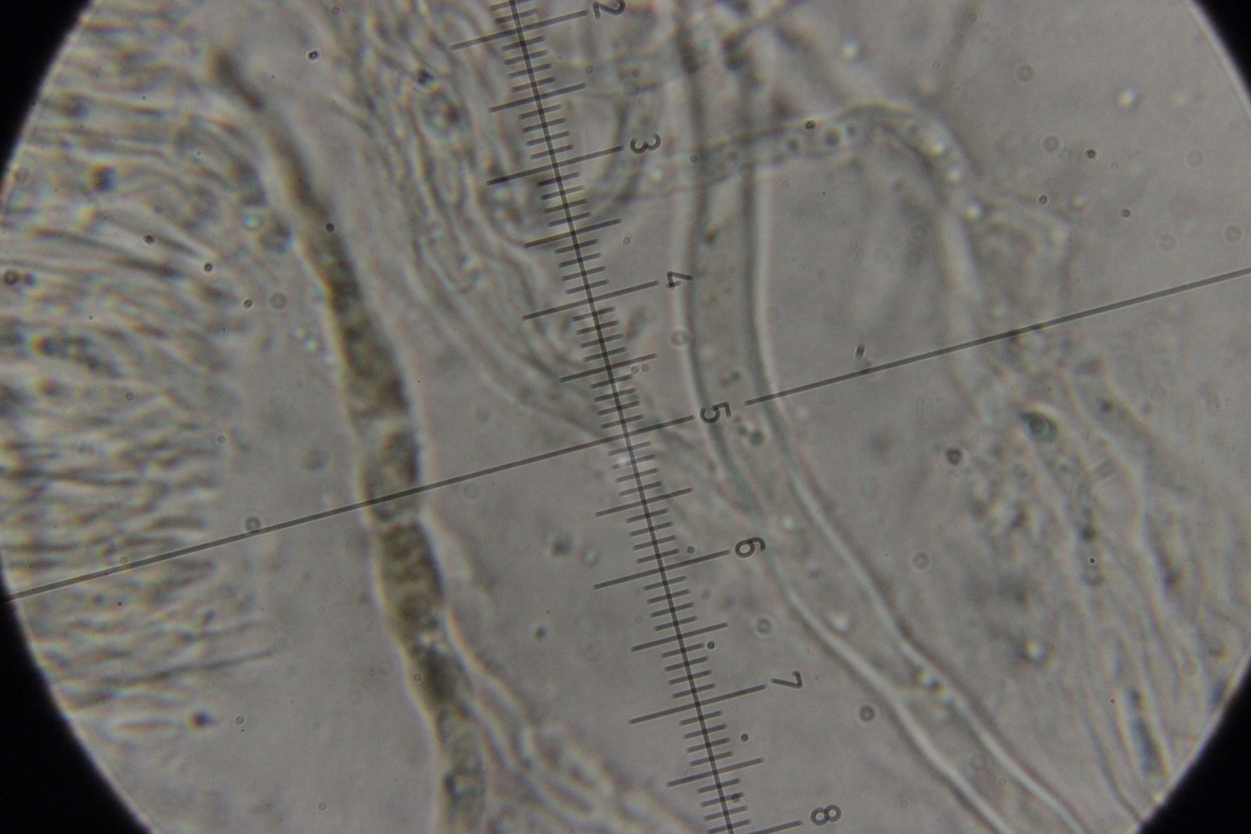Der Pilz scheint mir monomitisch zu sein, wie gesagt scheint mir, es ist schnallenlos und die Hyphen sind sehr schwer zu trennen. Aus dem Subikulum steigen lange Zystiden ähnliche Elemente hoch, die sind dünnwandig und mit einen öligen Inhalt, in allgemein sind viele Hyphen mit so ein komisches Zeug drin.