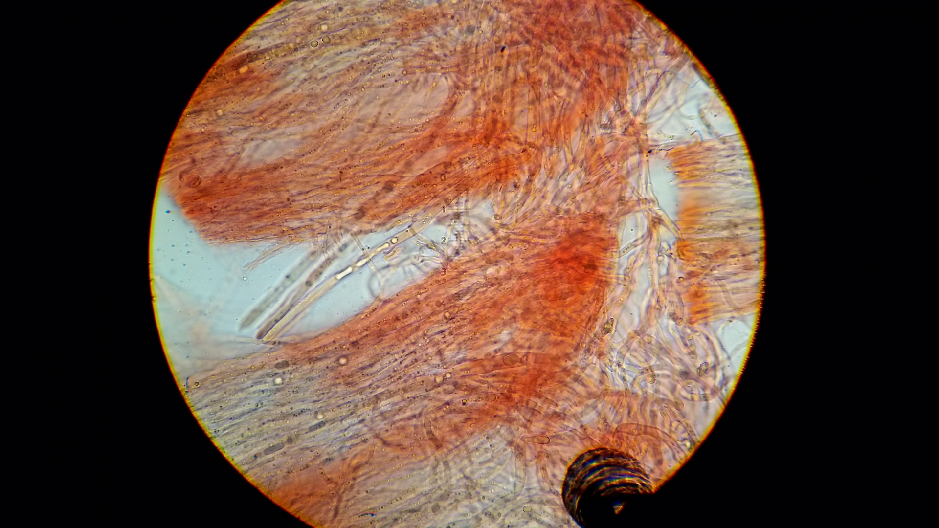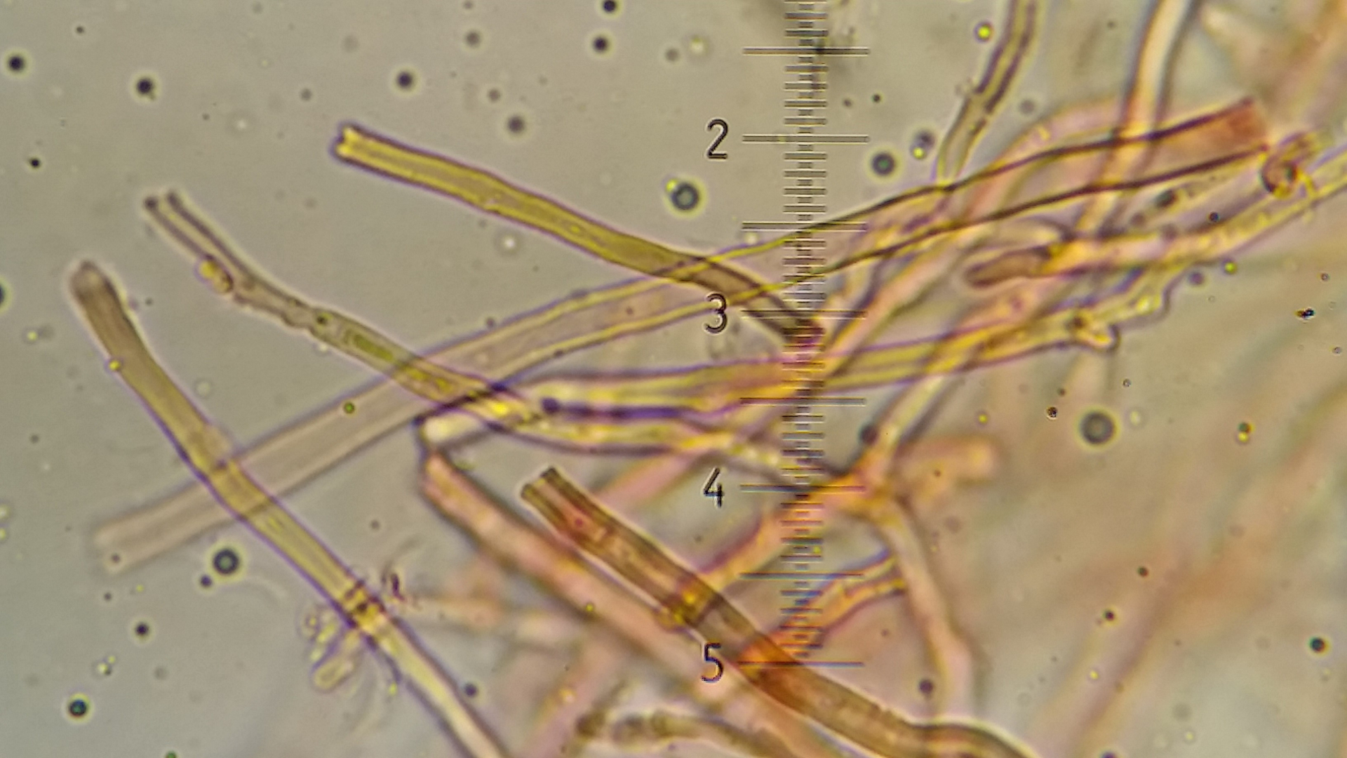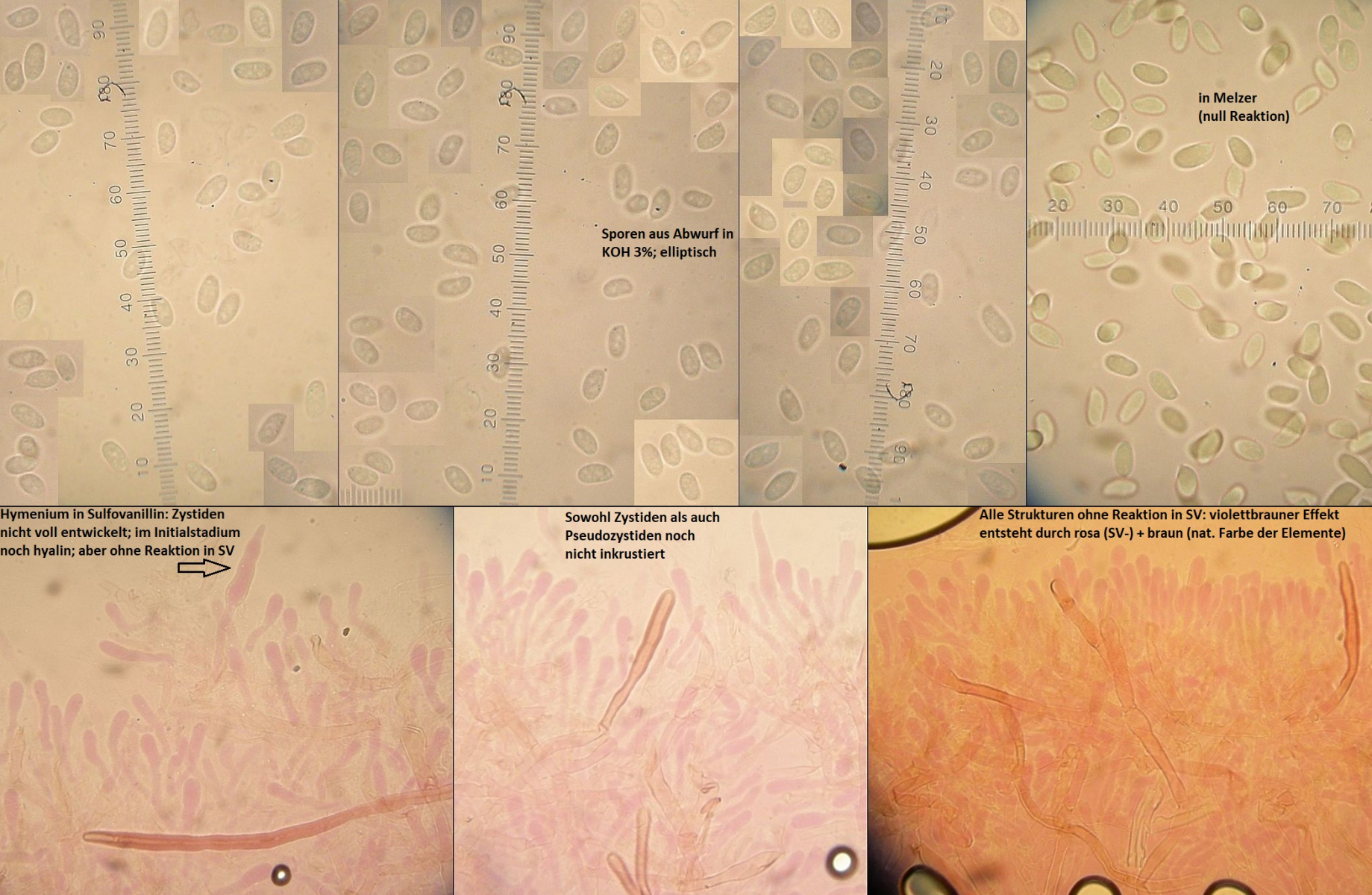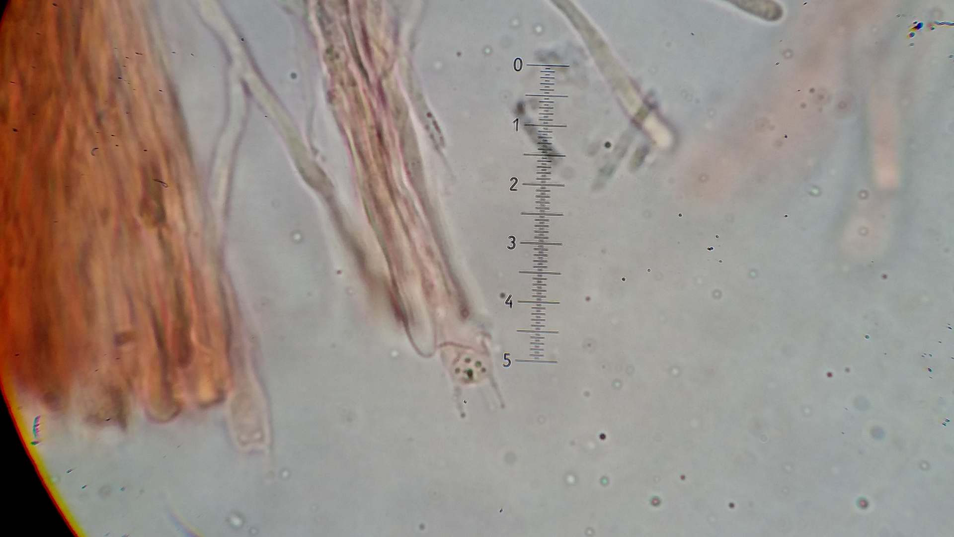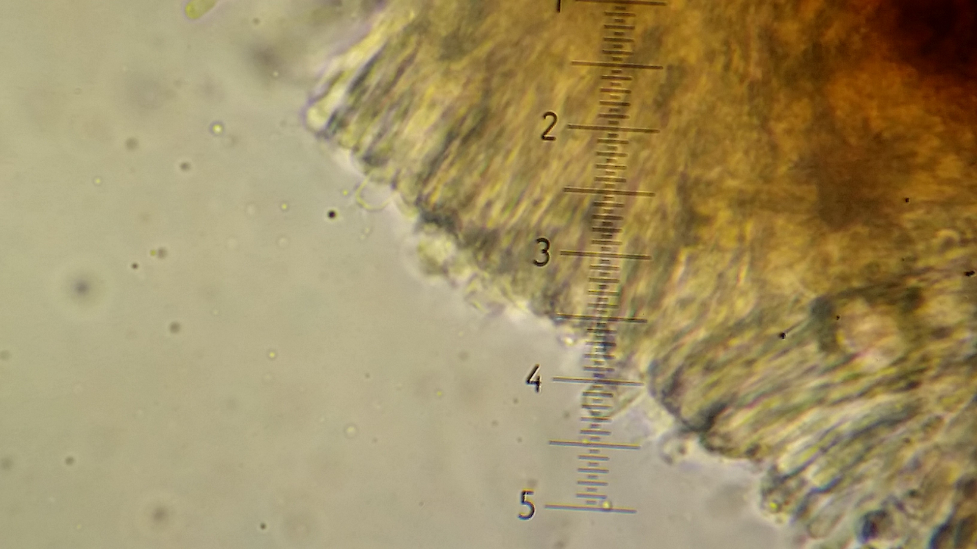 Der Pilz scheint mir monomitisch zu sein, wie gesagt scheint mir, es ist schnallenlos und die Hyphen sind sehr schwer zu trennen. Aus dem Subikulum steigen lange Zystiden ähnliche Elemente hoch, die sind dünnwandig und mit einen öligen Inhalt, in allgemein sind viele Hyphen mit so ein komisches Zeug drin.