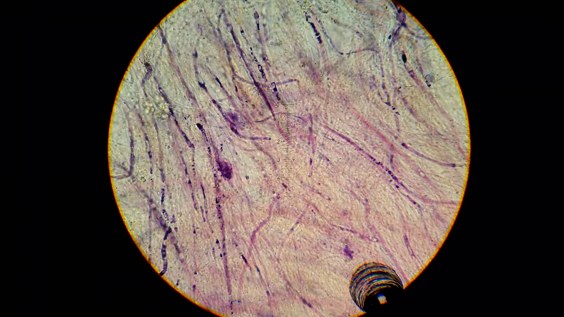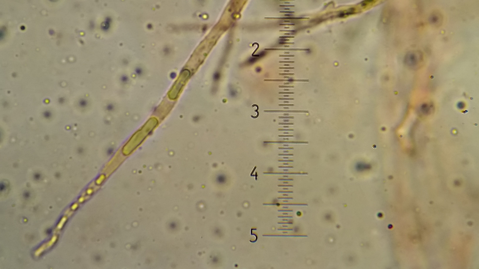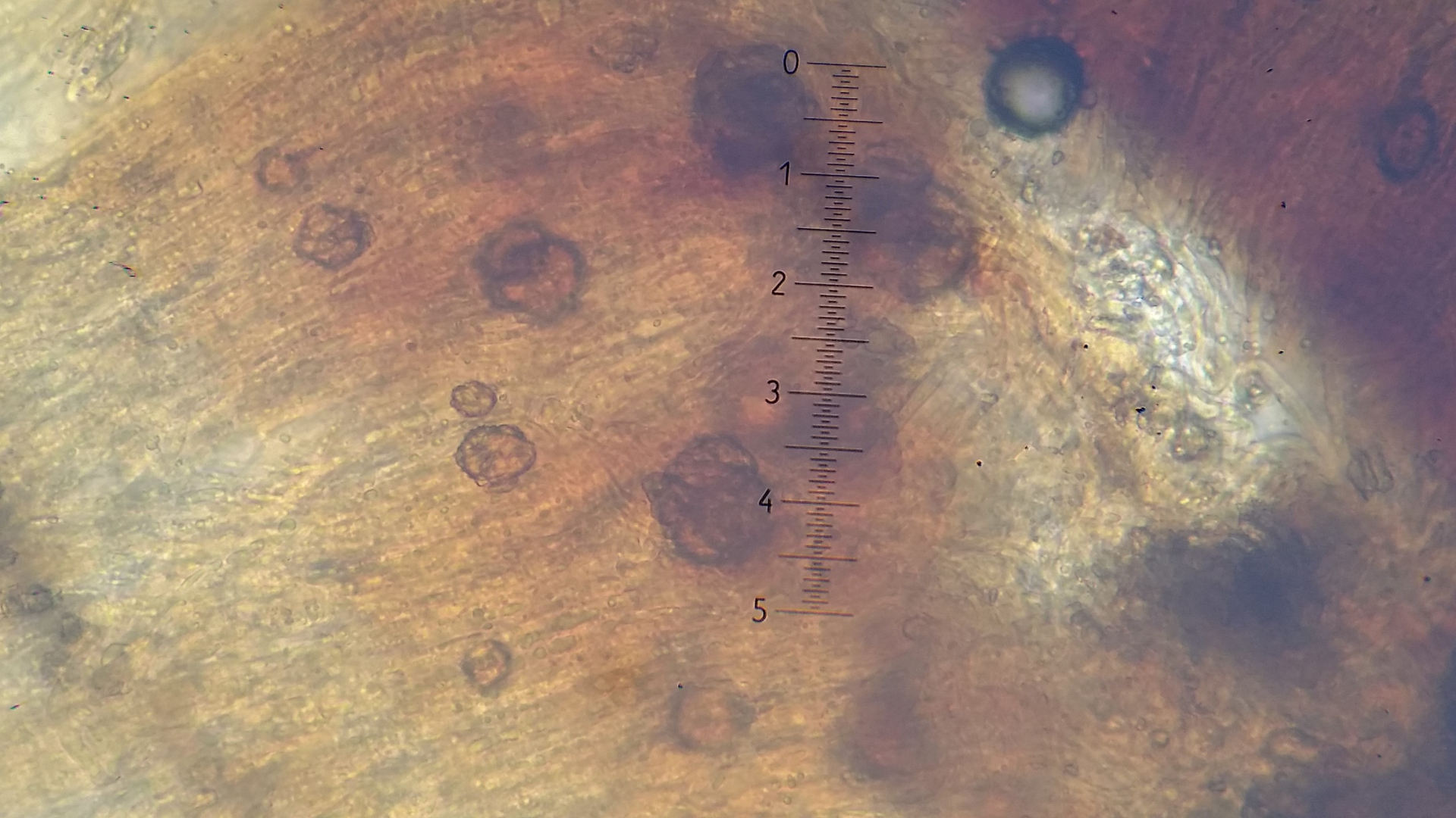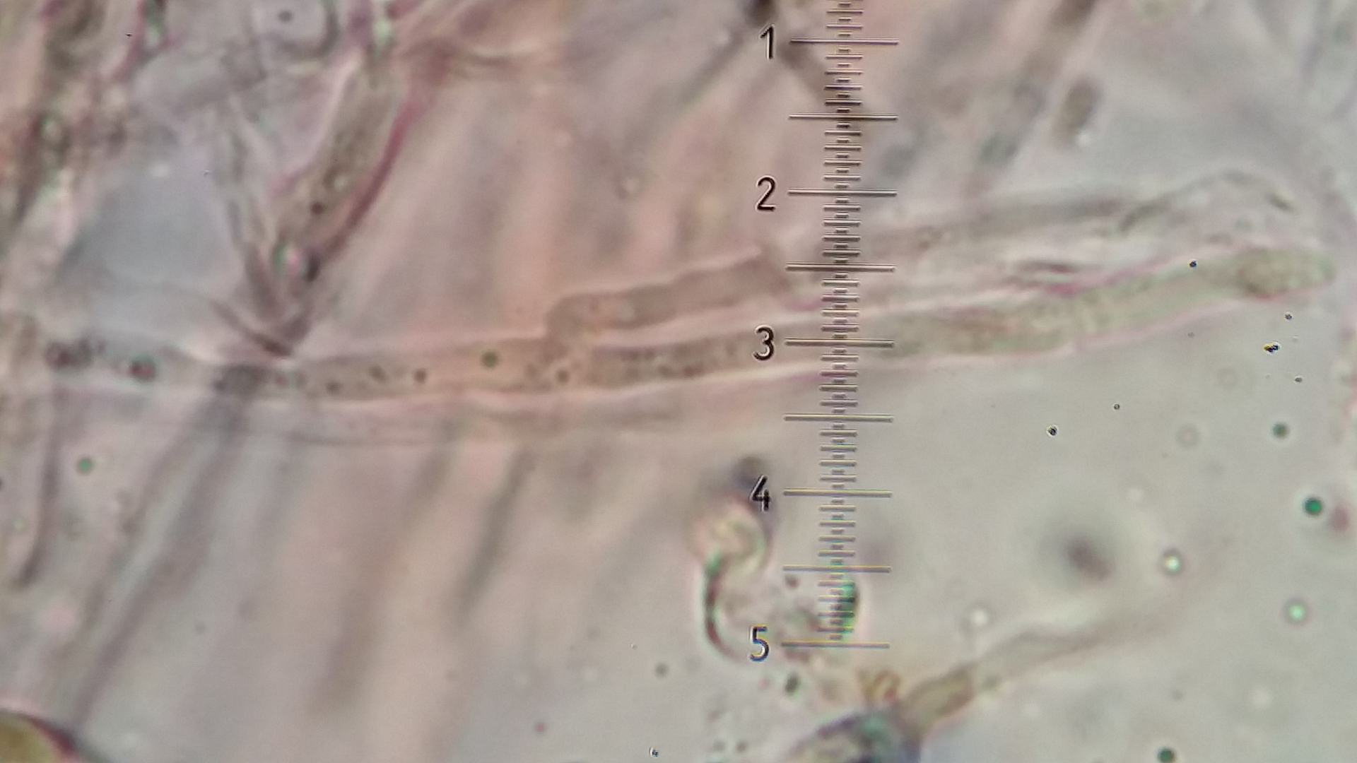 Der Pilz scheint mir monomitisch zu sein, wie gesagt scheint mir, es ist schnallenlos und die Hyphen sind sehr schwer zu trennen. Aus dem Subikulum steigen lange Zystiden ähnliche Elemente hoch, die sind dünnwandig und mit einen öligen Inhalt, in allgemein sind viele Hyphen mit so ein komisches Zeug drin.