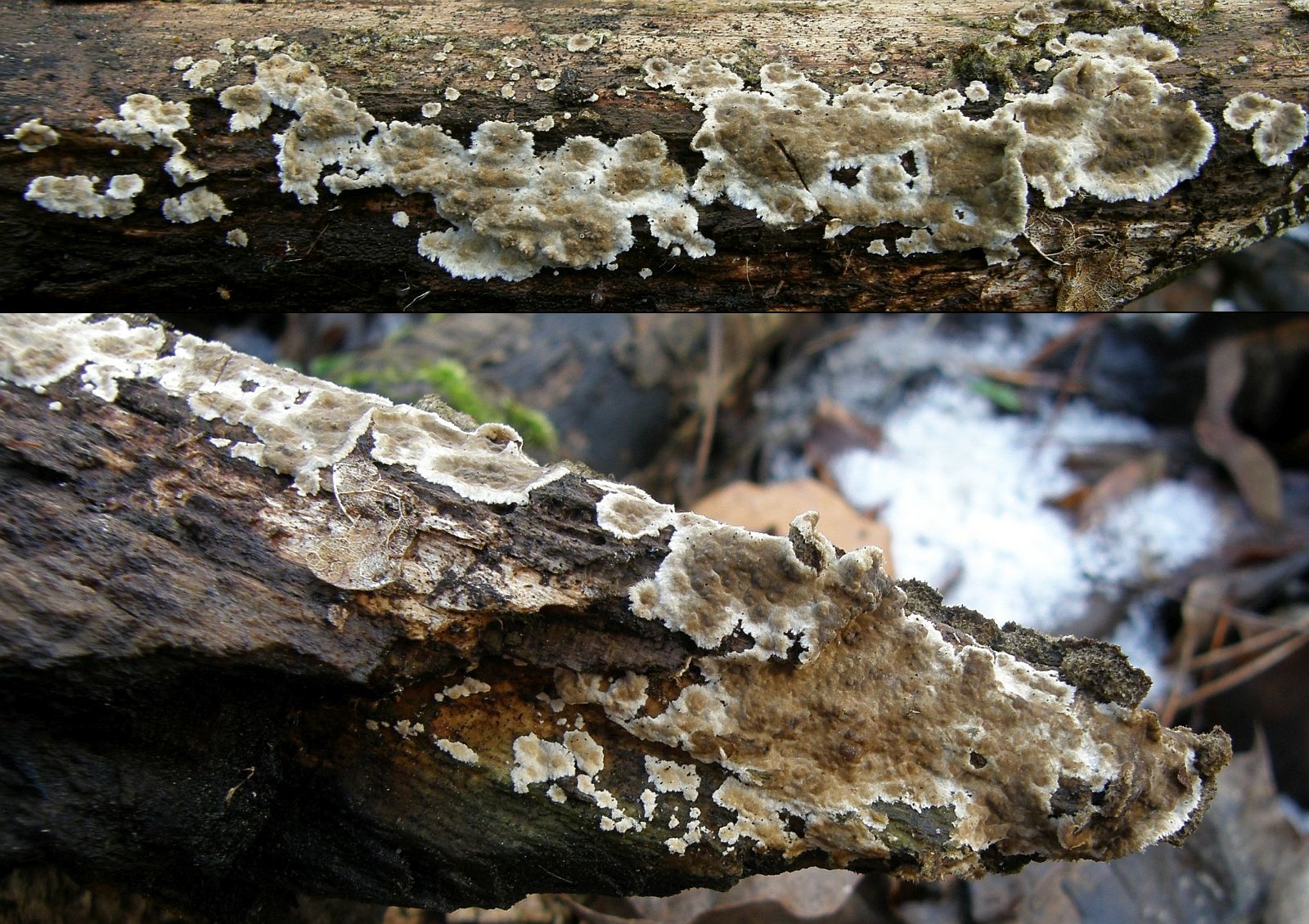 Der Pilz wuchs an Weide und hatte ein flächiges Teil wuchs aber auch konsolenformig wie man hier sehen kann. Ich habe ein Stückchen mit genommen um es mikroskopisch ab zu sichern da Björn (gdno81) meinte, zu recht, womöglich könnte noch Porostereum spadiceum in frage kommen. Das Ergebnis war das ich weder Seten noch inkrustierten Skelettozystiden finden konnte. Jetzt habe ich irgendwie das Gefühl das ich irgend etwas übersehe, denn beim Schlüsseln komme ich nirgendwo bzw komme ich an stellen an wo ich nichts zu suchen habe.