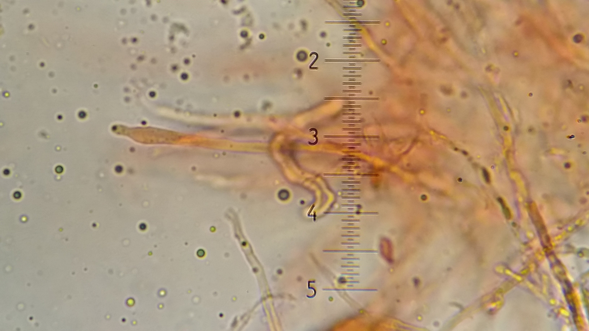Wäre den möglich das die von mir mit Pfeilen markierten Elemente Acanthozystiden sind? Möglicherweise noch nicht sehr ausgeprägt weil der Pilz nach Jung ist?