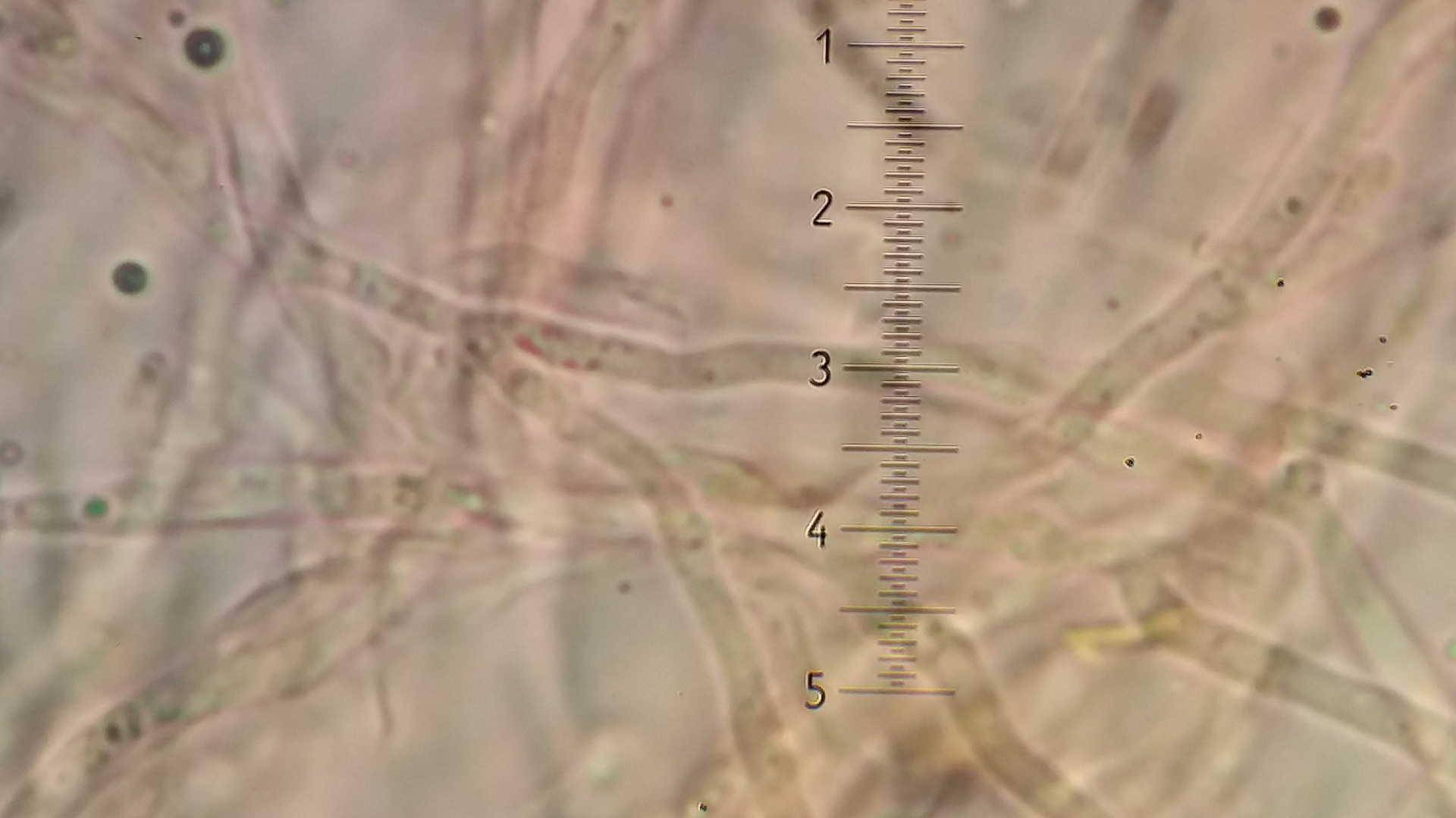 Der Pilz scheint mir monomitisch zu sein, wie gesagt scheint mir, es ist schnallenlos und die Hyphen sind sehr schwer zu trennen. Aus dem Subikulum steigen lange Zystiden ähnliche Elemente hoch, die sind dünnwandig und mit einen öligen Inhalt, in allgemein sind viele Hyphen mit so ein komisches Zeug drin.