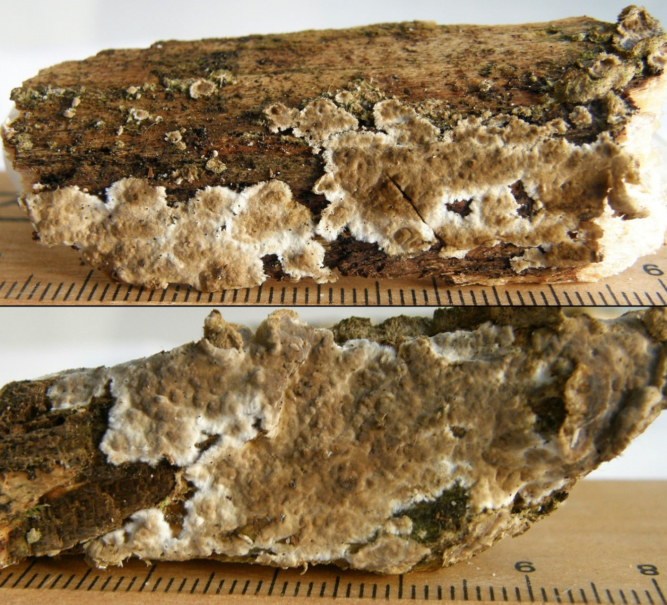 Nach dem "Schichtpilz" habe ich zuerst geschaut. Es ist eine Phlebia. Makroskopisch am besten zu Phlebia livida passend, aber ohne Schnallen und zu großen Sporen. Es gibt in Europa allerdings nur zwei schnallenlose Phlebia- Arten. Phlebia deflectens mit kleineren Sporen und Phlebia viride-salebrosa. Hier würden die Sporengröße und -form passen, die in der Literatur beschriebene und namensgebende Farbe allerdings nicht.