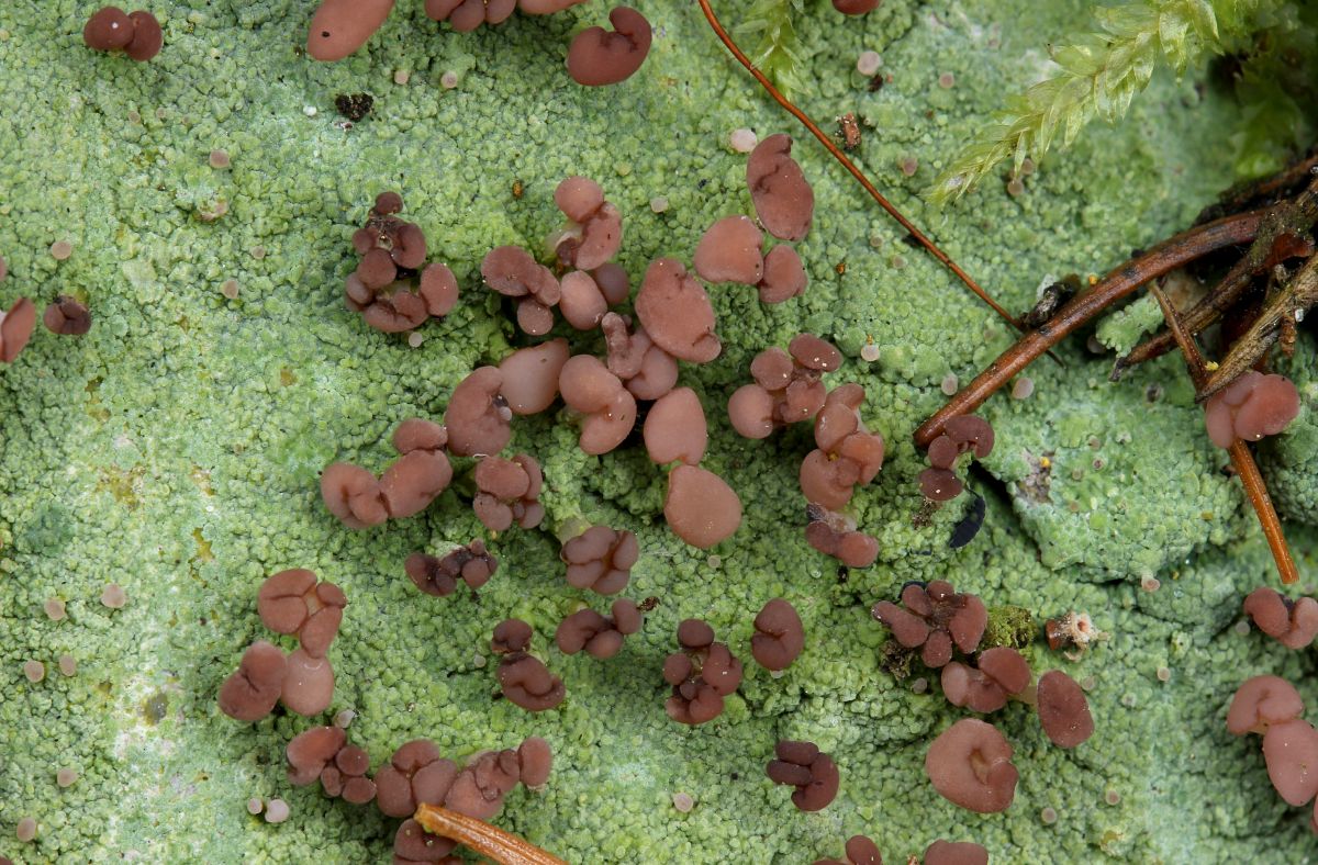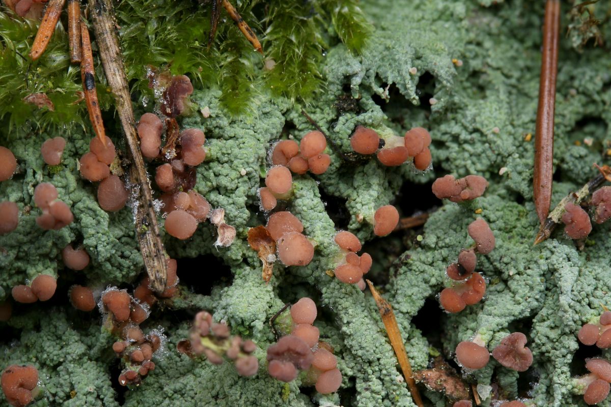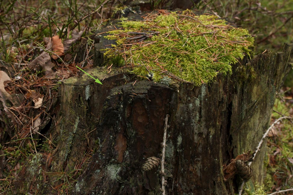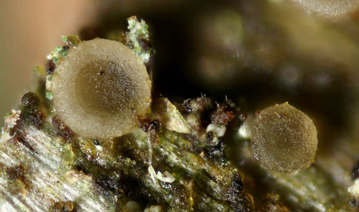 Dann schaute ich mir Stümpfe näher an, am zweiten wurde ich fündig. Eine kleine Becher bildende Flechte namens Coenogonium pineti.