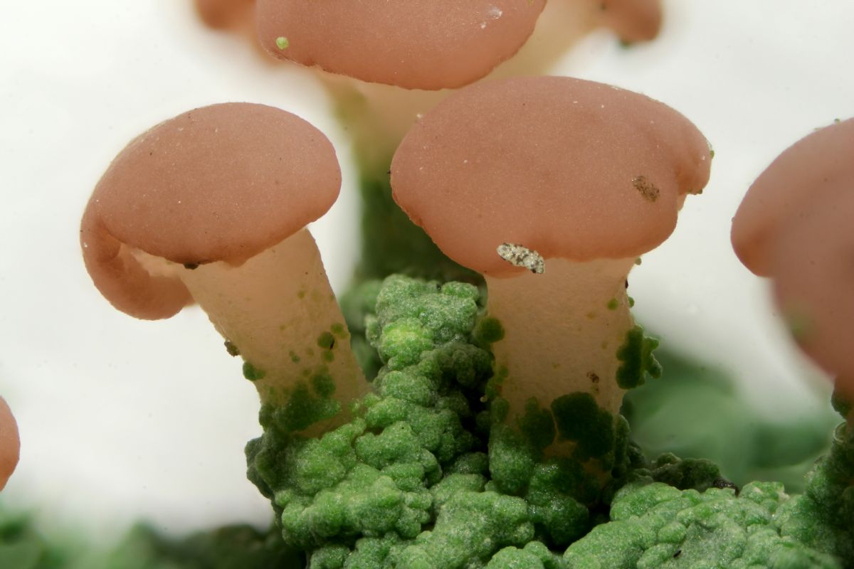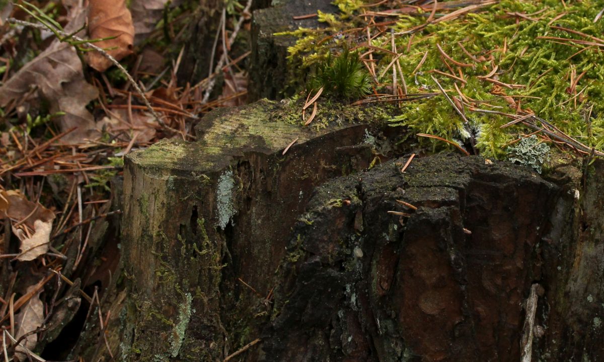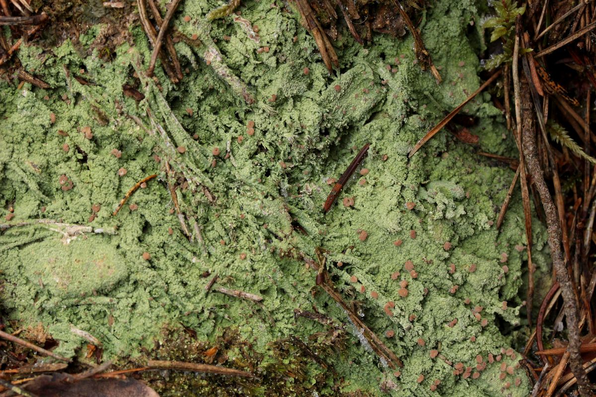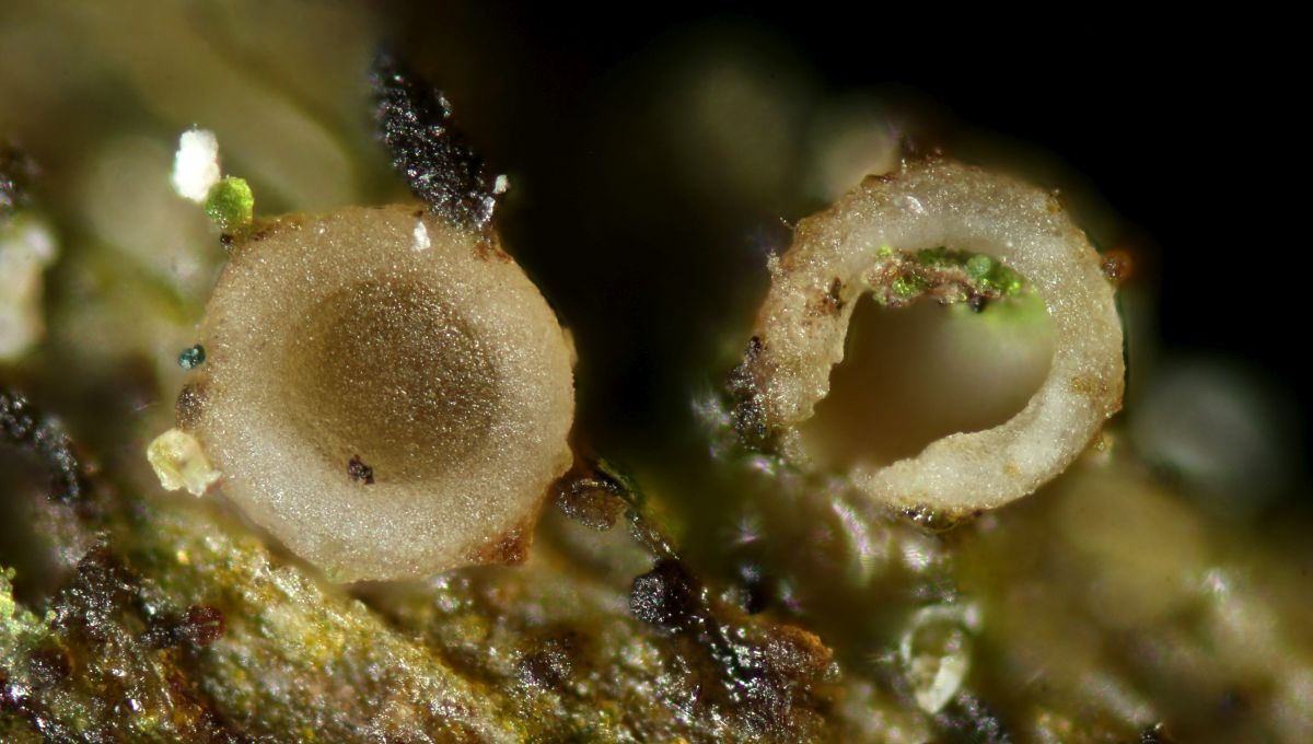 Dann schaute ich mir Stümpfe näher an, am zweiten wurde ich fündig. Eine kleine Becher bildende Flechte namens Coenogonium pineti.