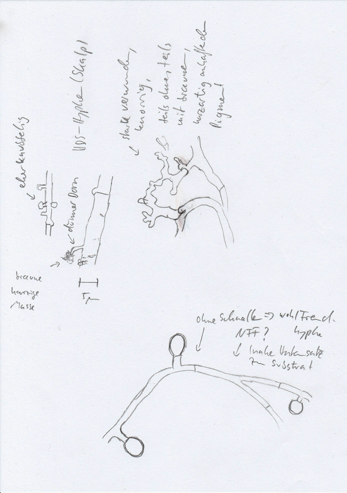 Das Subhymenium ist wie in der Gattung typisch sehr dicht und aus schmalen braunen Hyphen aufgebaut, die Lamellentrama gelatinös und dem Hutfleisch entsprechend; die HDS enthält knorrige Hyphen, teils mit kurz gestielten, kleinen Knubbeln, teils mit dünnen Fingern, an denen am Ende ein harziges Pigment sitzen kann, teils sind sie fast koralloid verzweigt/gewunden und etwas bizarr geformt, teils mit und teils ohne Pigment - das braune Pigment sieht aus wie angetrocknetes Harz.