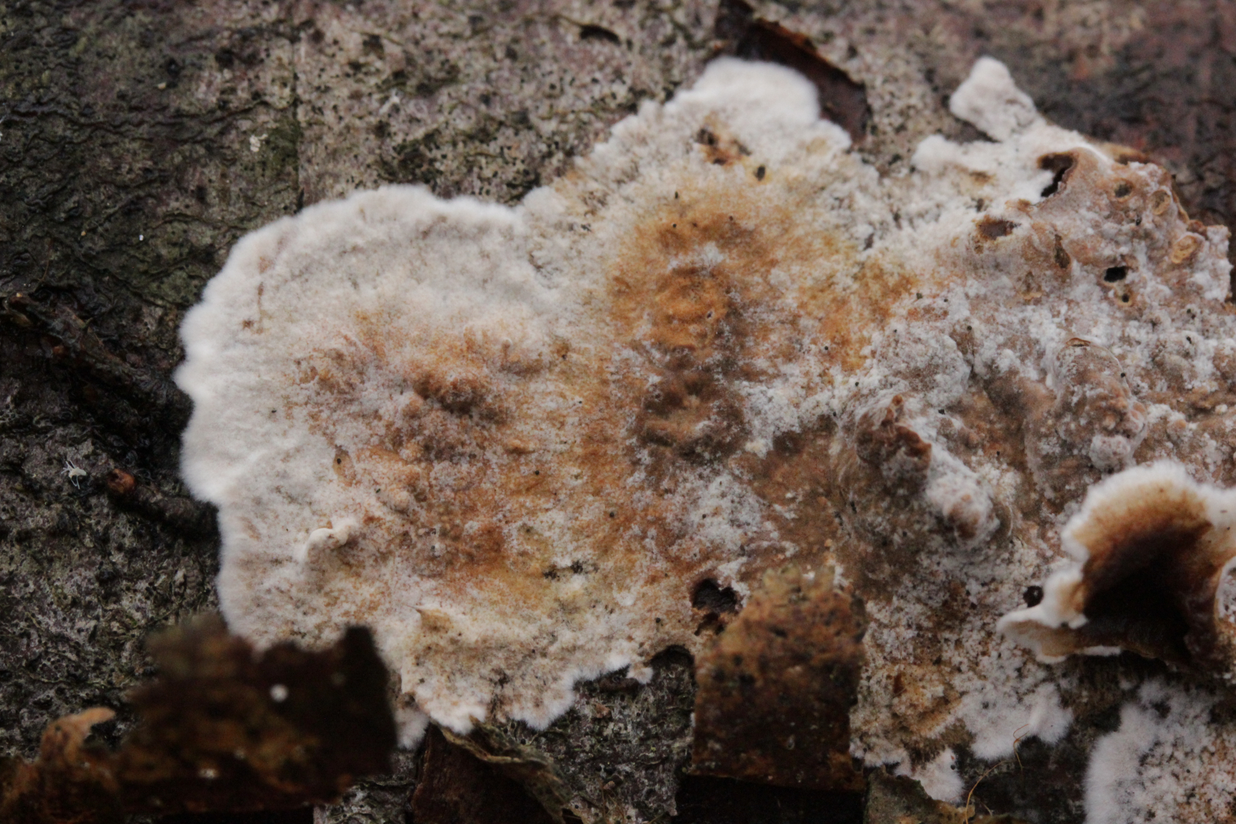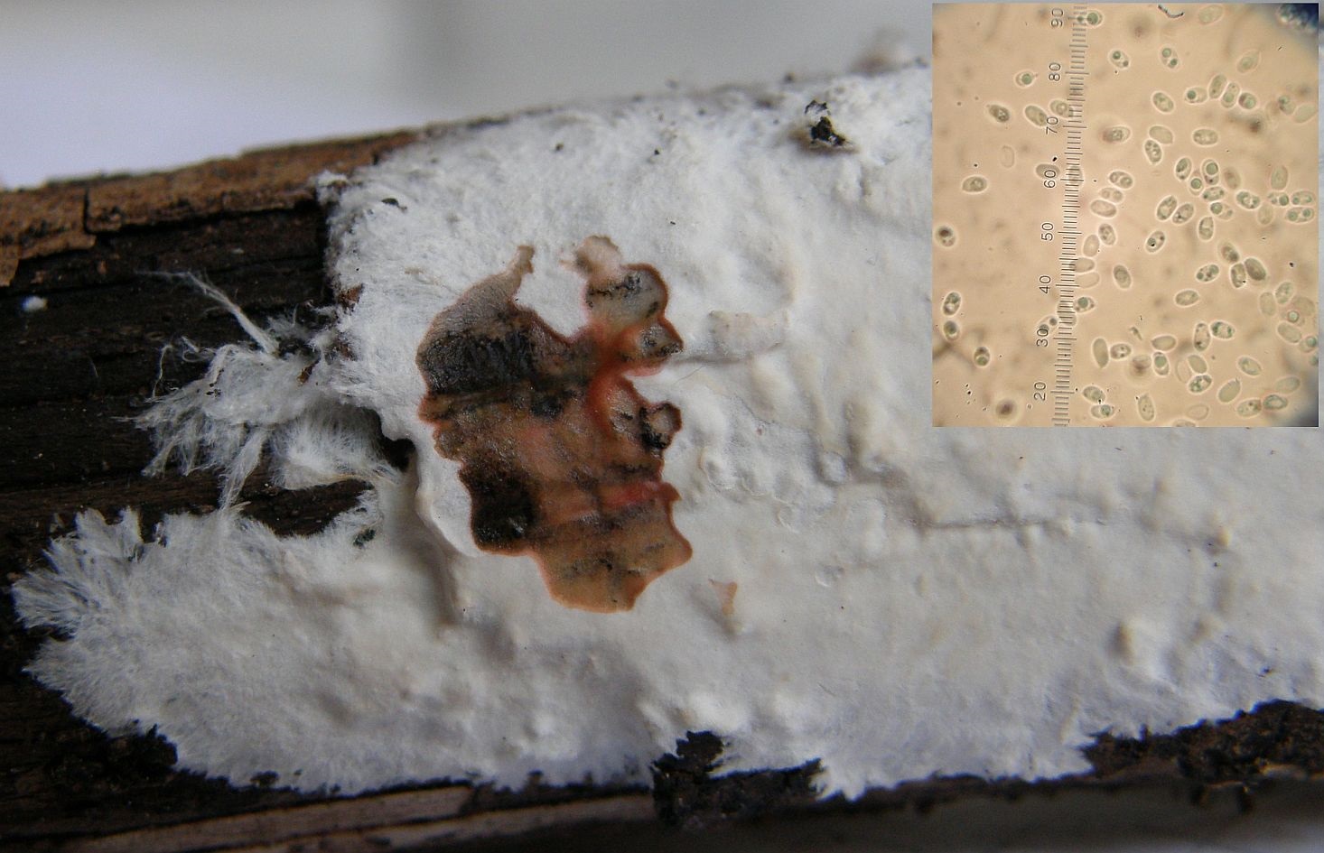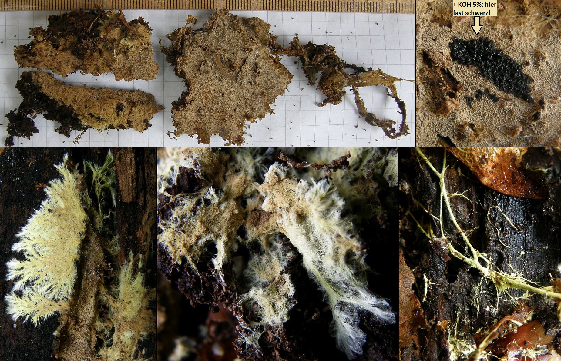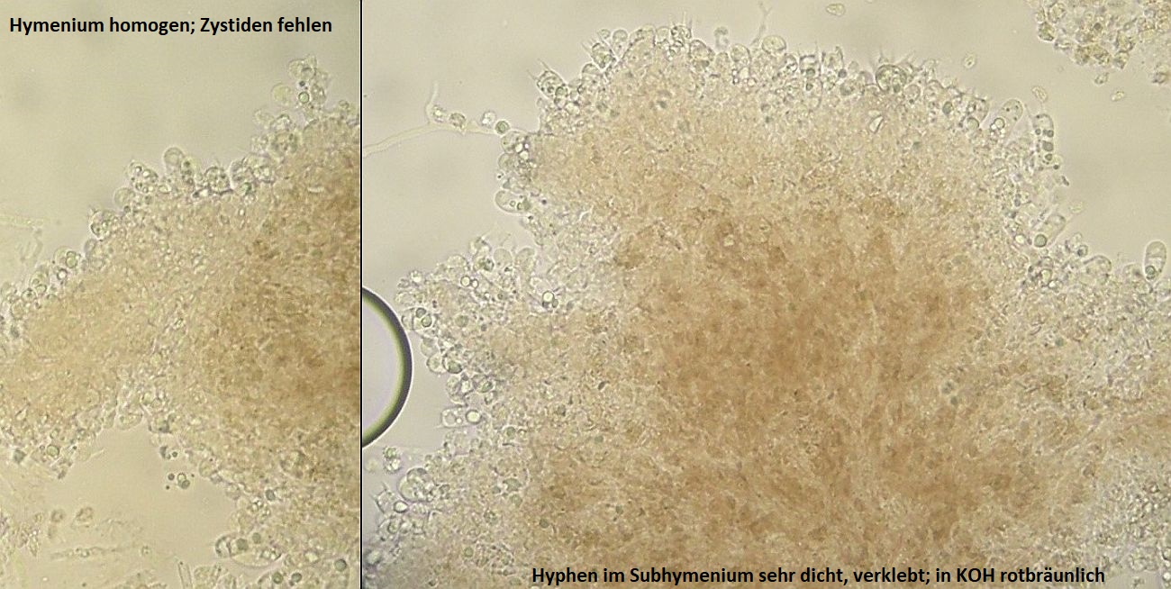 1. Der weiße Rindenpilz scheint hier auf Stereum auf Buche zu wachsen. Auffällig waren im Mikroskop leicht dunkle Zystiden