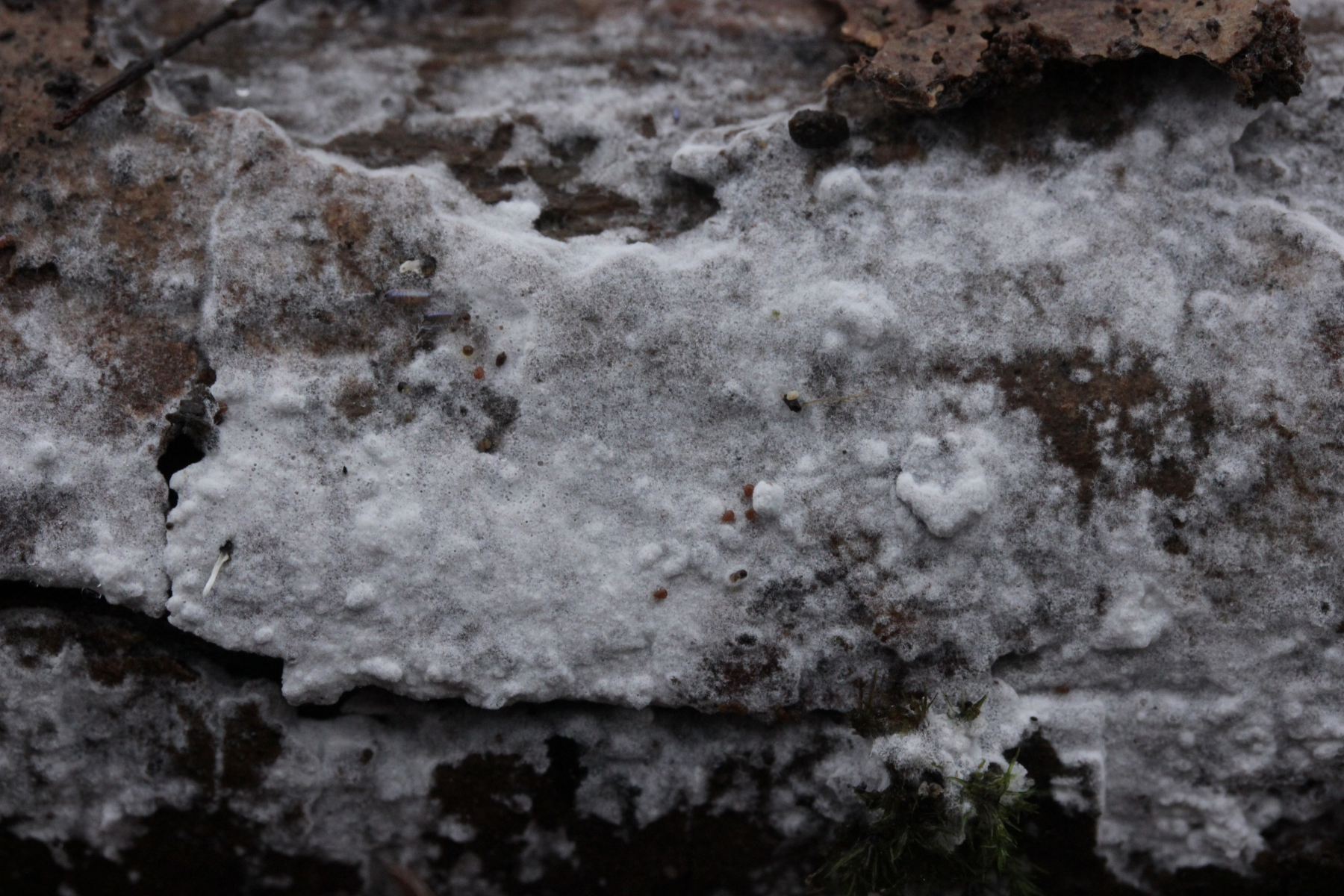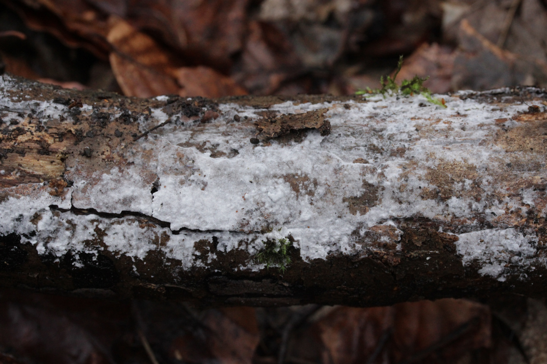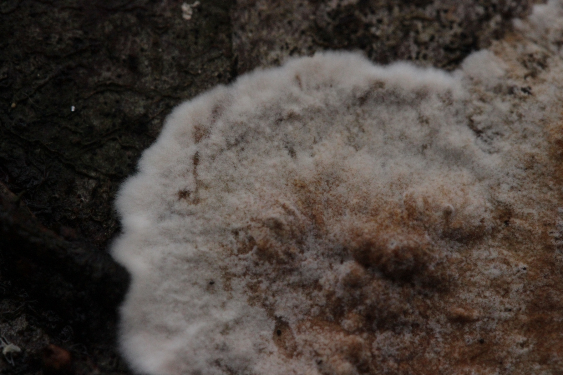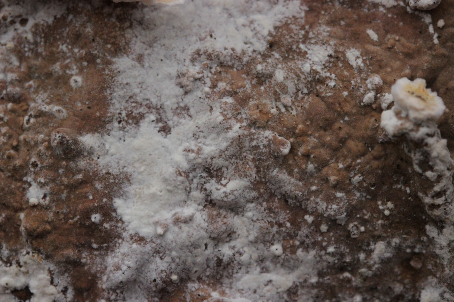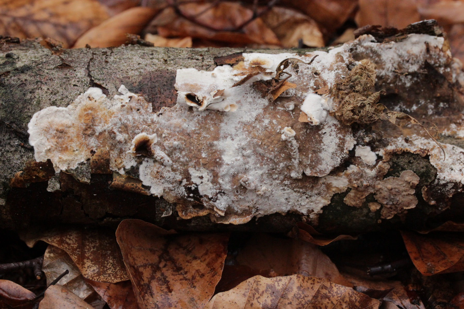 1. Der weiße Rindenpilz scheint hier auf Stereum auf Buche zu wachsen. Auffällig waren im Mikroskop leicht dunkle Zystiden