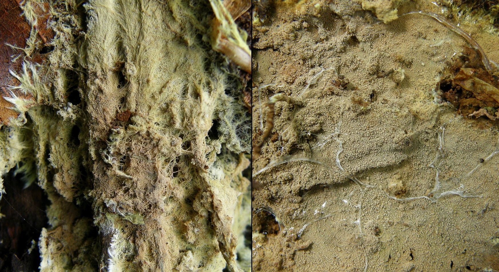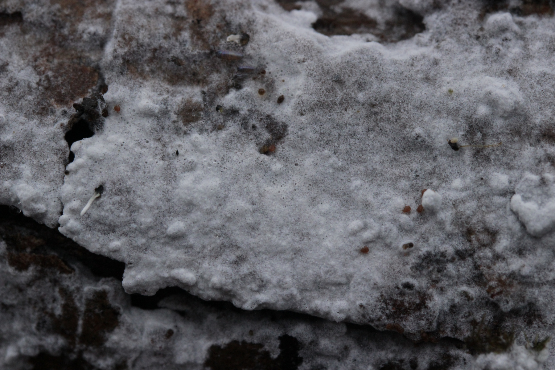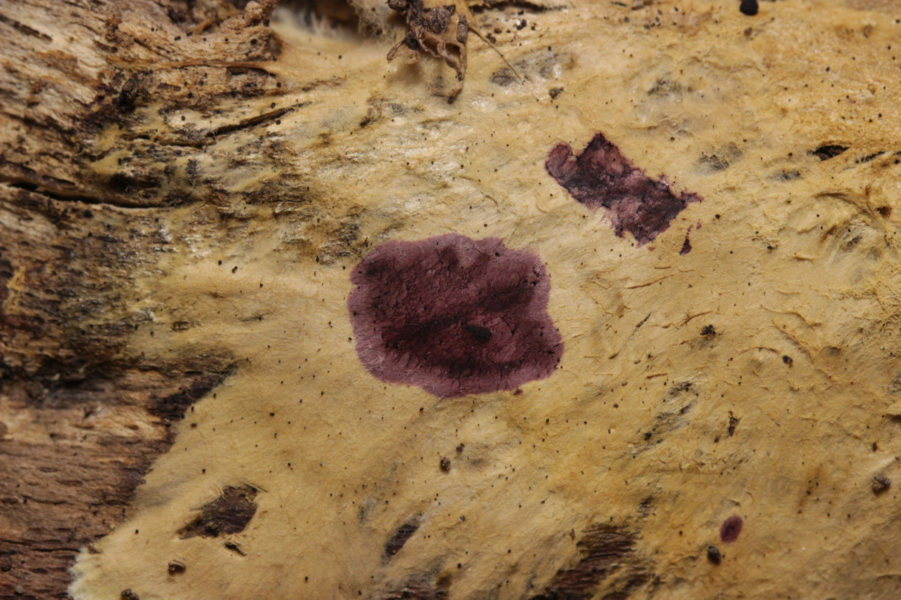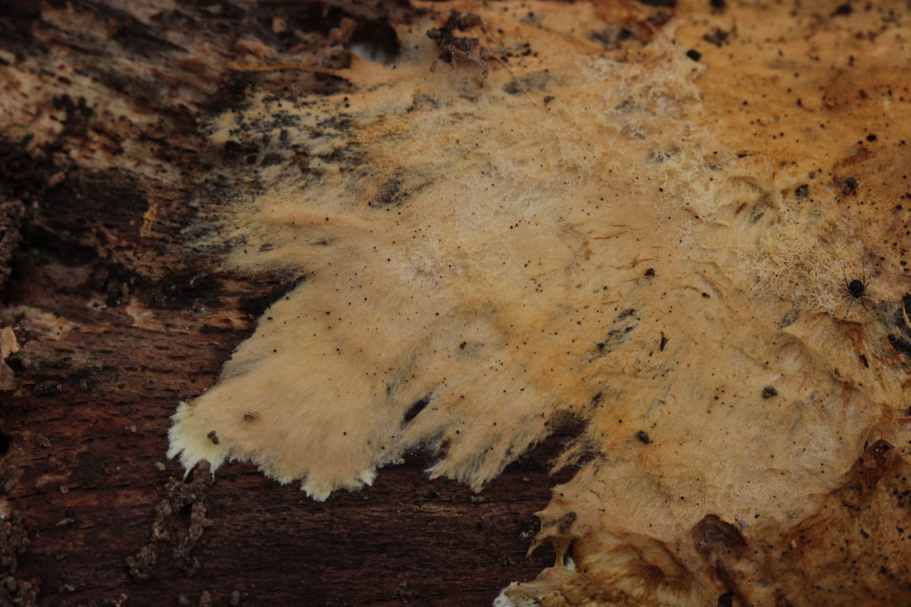 1. Der weiße Rindenpilz scheint hier auf Stereum auf Buche zu wachsen. Auffällig waren im Mikroskop leicht dunkle Zystiden