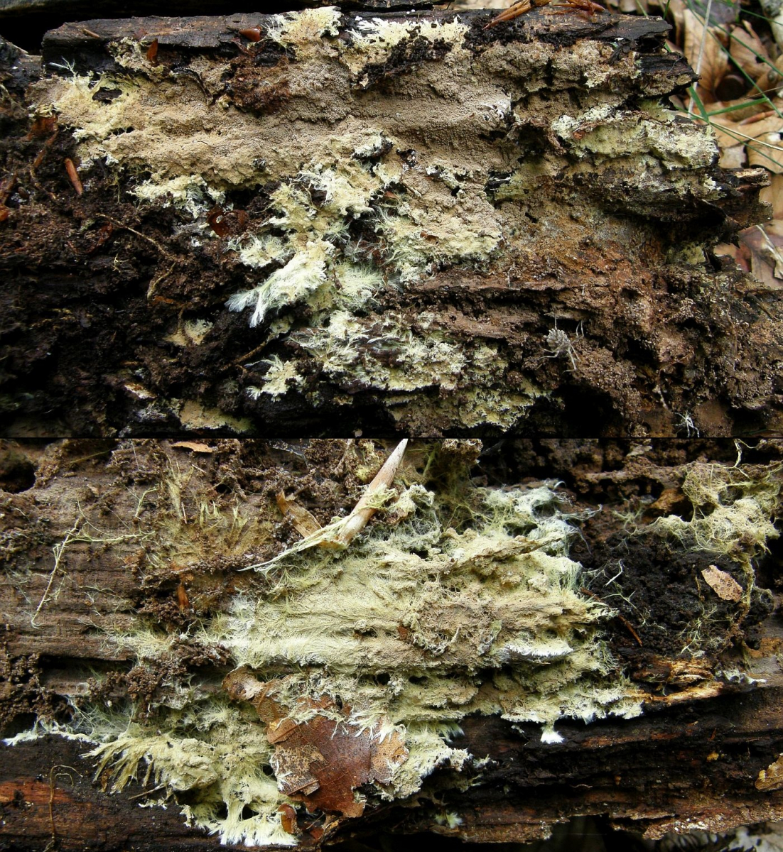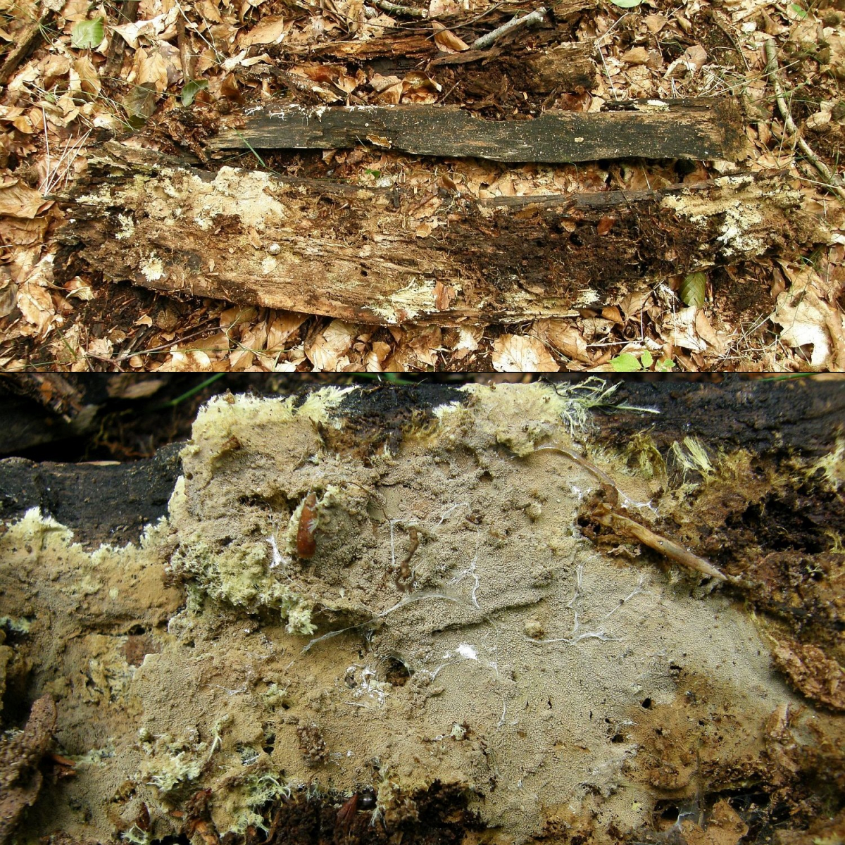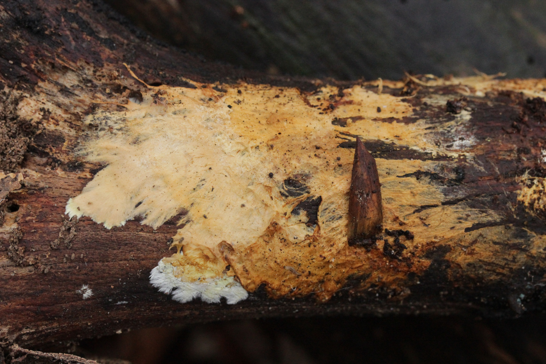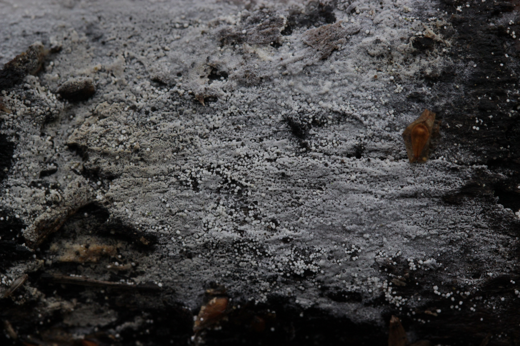 1. Der weiße Rindenpilz scheint hier auf Stereum auf Buche zu wachsen. Auffällig waren im Mikroskop leicht dunkle Zystiden