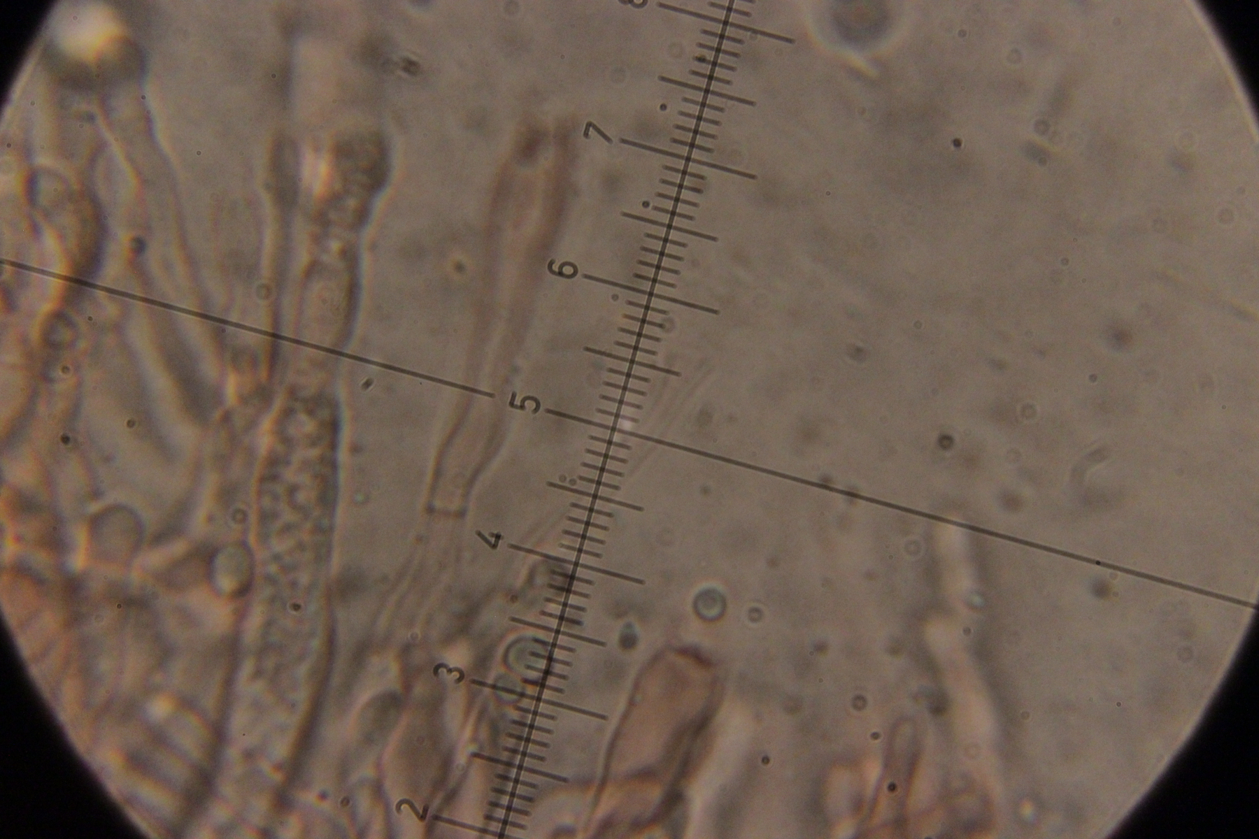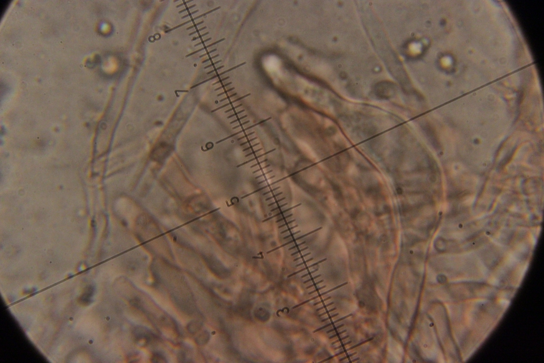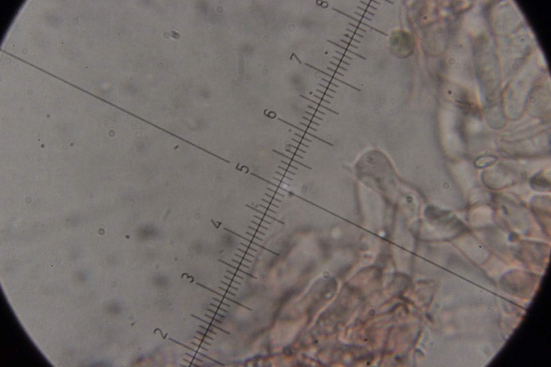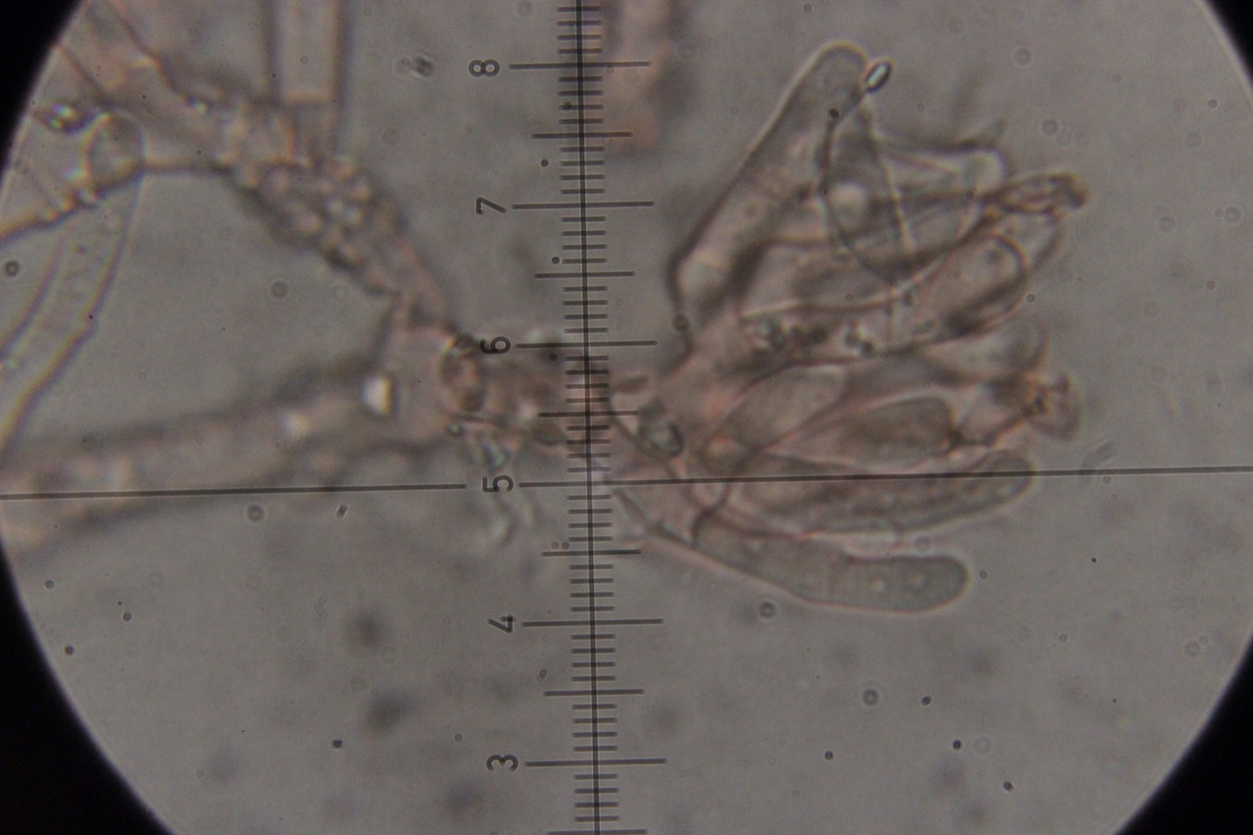 4. Auf Fraxinus. Hier weiß ich nicht so recht weiter. Die taillierte, 6-sporige Basidie läßt mich zu Sistotrema tendieren. Da gibt es aber scheinbar keine Arten mit Zystiden. Und auch sonst paßt keine der anderen 4+-sporigen Gattungen wie Botryobasidium.