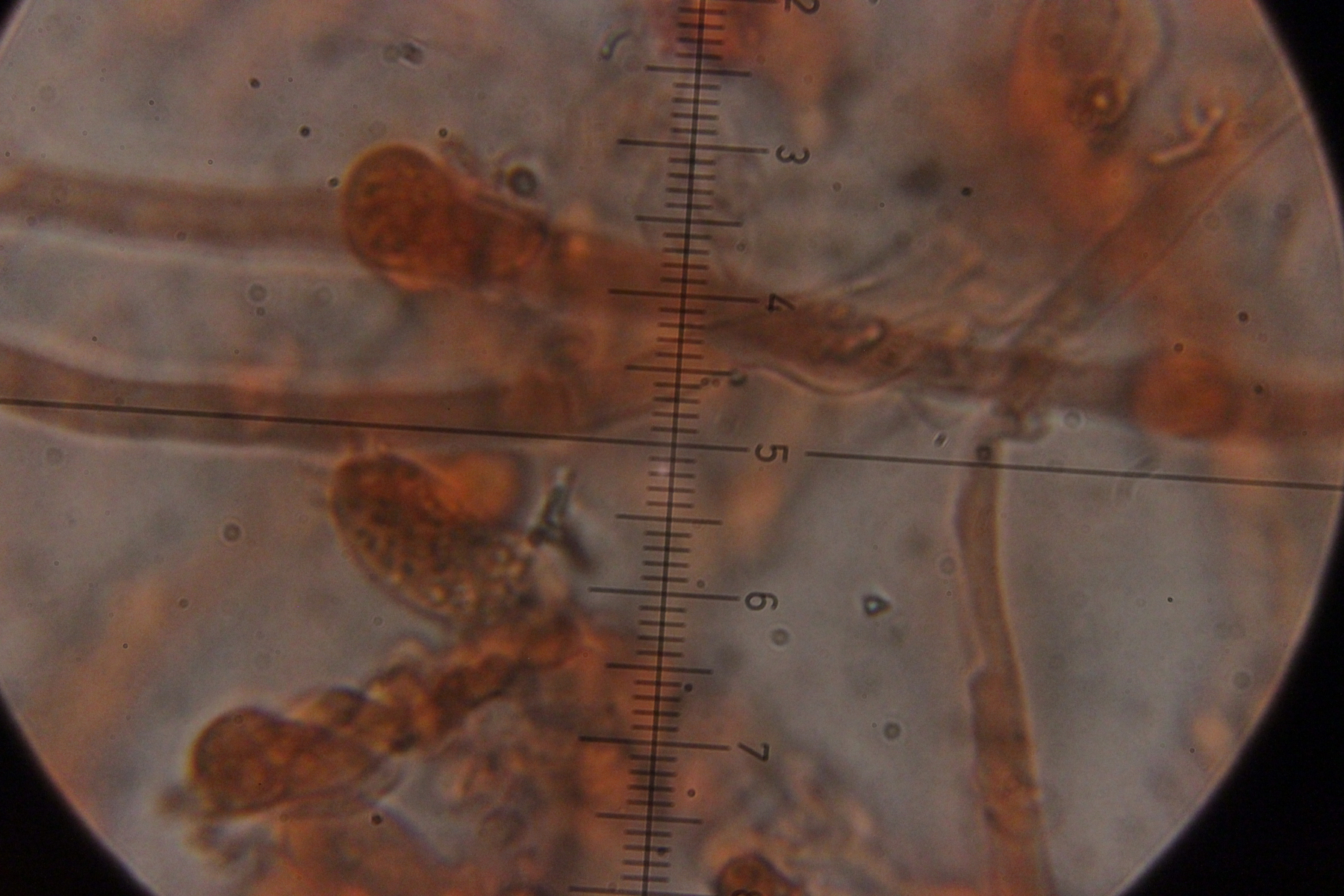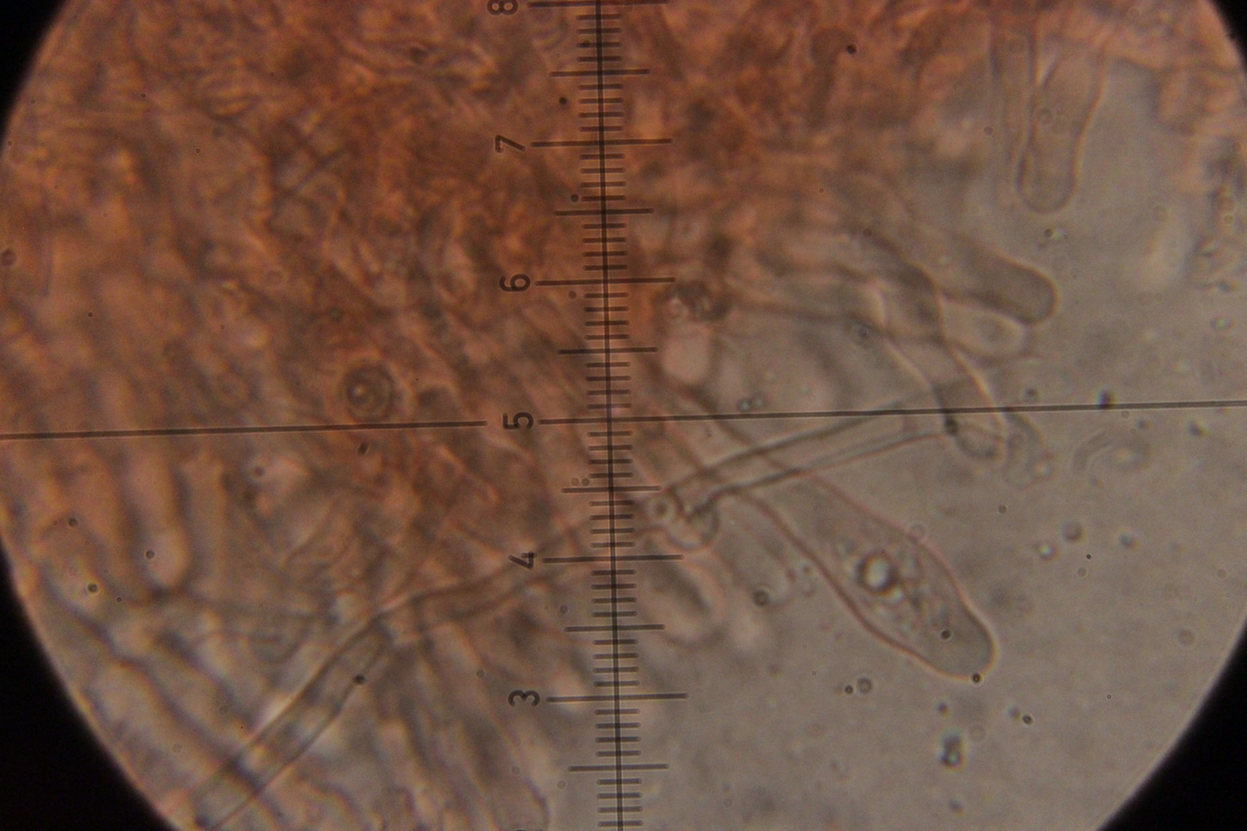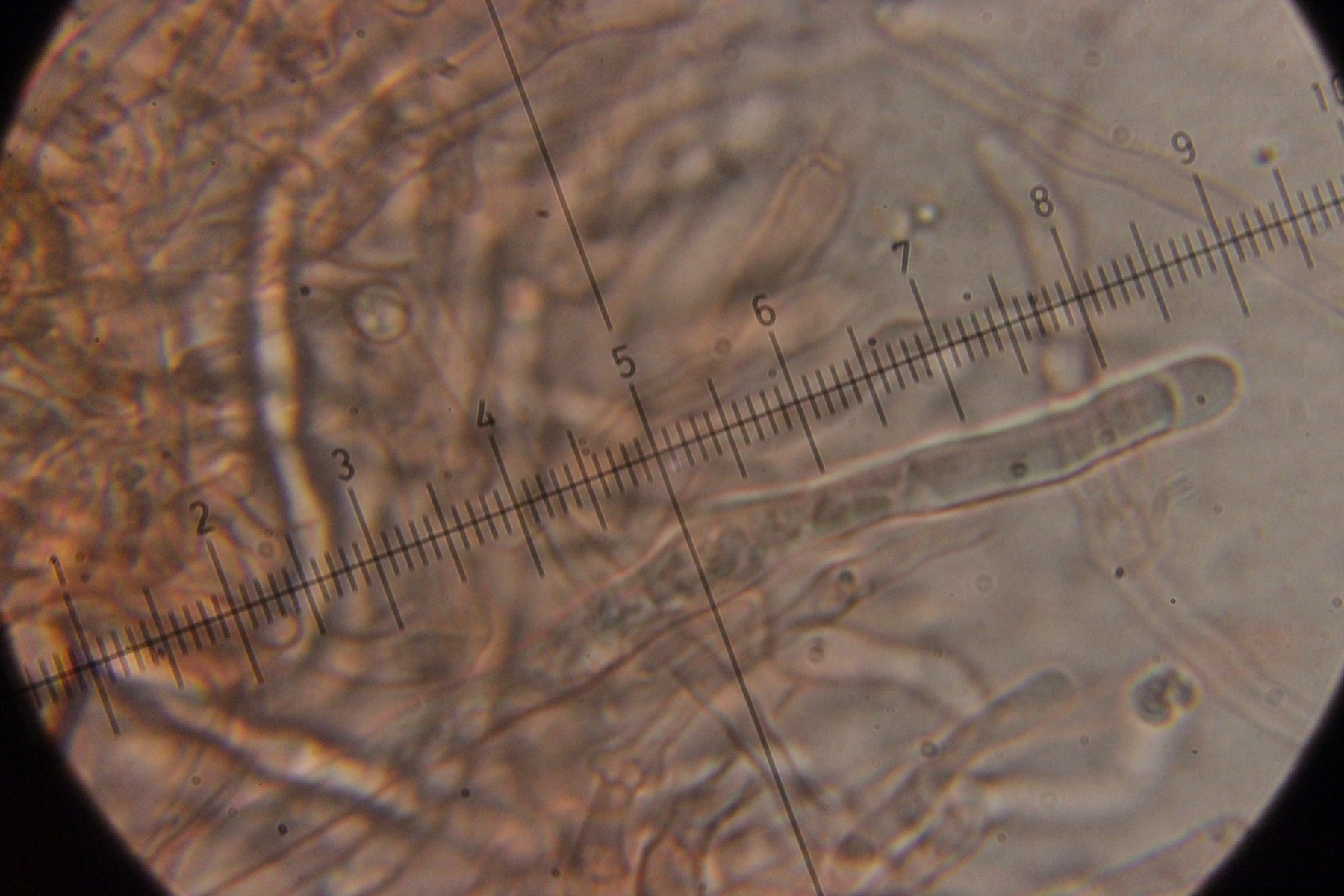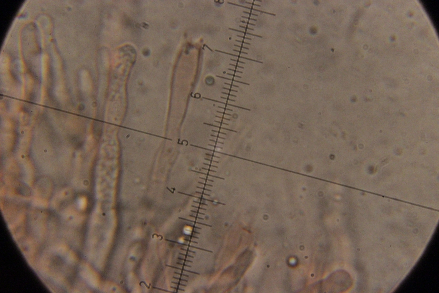 4. Auf Fraxinus. Hier weiß ich nicht so recht weiter. Die taillierte, 6-sporige Basidie läßt mich zu Sistotrema tendieren. Da gibt es aber scheinbar keine Arten mit Zystiden. Und auch sonst paßt keine der anderen 4+-sporigen Gattungen wie Botryobasidium.