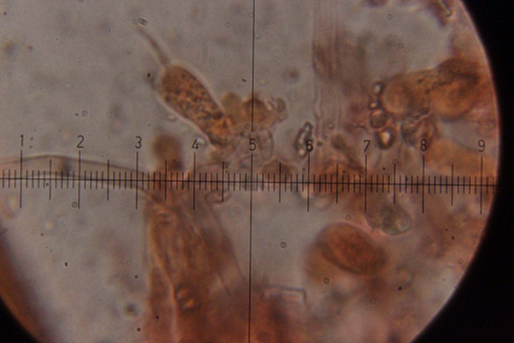 Die einzige Basidie, die ich finden konnte. Tailliert, 6-sporig. Das würde ja Richtung Sistotrema verweisen.