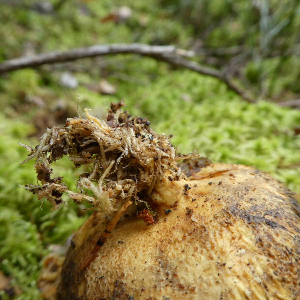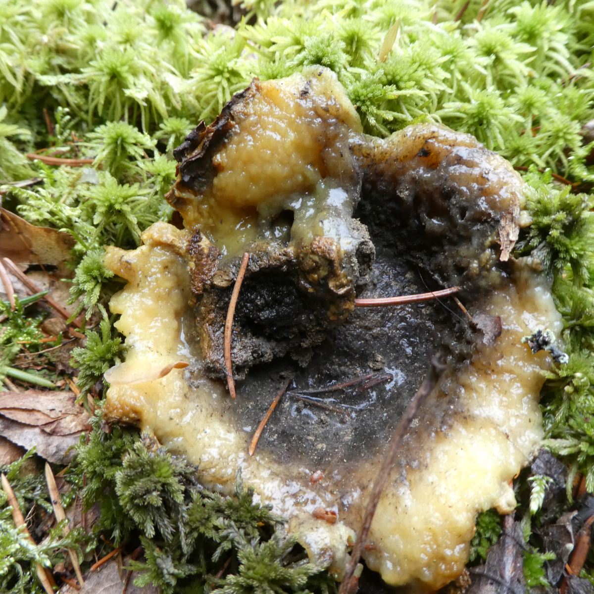 gestern fand ich an einem Baumstamm mehrere dieser Handteller-großen sehr alten und sehr weichen Pilze. Als ich sie anfasste lief mir eine intensive gelb-orange Flüssigkeit über die Finger. Der kurze Stiel war ziemlich hart, ich würde ihn als holzig beschreiben.