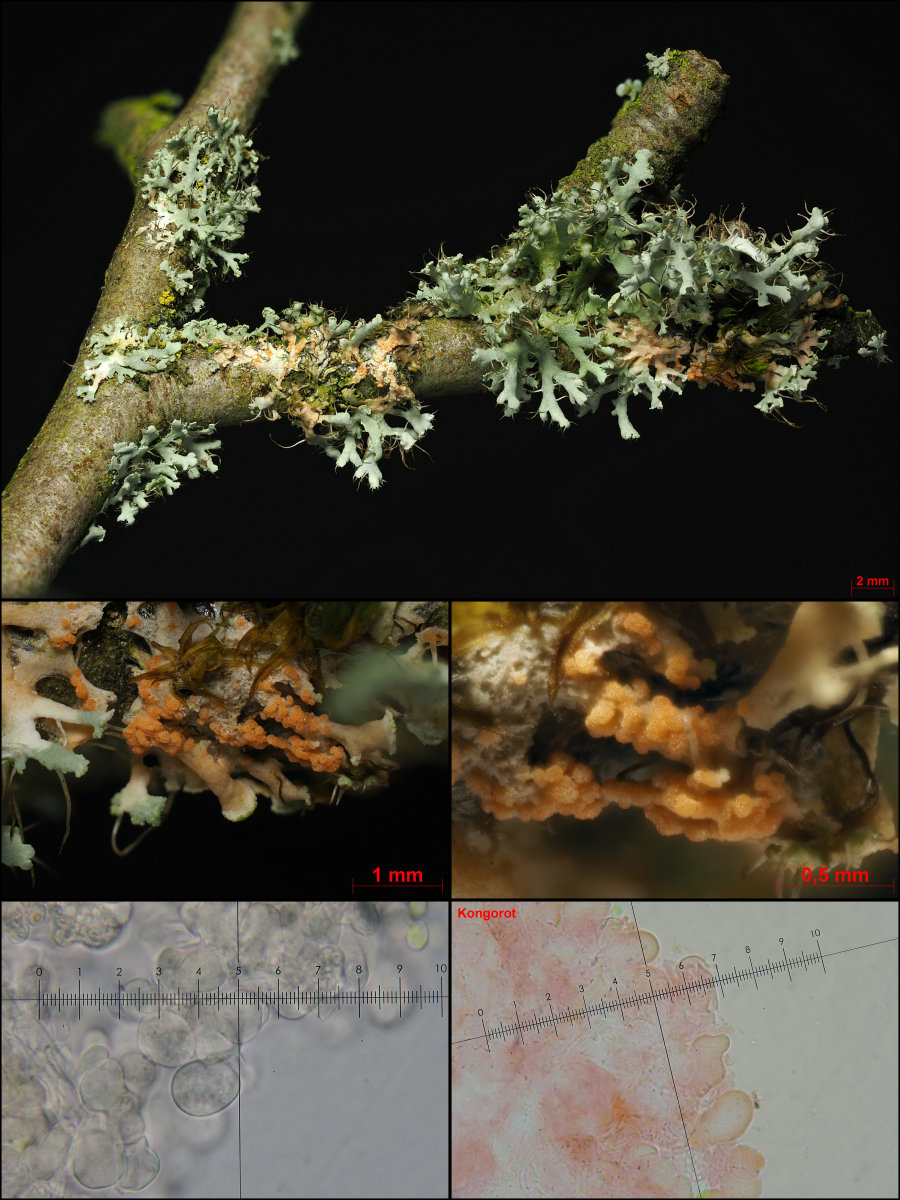In dem Fall übrigens sehr gelungen mit dem schwarzen Hintergrund, weil es den Fokus auf den zu dokumentierenden Bereich lenkt - also Zweig + Flechte + Parasit.