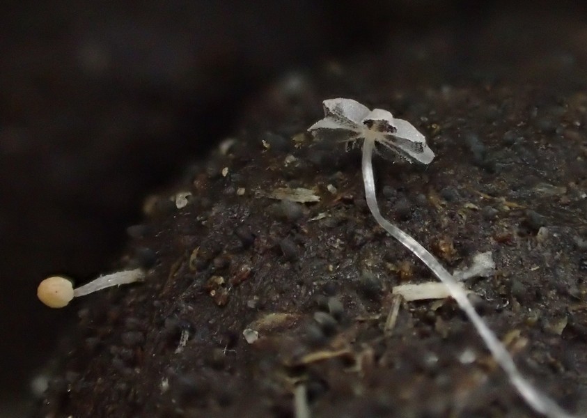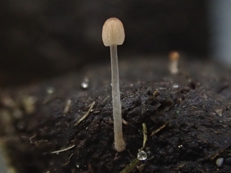Feucht gehalten und gestern und heute - also nach knapp 2 Wochen - finde ich auf den Köteln (neben etlichen von mir als Podospora vesticola geschlüsselten Pyrenos) eine ganze Anzahl kleiner Tintlinge, nicht büschelig, aber doch recht zahlreich mit gebührendem Individualabstand (was man auf den Fotos sehen kann). Die ausgebreiteten Hüte und die gelben geschlossenen Hüte wachsen dicht beieinander, ich denke daß es sich um dieselbe Art handelt.