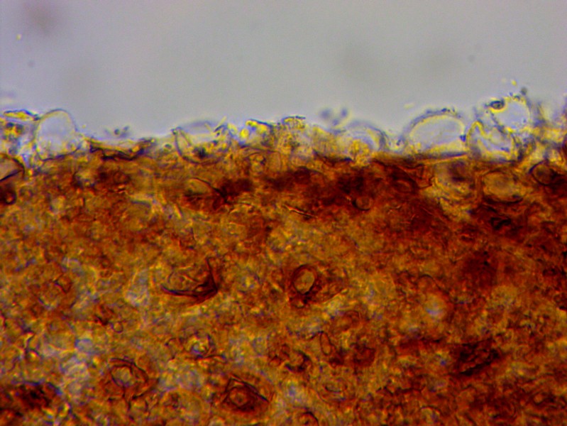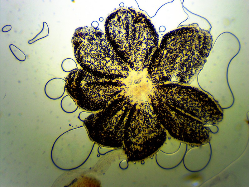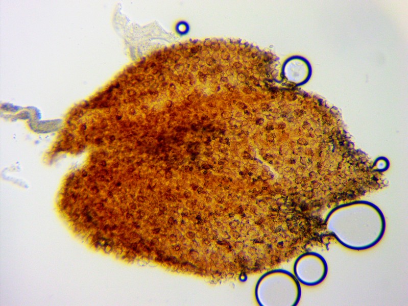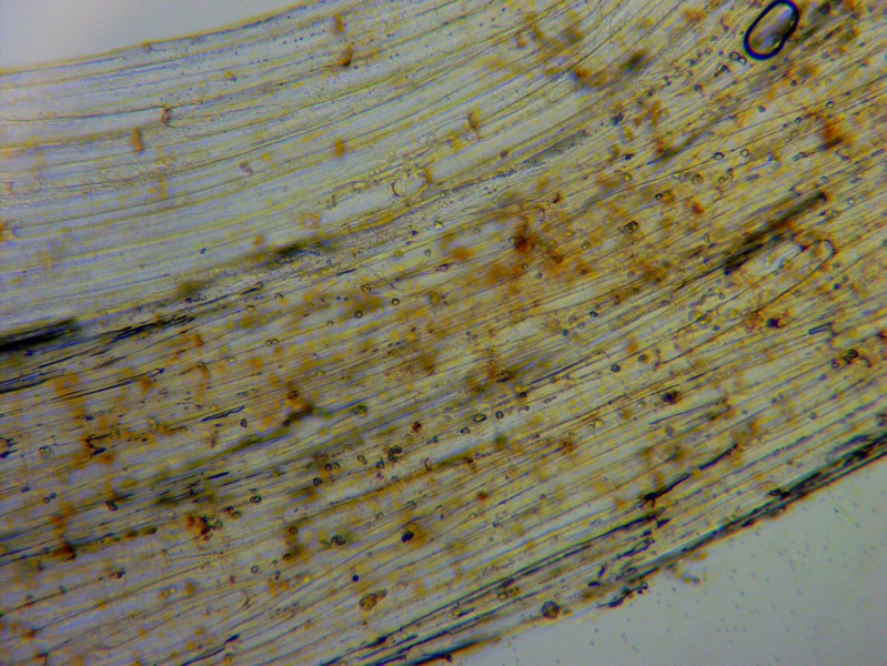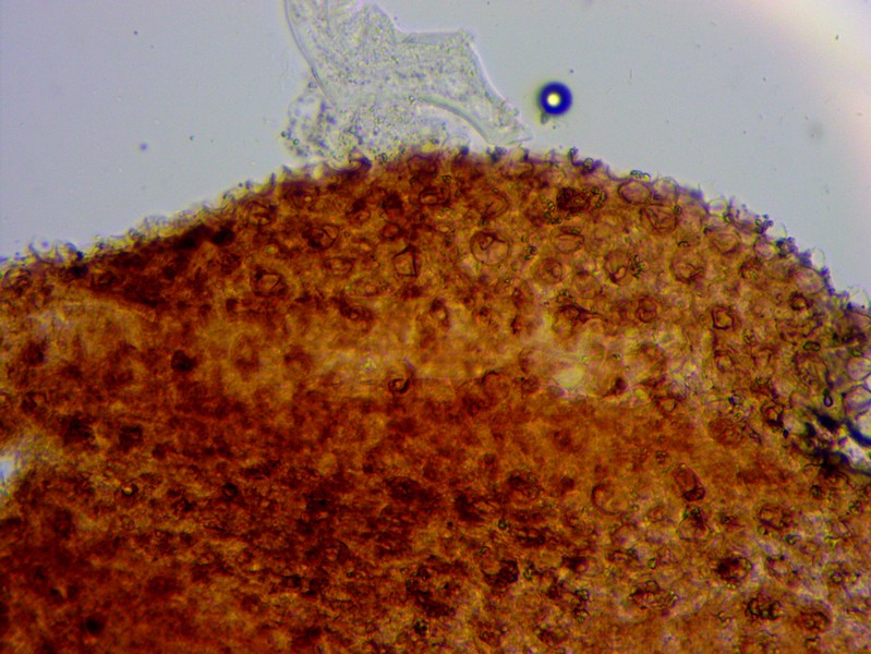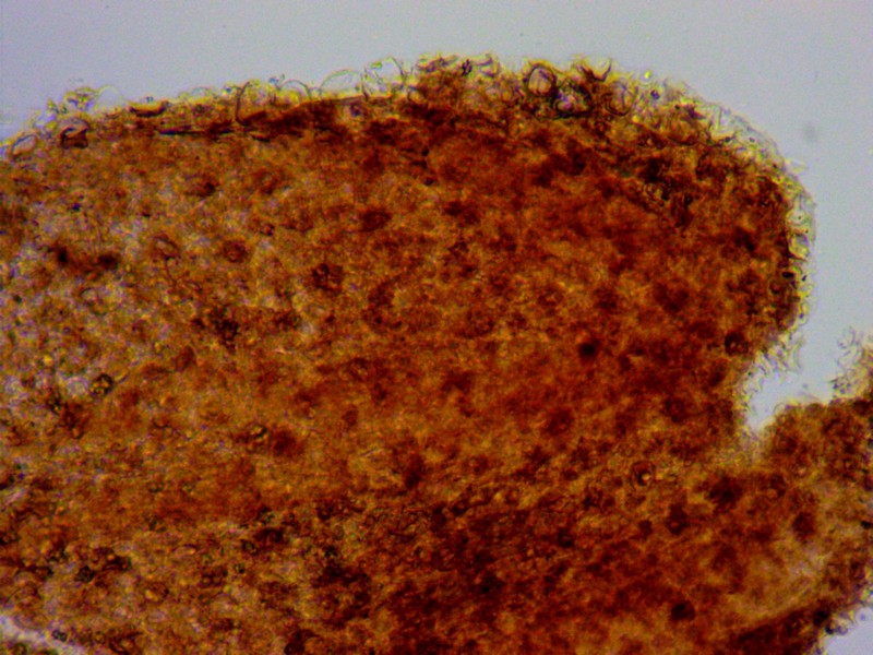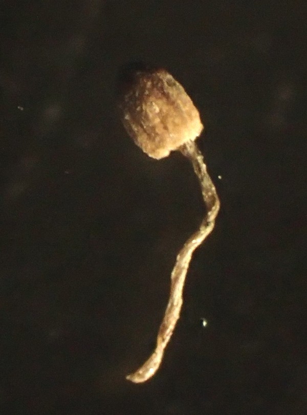 Bei den gelben Hüten wird der ganze Pilz ca 4 mm hoch, die ausgebreiteten haben einen lägeren Stiel, der dann aber oft am Substrat aufliegt. Der Stiel (unten ein Foto 200x) ist weiß bis glasig und zumindest bei den jungen (gelbhütigen) Exemplaren weiß gefastert (sieht man auf den Bildern). Der Hut reißt blumenartig auf, erreicht dabei 1,5- 2 mm Durchmesser, unter dem Hut sind ca 9 dicke Lamellen (vielleicht eher Stege). Wo man auch hinschaut, coprinustypisch überall alles voller Sporen. Die sind dunkelbraun, um 10-11 x 5-7(x8) µ groß und zeigen manchmal einen Keimporus.