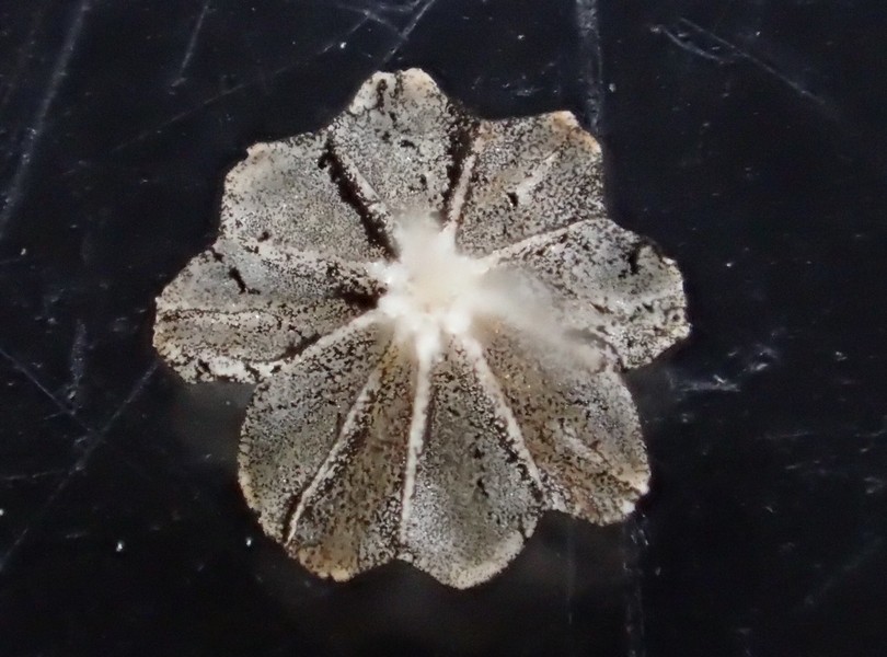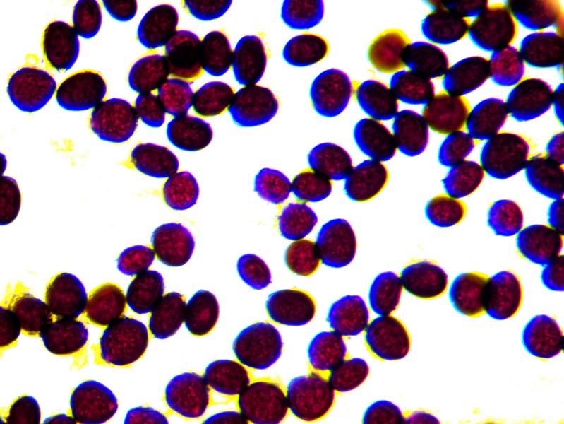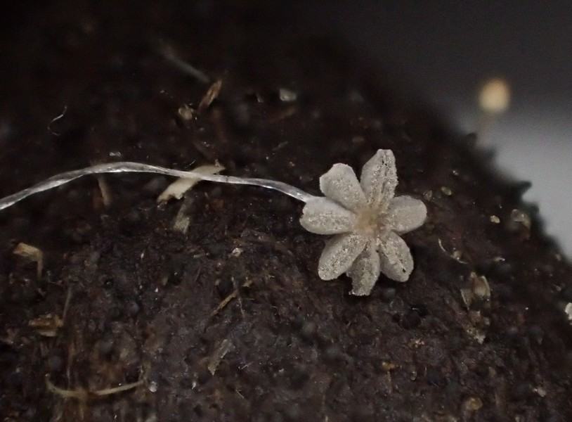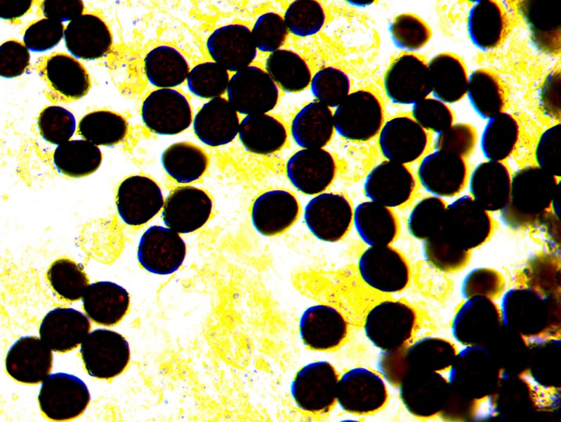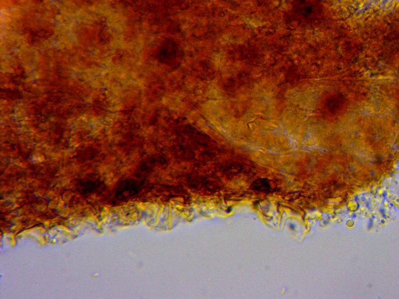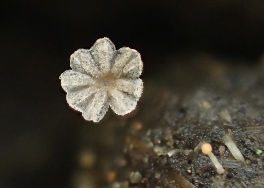 Bei den gelben Hüten wird der ganze Pilz ca 4 mm hoch, die ausgebreiteten haben einen lägeren Stiel, der dann aber oft am Substrat aufliegt. Der Stiel (unten ein Foto 200x) ist weiß bis glasig und zumindest bei den jungen (gelbhütigen) Exemplaren weiß gefastert (sieht man auf den Bildern). Der Hut reißt blumenartig auf, erreicht dabei 1,5- 2 mm Durchmesser, unter dem Hut sind ca 9 dicke Lamellen (vielleicht eher Stege). Wo man auch hinschaut, coprinustypisch überall alles voller Sporen. Die sind dunkelbraun, um 10-11 x 5-7(x8) µ groß und zeigen manchmal einen Keimporus.