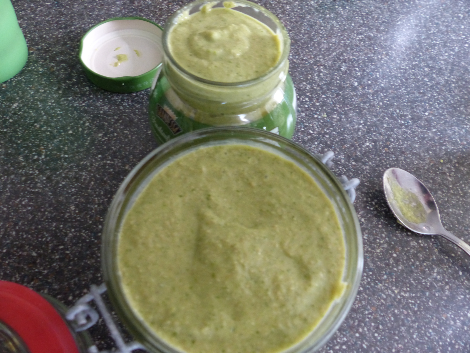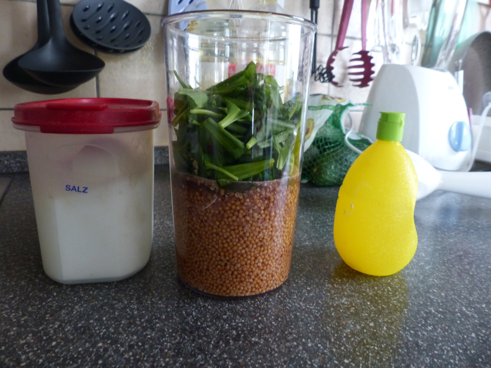 Also hab ich das Rezept auf 75g Senfkörner umgerechnet (mehr war nicht da), Senfkörner über Nacht mit Wasser, Essig, Zitronensaft und auch schon einigen Gewürzen eingeweicht und heute morgen dann den Pürierstab geschwungen! Rucola dazu, weiterpüriert, weiterpüriert, weiterpüriert (mein Pürierer ist alt und lahm), und, tadaaaa, mein erster selbstgemachter Senf ist fertig! ==Gnolm16