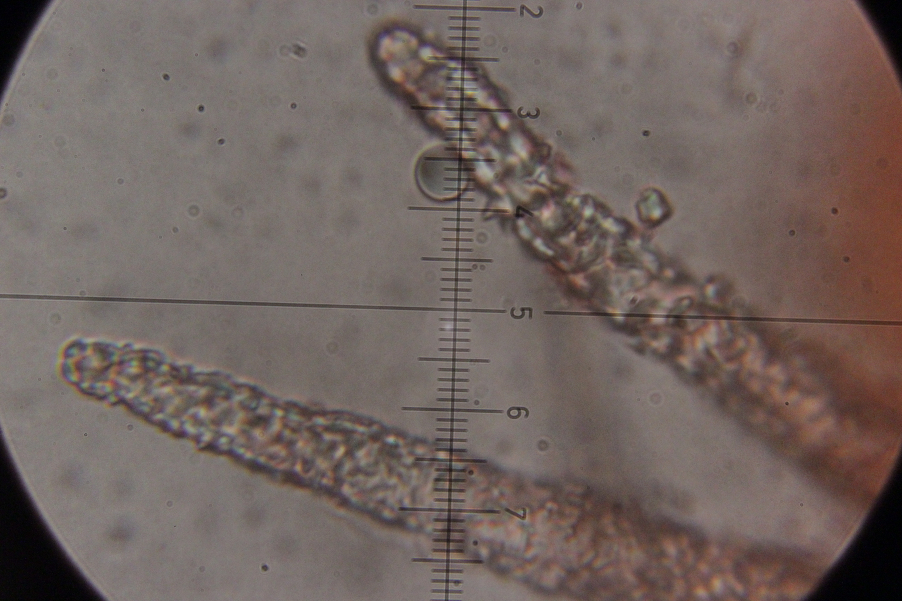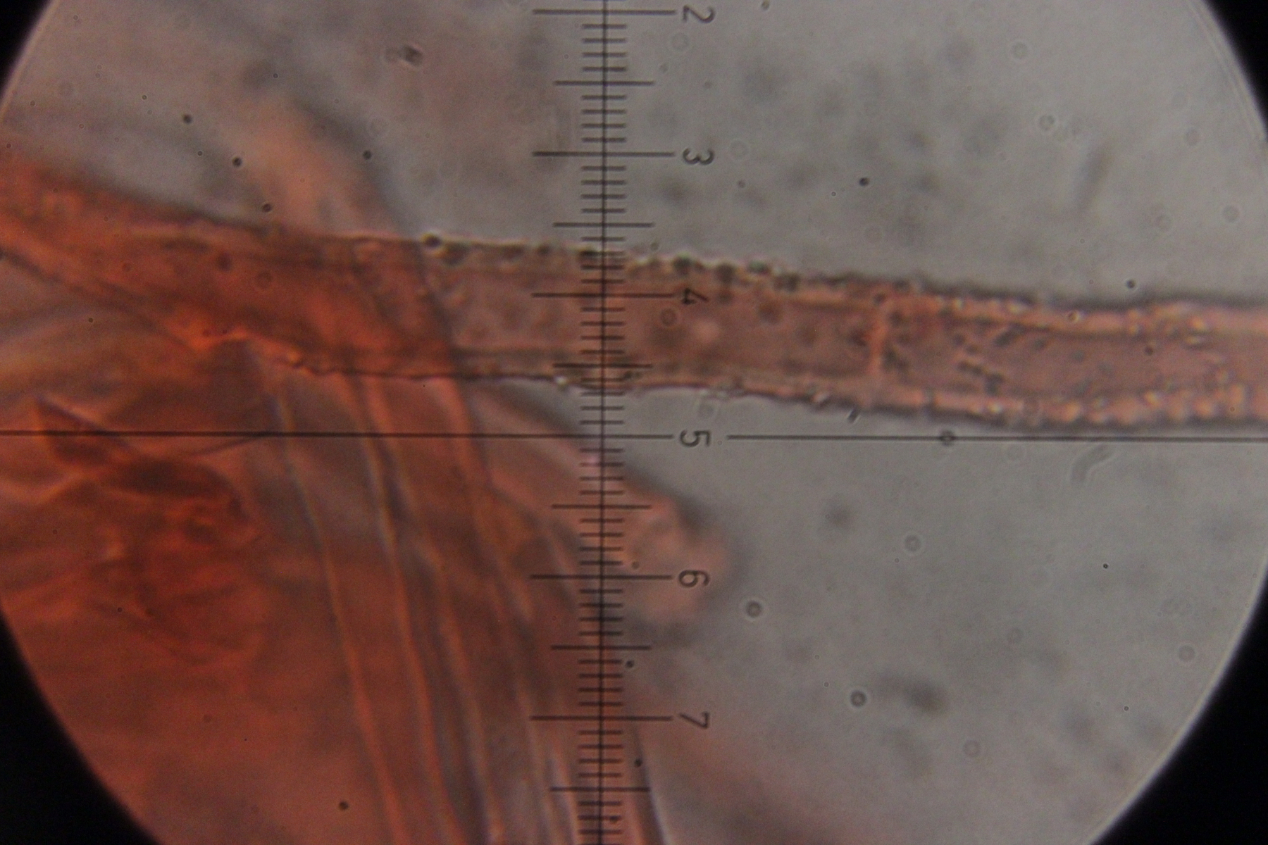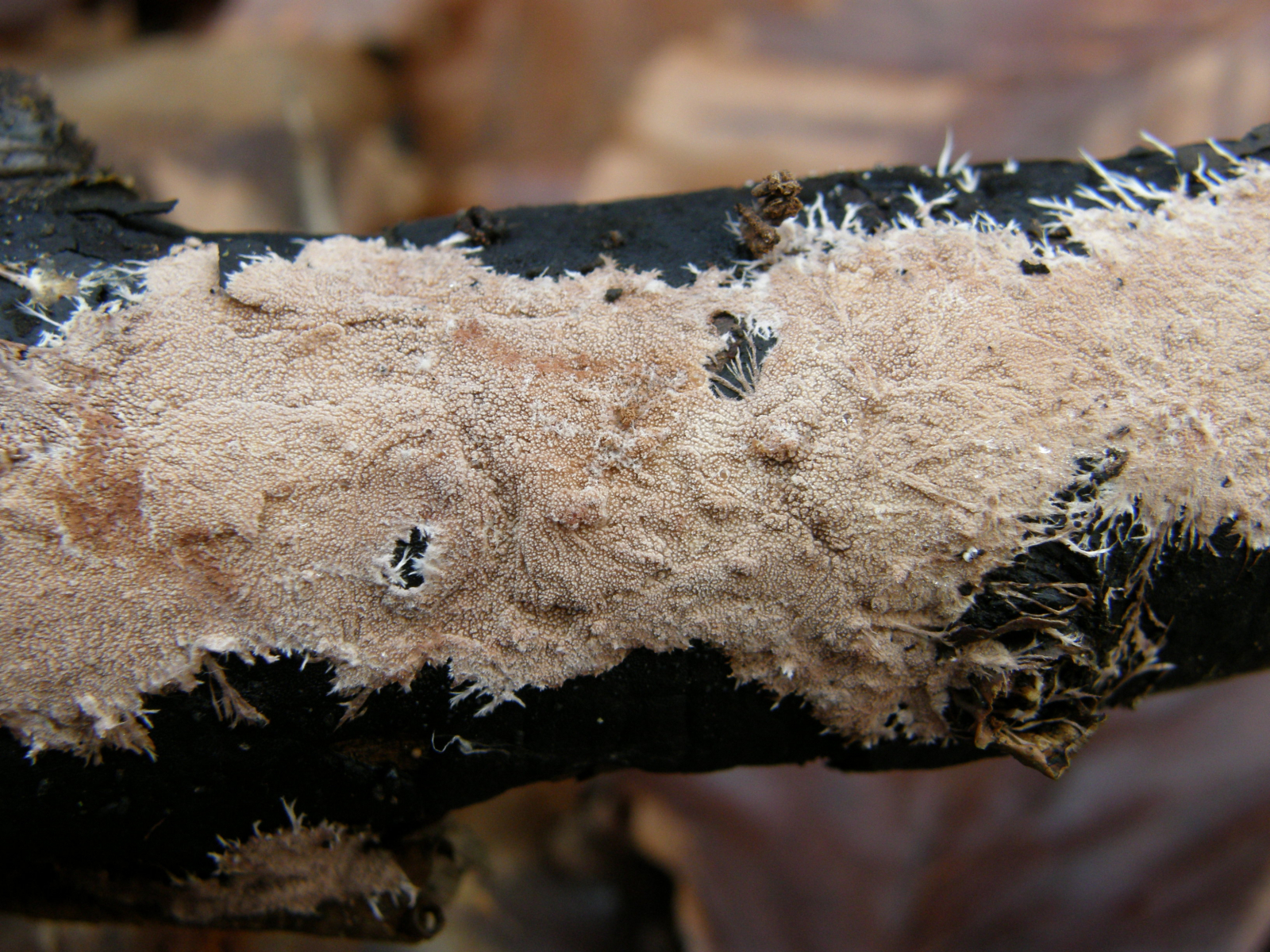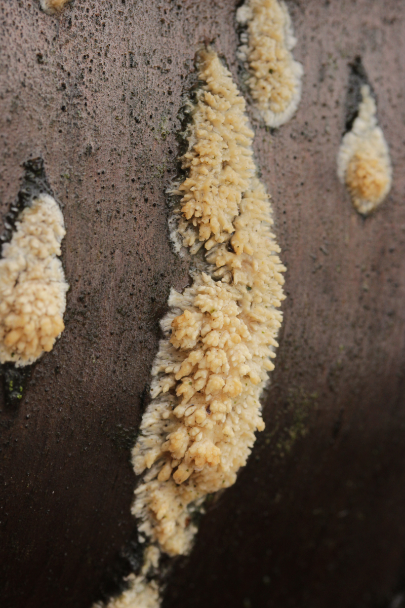 12. Unbekannter Rindenpilz auf Laubholz. Insgesamt etwas unschön in der mikroskopischen Handhabung. Auffällig sind dicke, kristallbesetzte Zystiden und Hyphen ohne Septen, die ich als Skeletthyphen interpretieren würde. EDIT: Ich würde zu Steccherinum fimbriatum tendieren.