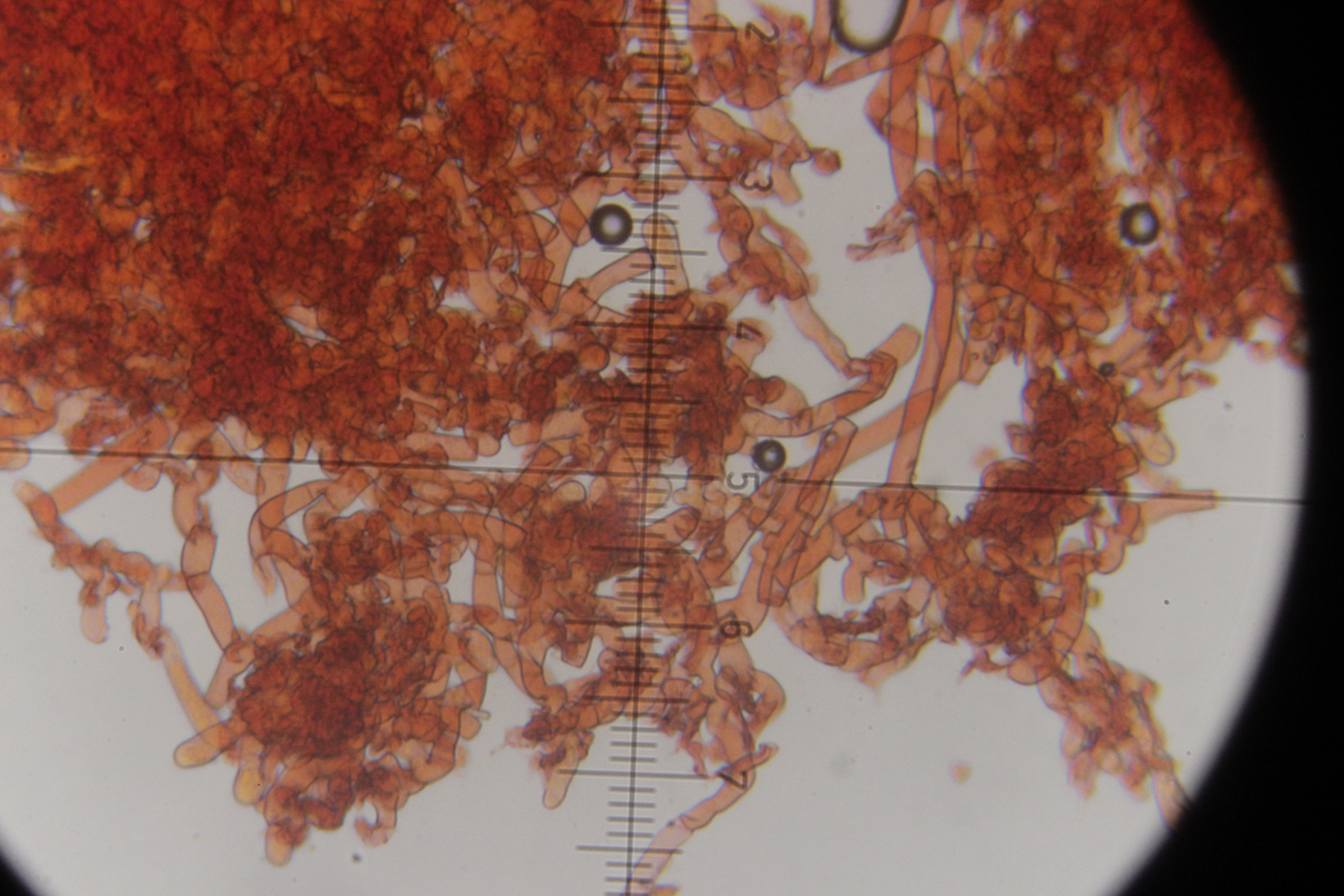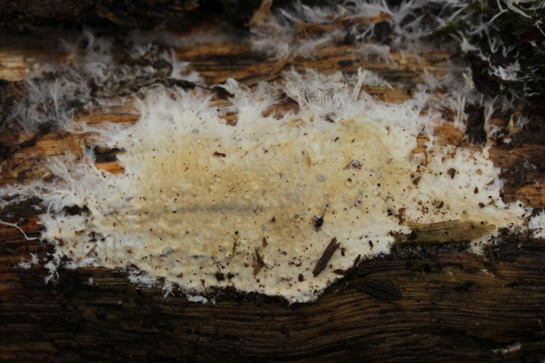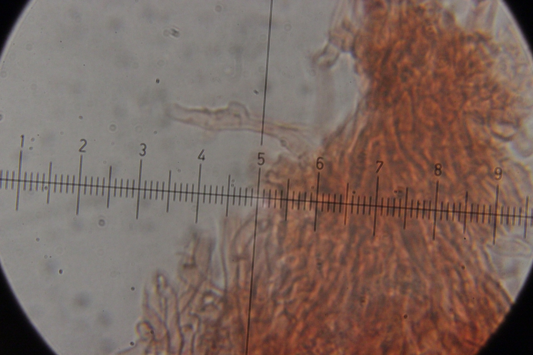 12. Unbekannter Rindenpilz auf Laubholz. Insgesamt etwas unschön in der mikroskopischen Handhabung. Auffällig sind dicke, kristallbesetzte Zystiden und Hyphen ohne Septen, die ich als Skeletthyphen interpretieren würde. EDIT: Ich würde zu Steccherinum fimbriatum tendieren.