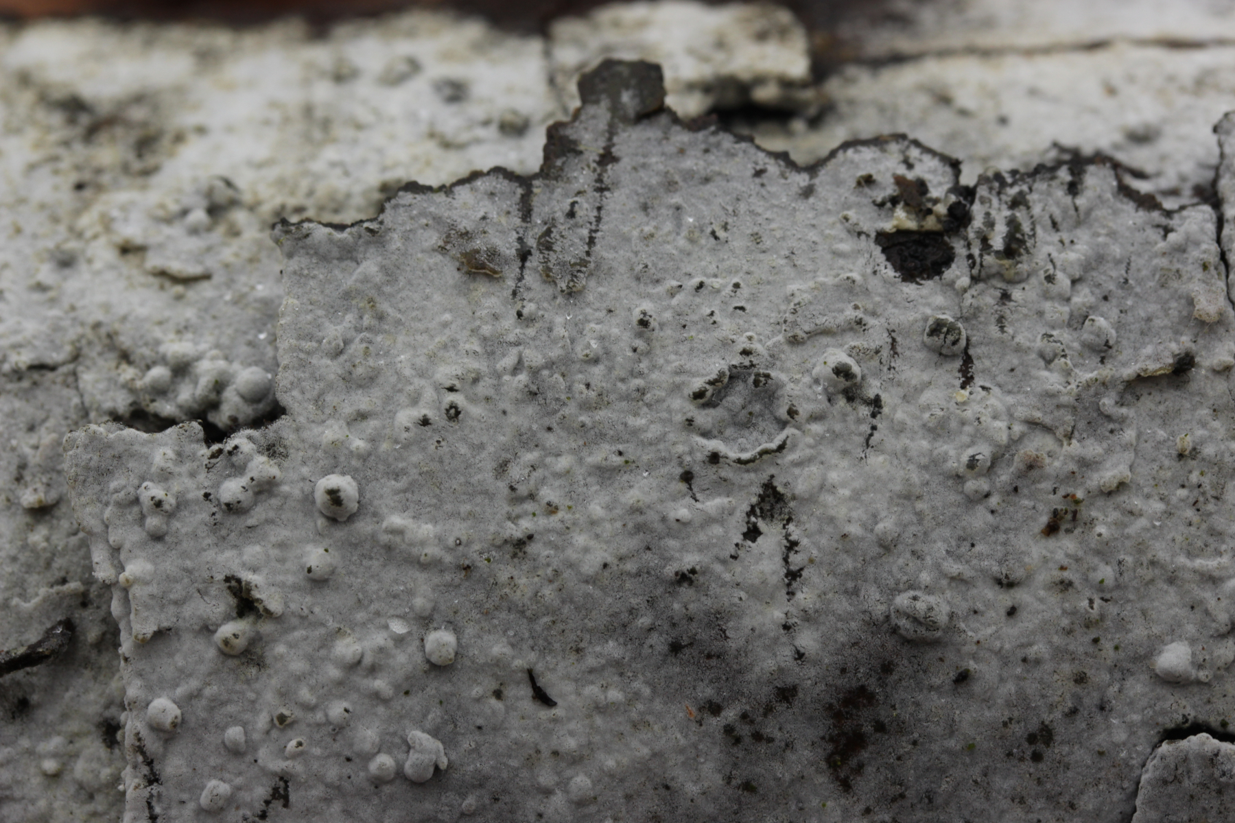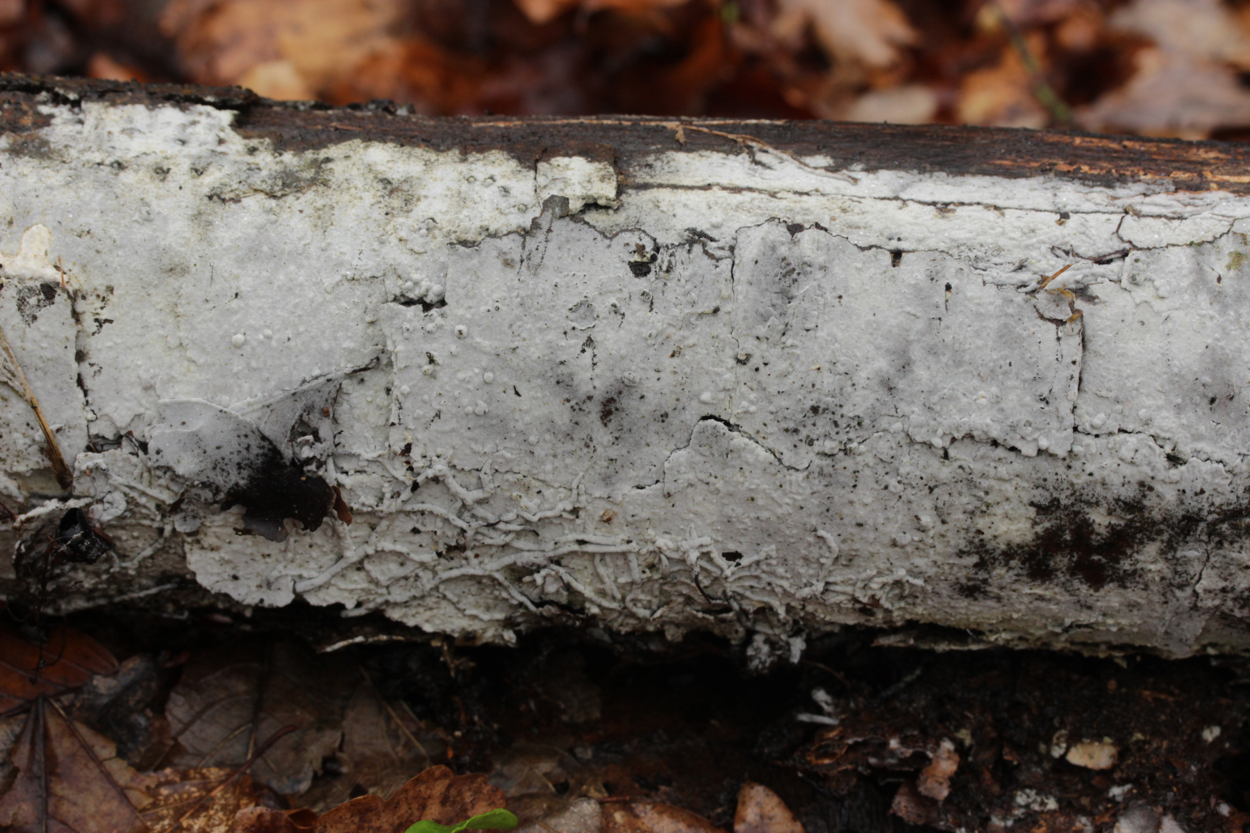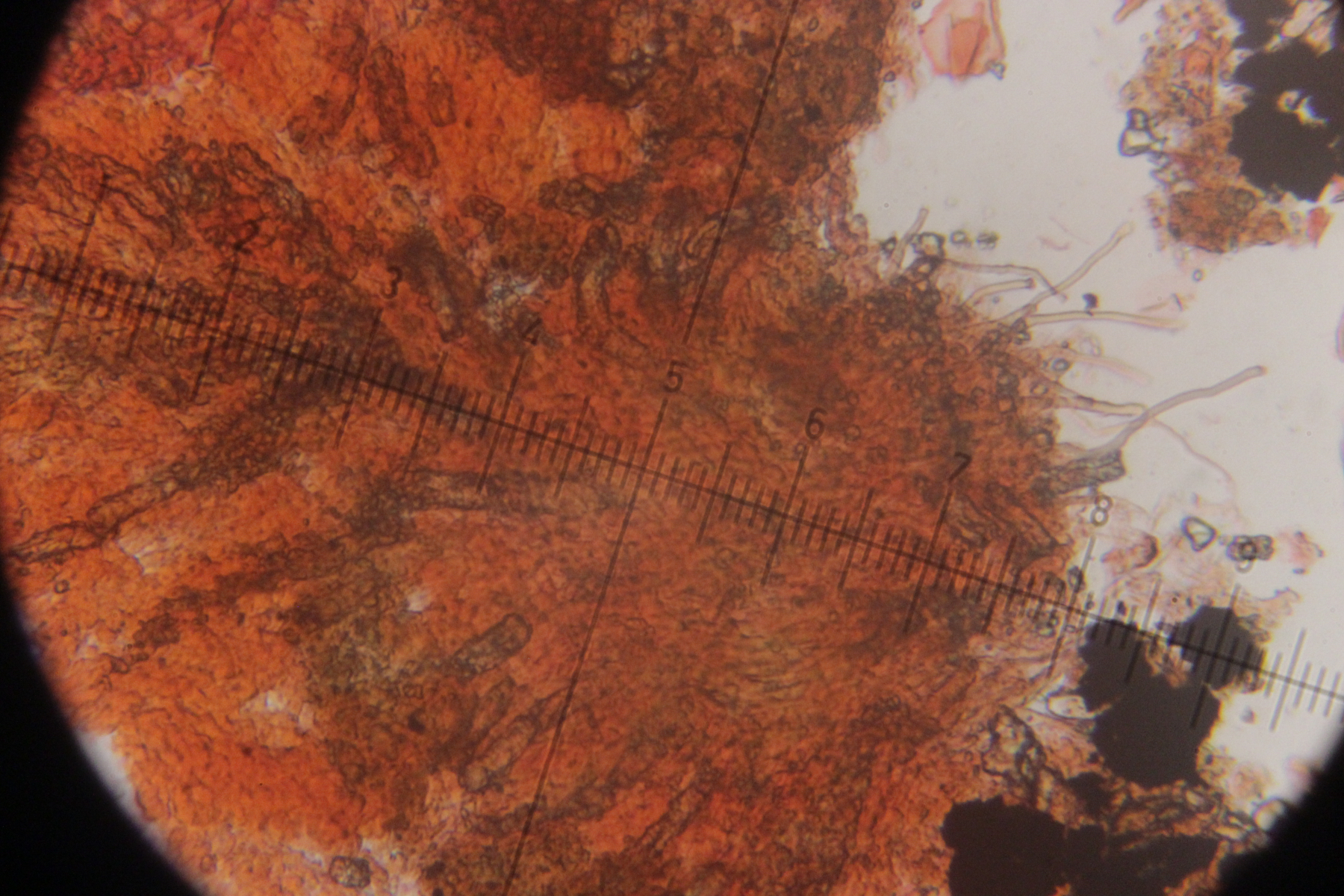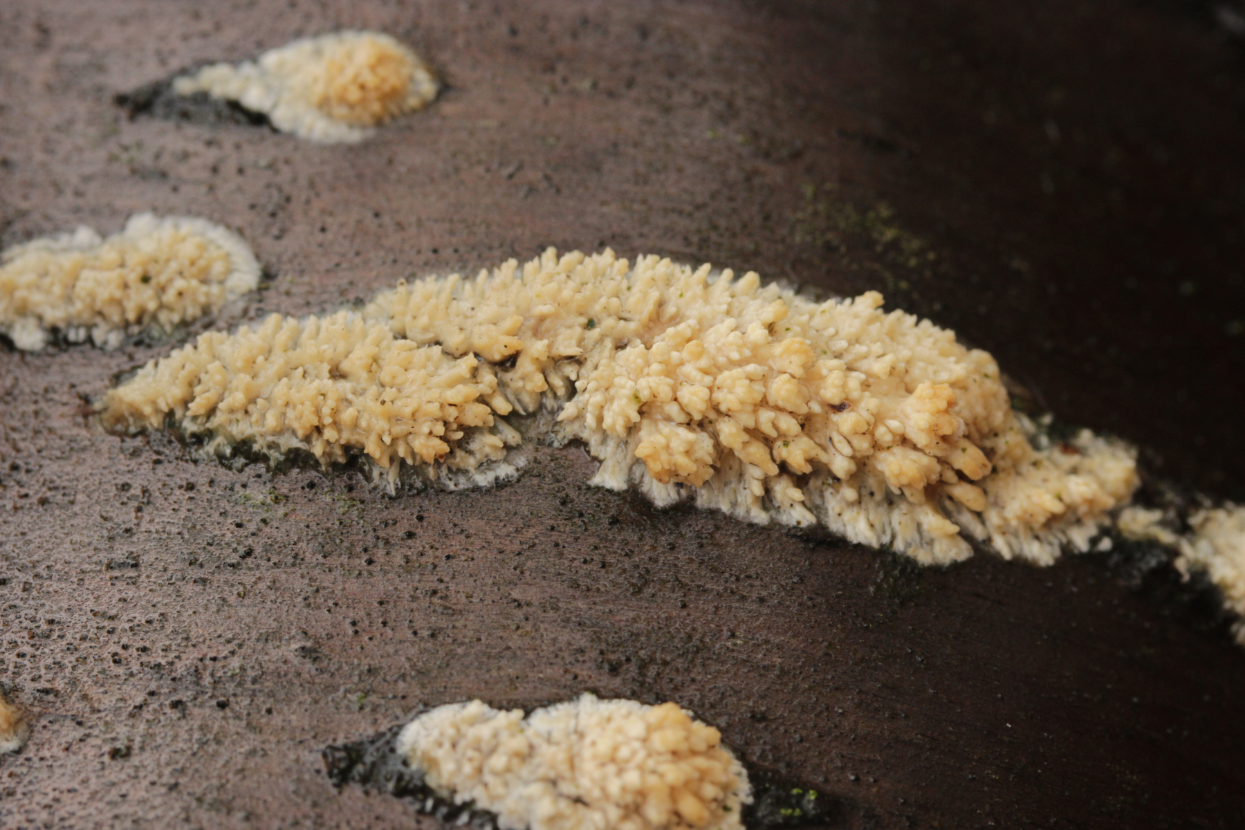 12. Unbekannter Rindenpilz auf Laubholz. Insgesamt etwas unschön in der mikroskopischen Handhabung. Auffällig sind dicke, kristallbesetzte Zystiden und Hyphen ohne Septen, die ich als Skeletthyphen interpretieren würde. EDIT: Ich würde zu Steccherinum fimbriatum tendieren.